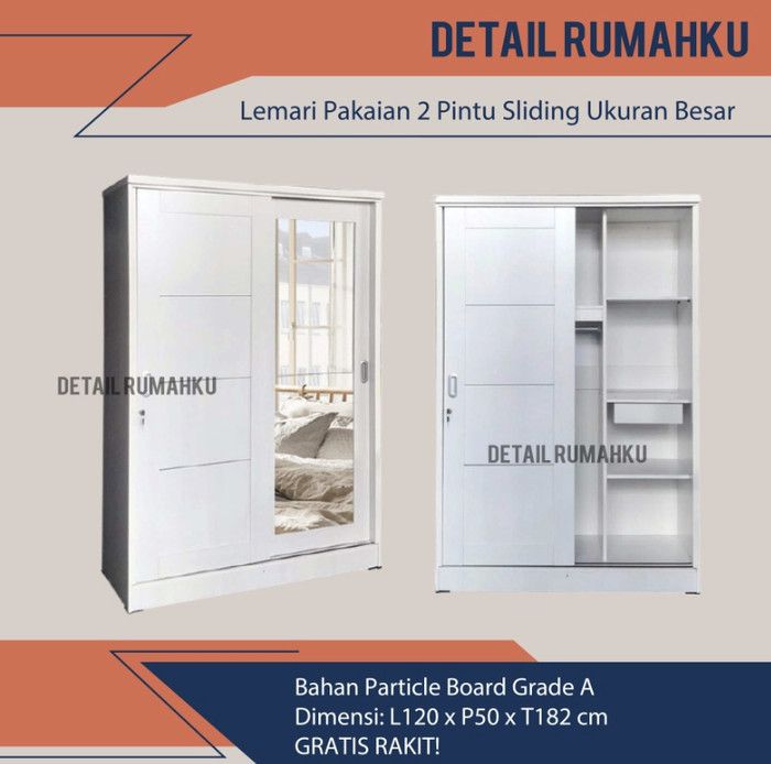 Lemari Lemari Pakaian 2 Pintu Sliding Geser Putih Partikel Minimalis - SWING PUTIH
