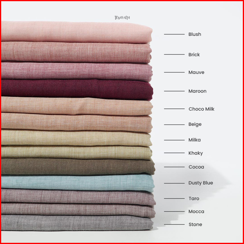 Beige, Blush, Brick, Choco Milk, Cocoa, Dusty Blue, Khaky, Maroon, Mauve, Milka, Mocca, Stone, Taro