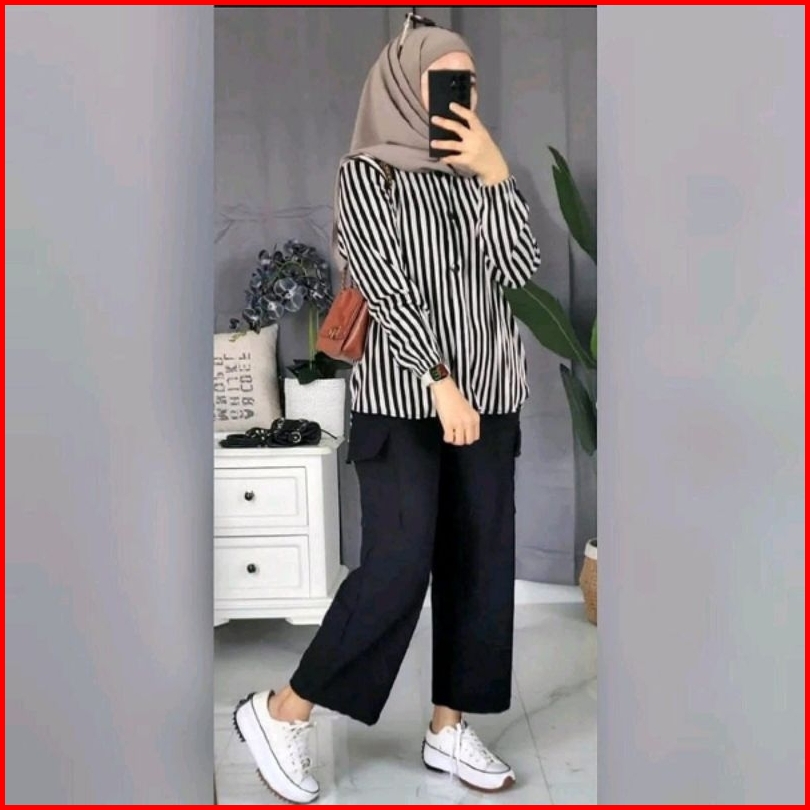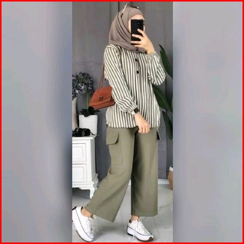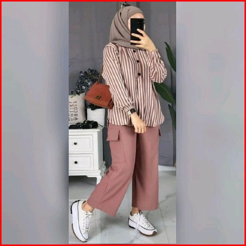 One Set Ramosa Setelan Rayon Wanita Motir Salur Celana Cargo Panjang