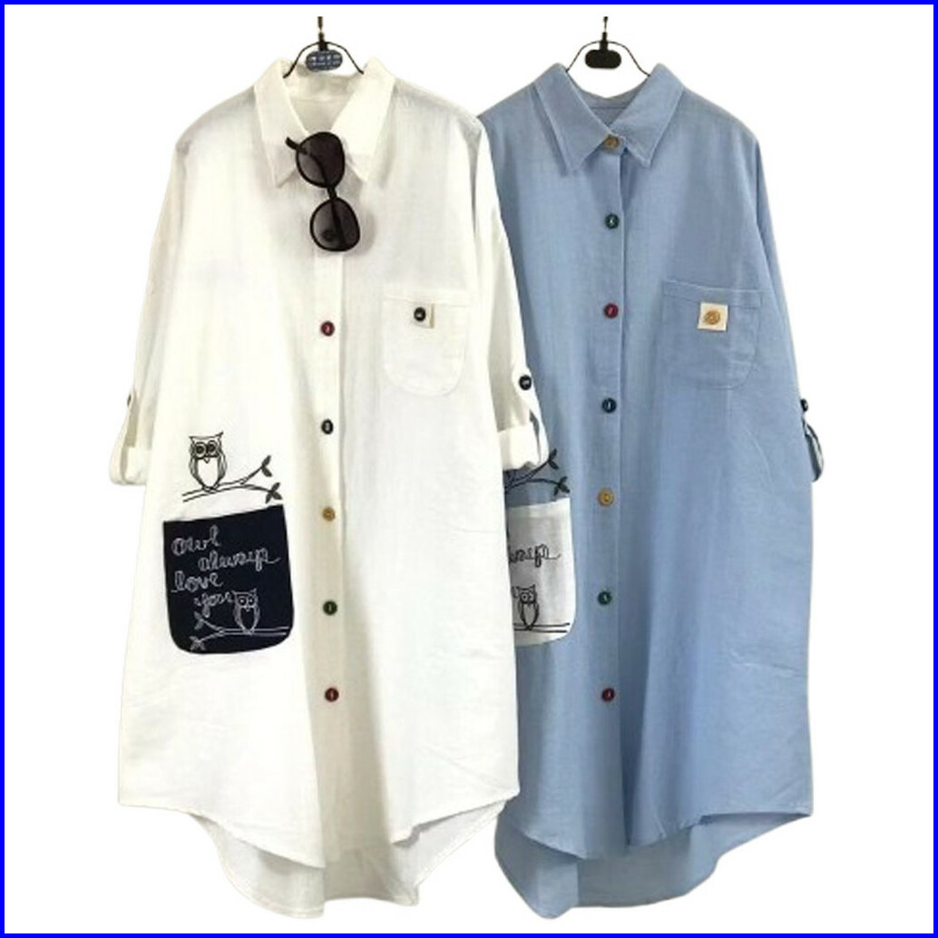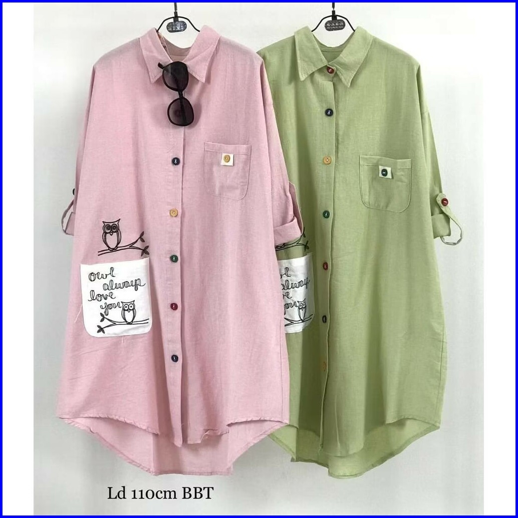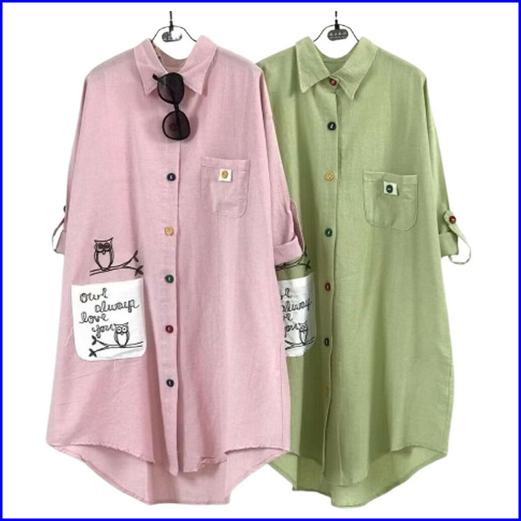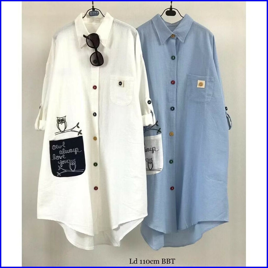 Vallina Outfit - Owl Long Tunik Patch Pocket Wanita Muslim Matt Cringkle Premium Ootd Casual Daily