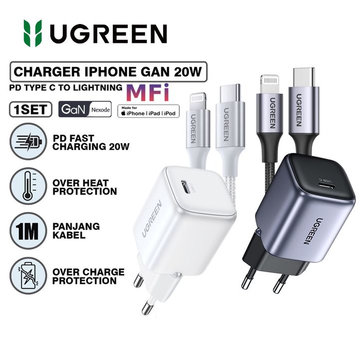 CHARGER IPHONE UGREEN FOR XR 11 12 13 14 MFI PD TYPE C TO LIGHTNING FAST CHARGING 20W GAN CASAN KABEL