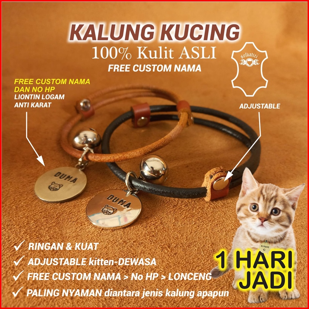 Kalung Kucing Nama Custom Free Lonceng Untuk Kitten Dan Kucing Dewasa Model Tali Kulit Asli