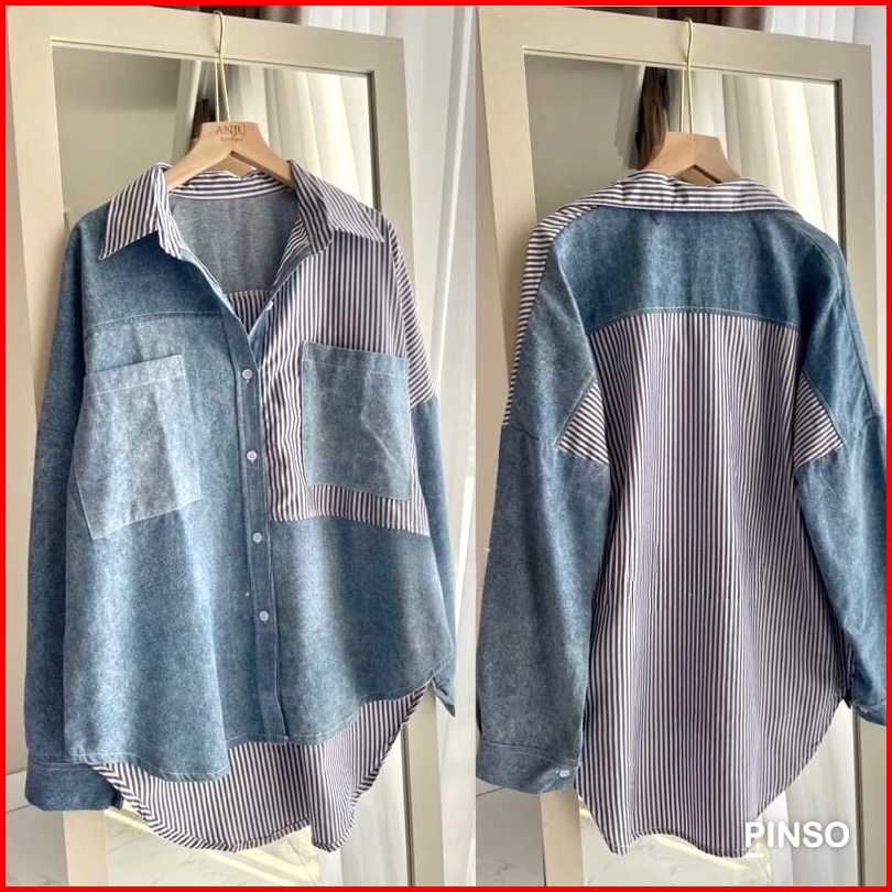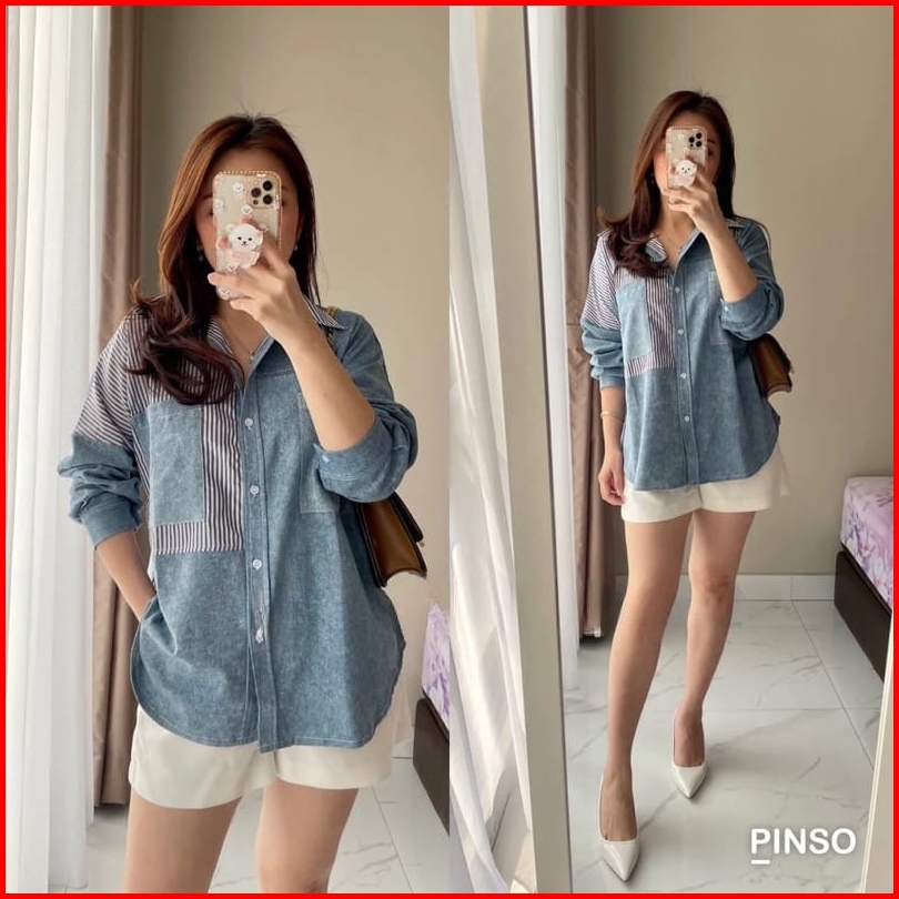 Uxuclo Kemeja Matt Denim Snow Acid Kombinasi Katun Striped Lengan Panjang Kemeja Denim Jeans Wanita Lengan Panjang Kemej