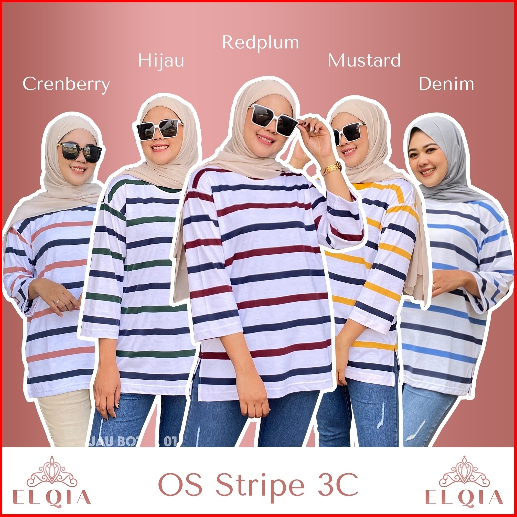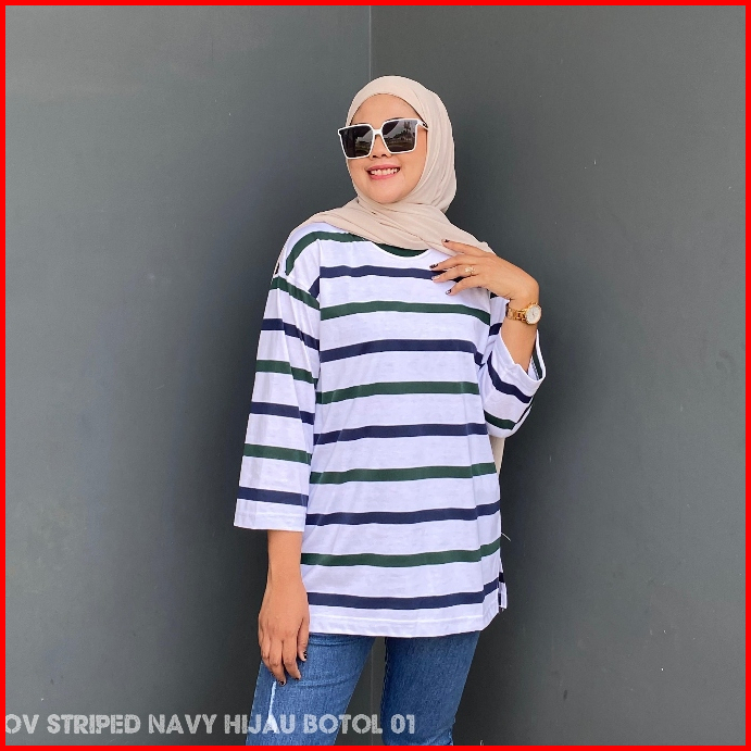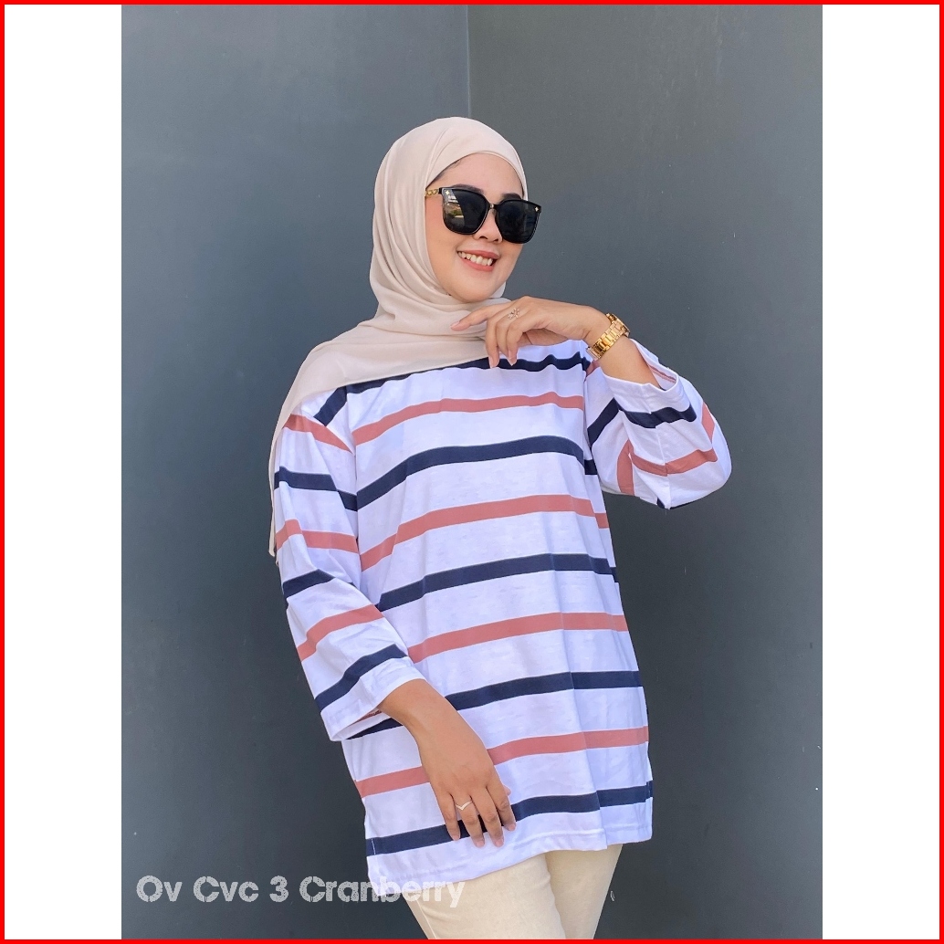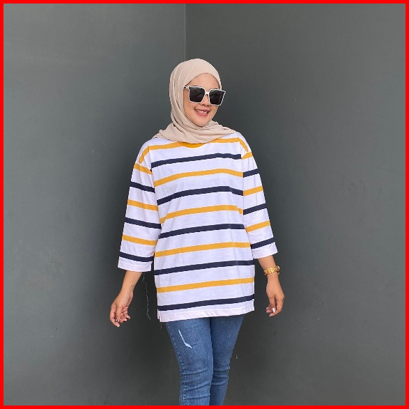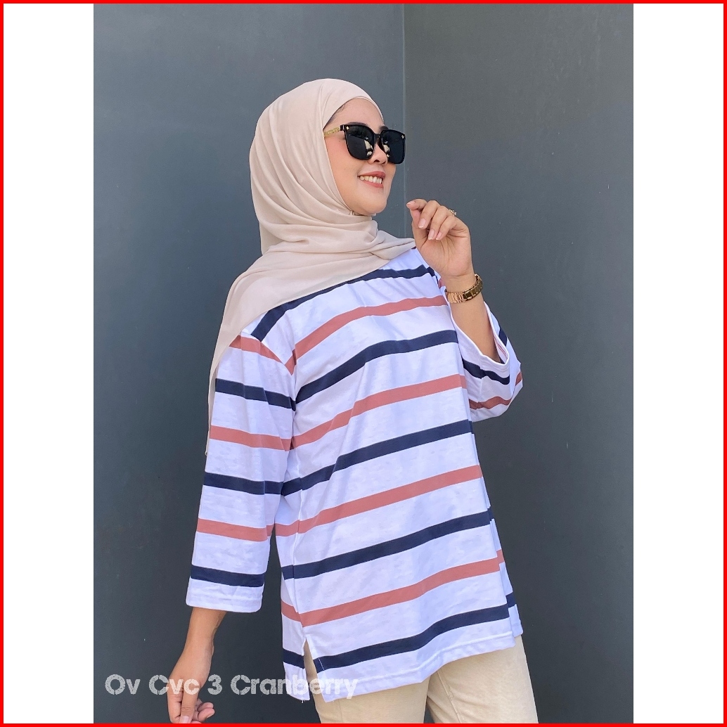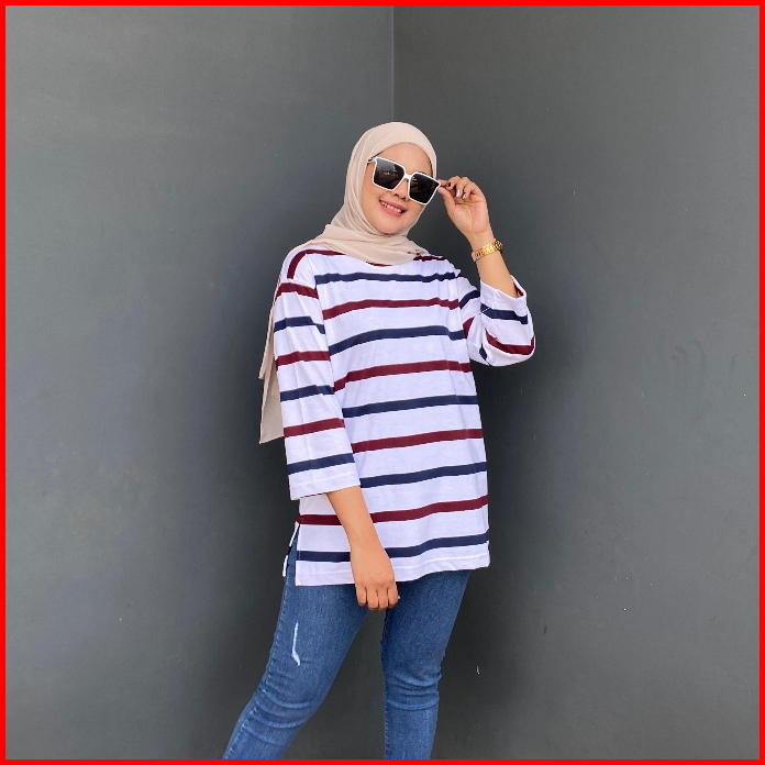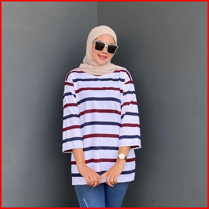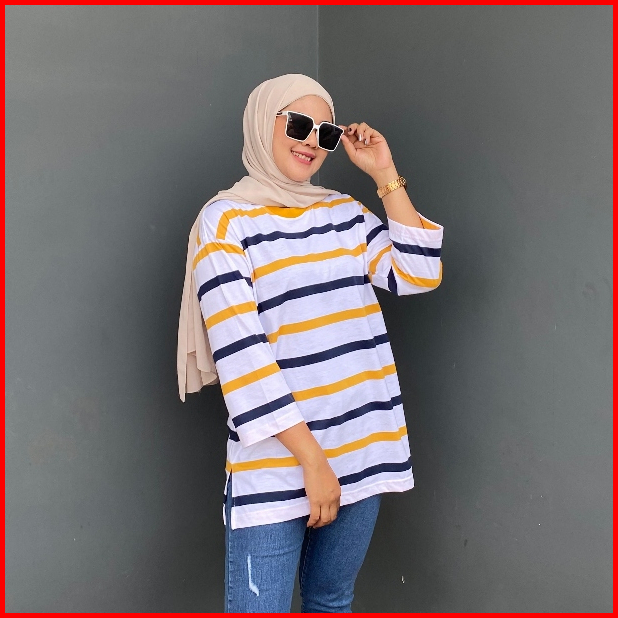 Kaos Aldira Oversize Wanita Trendy Stripe Casual Atasan T-shirt Lengan 7 8