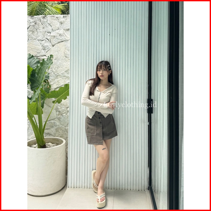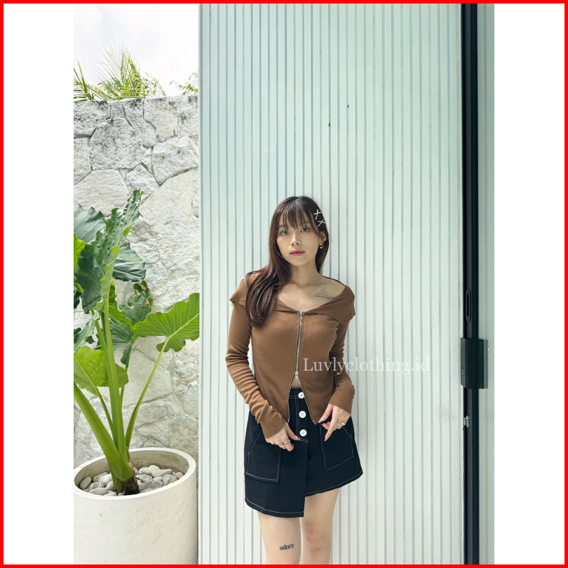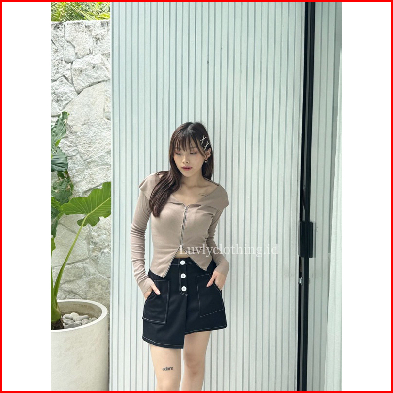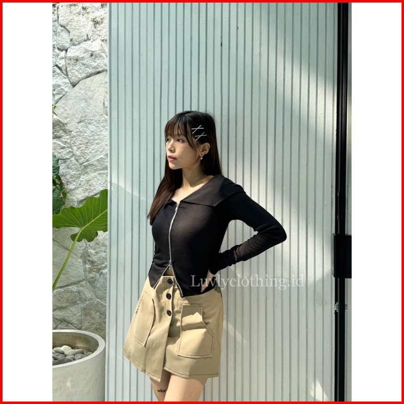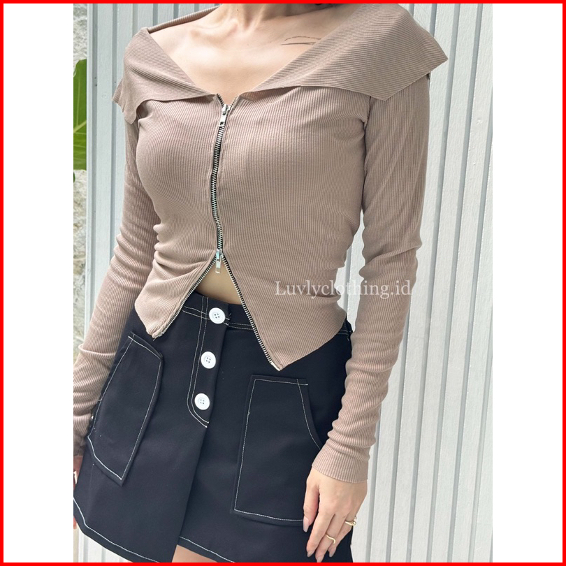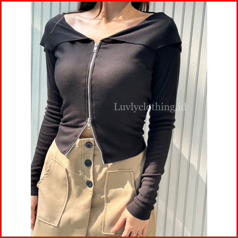 Luvlyclothing.id Sazy Top Crop Top Zipper Rib Knit Long Sleeve Atasan Blouse Wanita Sleting Lengan Panjang Polos Basic T