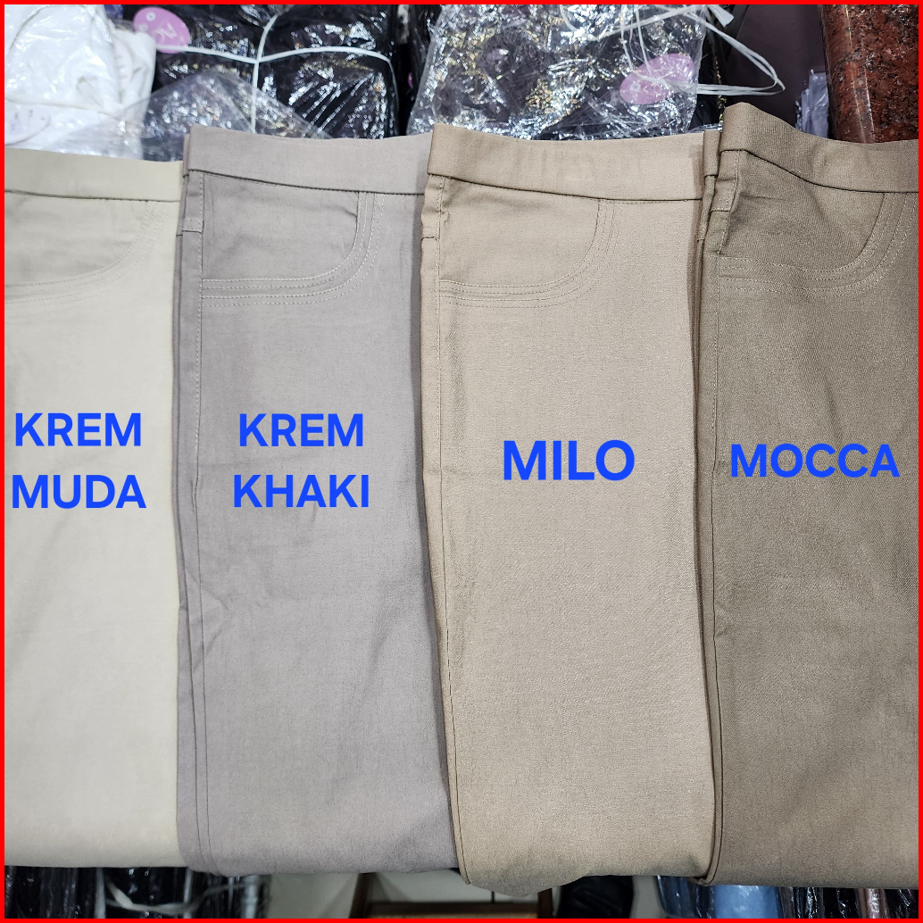 Hitam, Putih, Abu Muda, Abu Tua, Jeans Muda, Jeans Tua, Biru Navy, Krem Ivory, Krem Muda, Mocca (Giordano), Cokelat Muda, Cokelat Tua, Milo, Krem Khaki