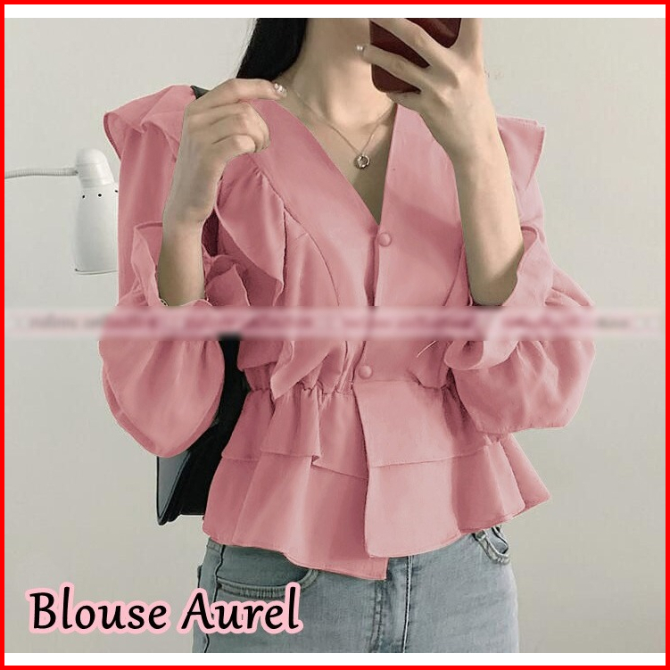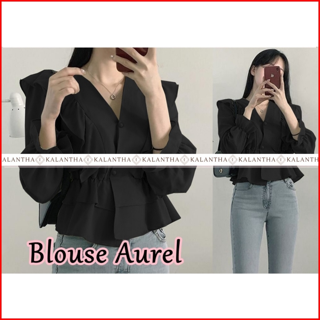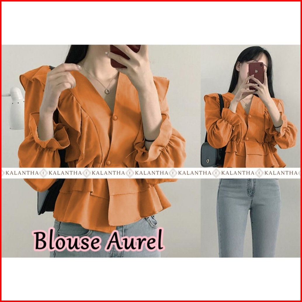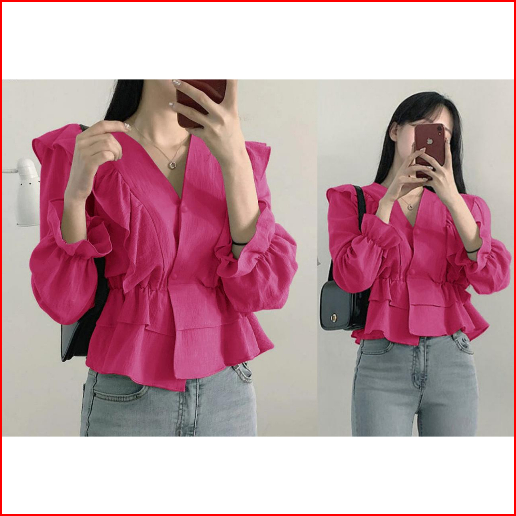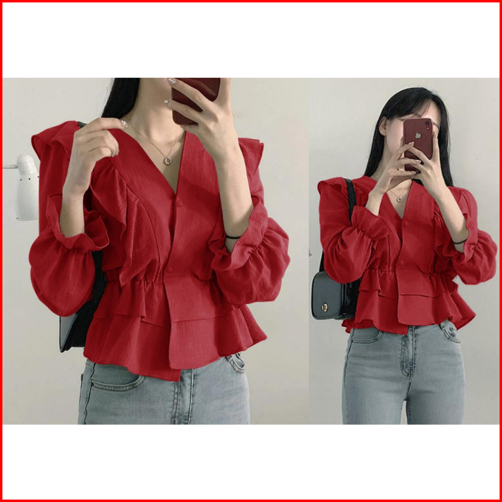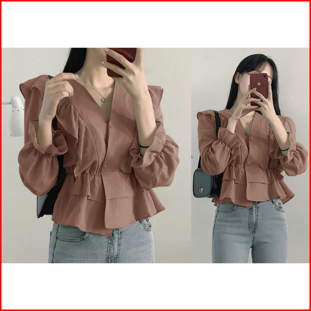 Kalantha Fashion Lily Blouse Atasan Wanita Model Ruffle V Neck Casual Top Ala Korea Atasan Wanita Lengan Panjang Terbaru