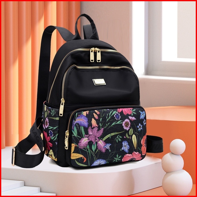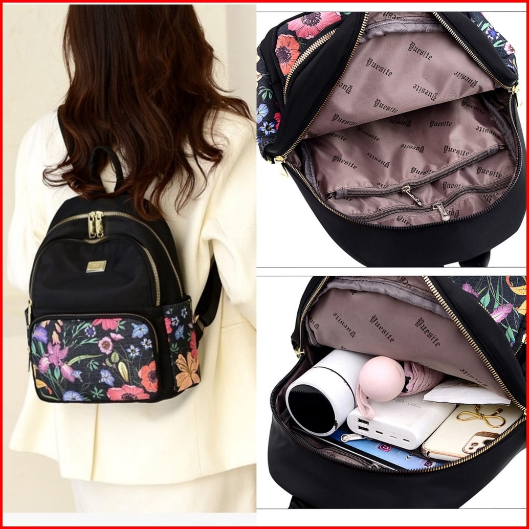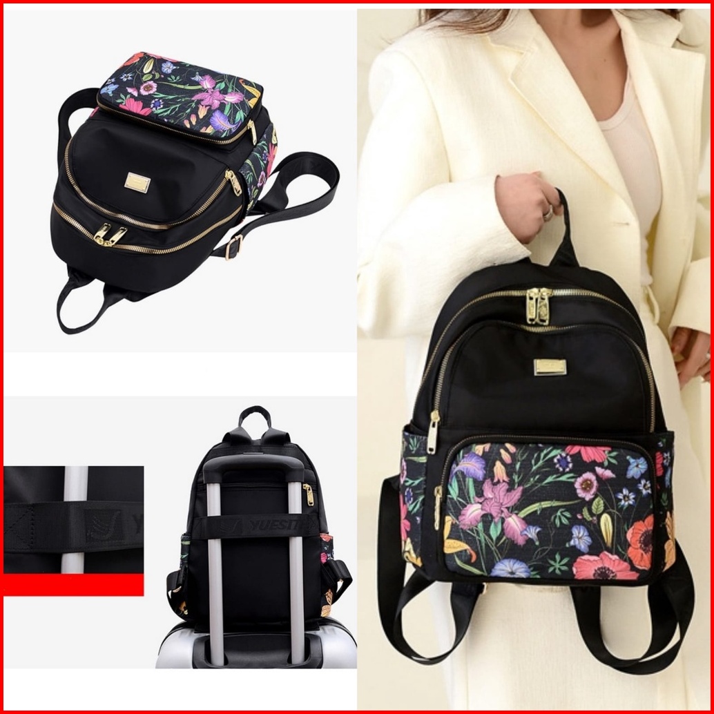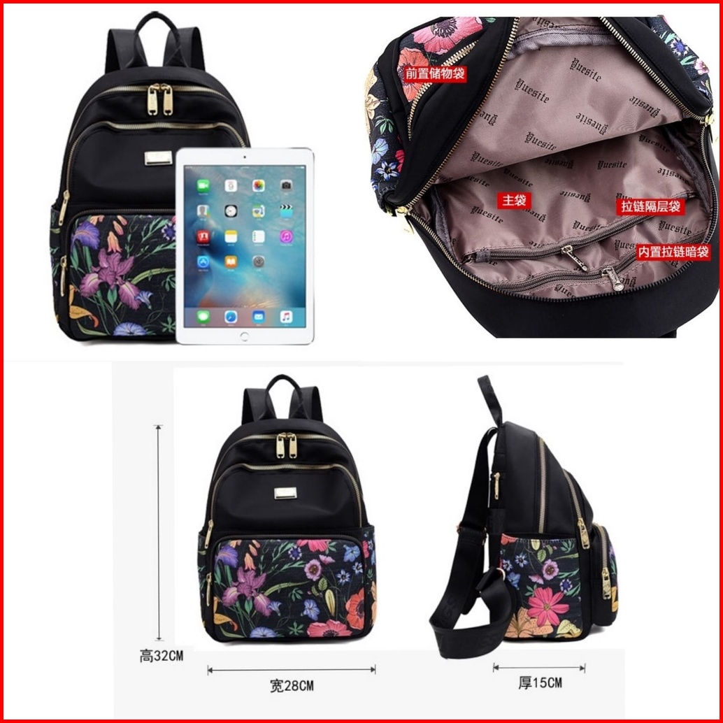 Tas Ransel Lumbia Wanita 3 Resleting Anti Air Motif Bunga Hitam Ta573b5 Backpack Cewek Korea Gendong Punggung Sekolah Ku