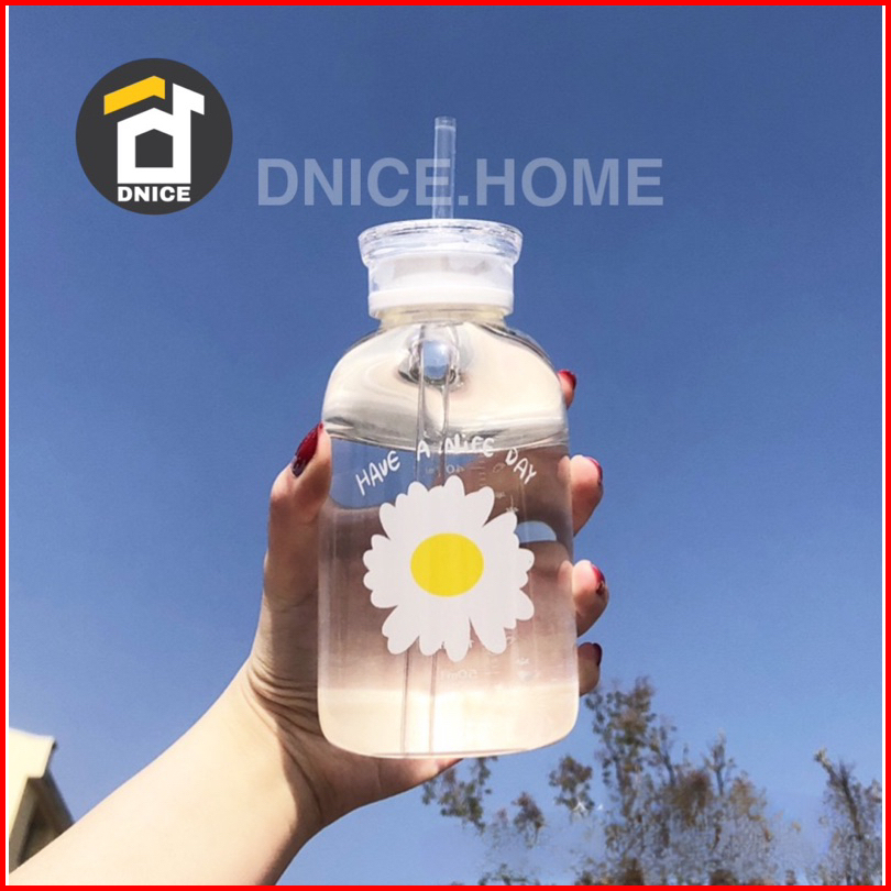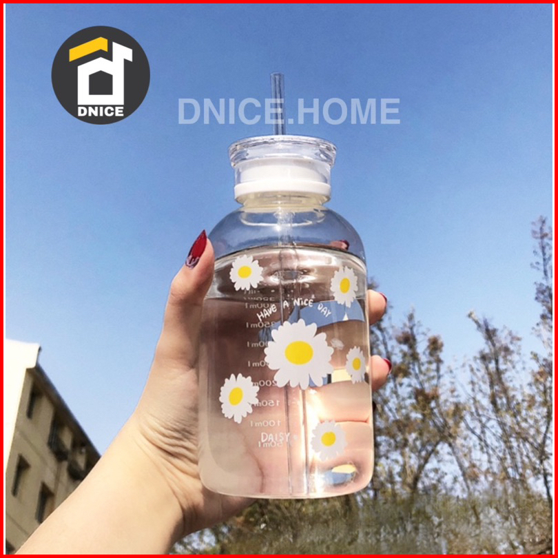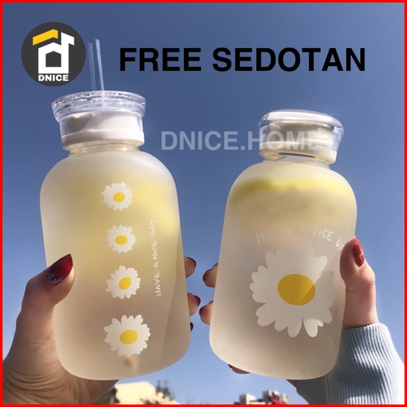 Botol Minum Kaca Daisy Korea 480ml 2 Tutup Free Sedotan