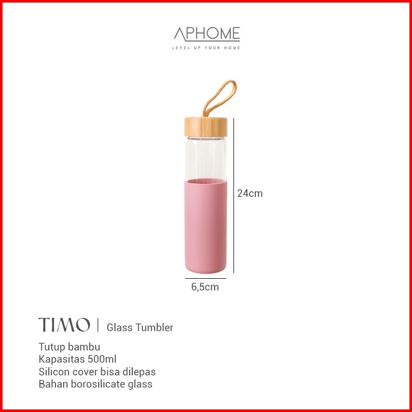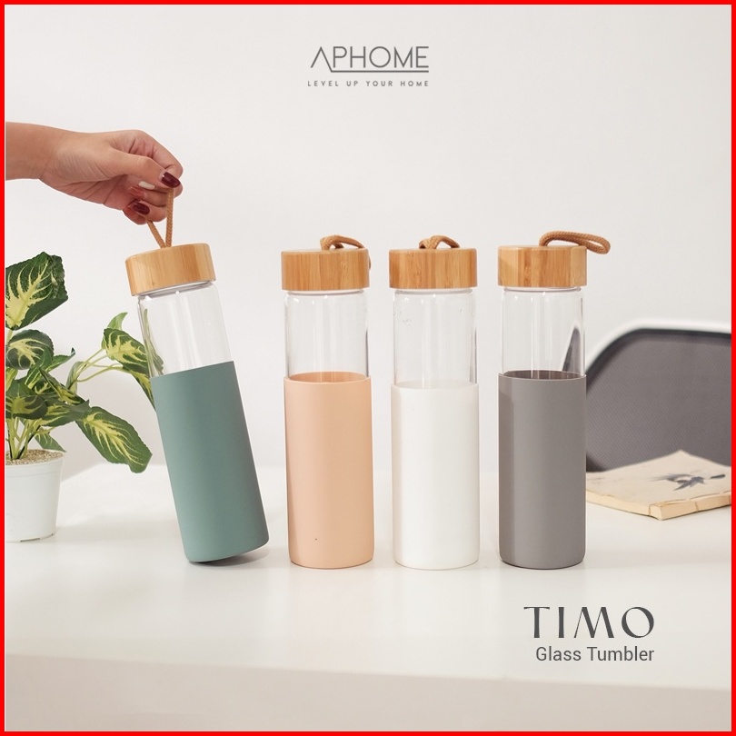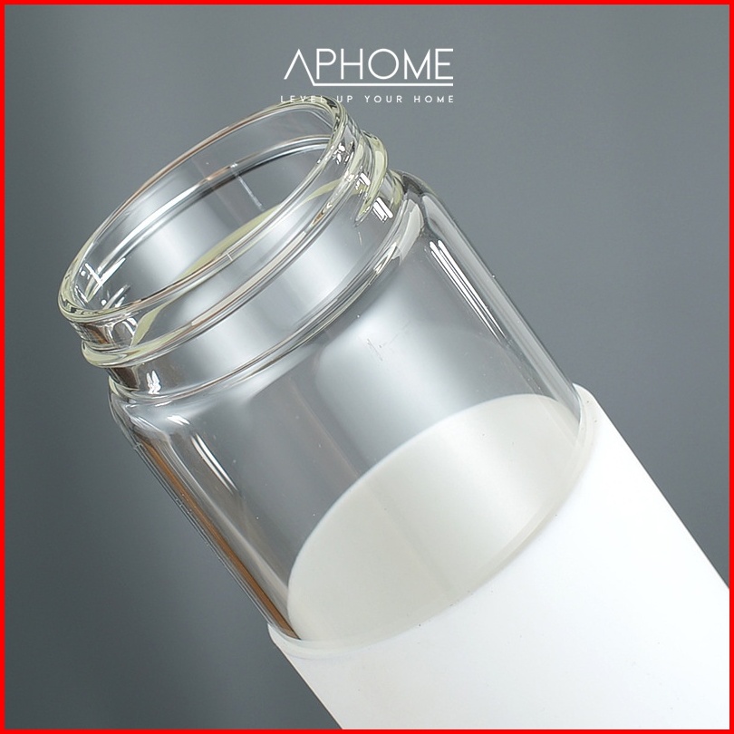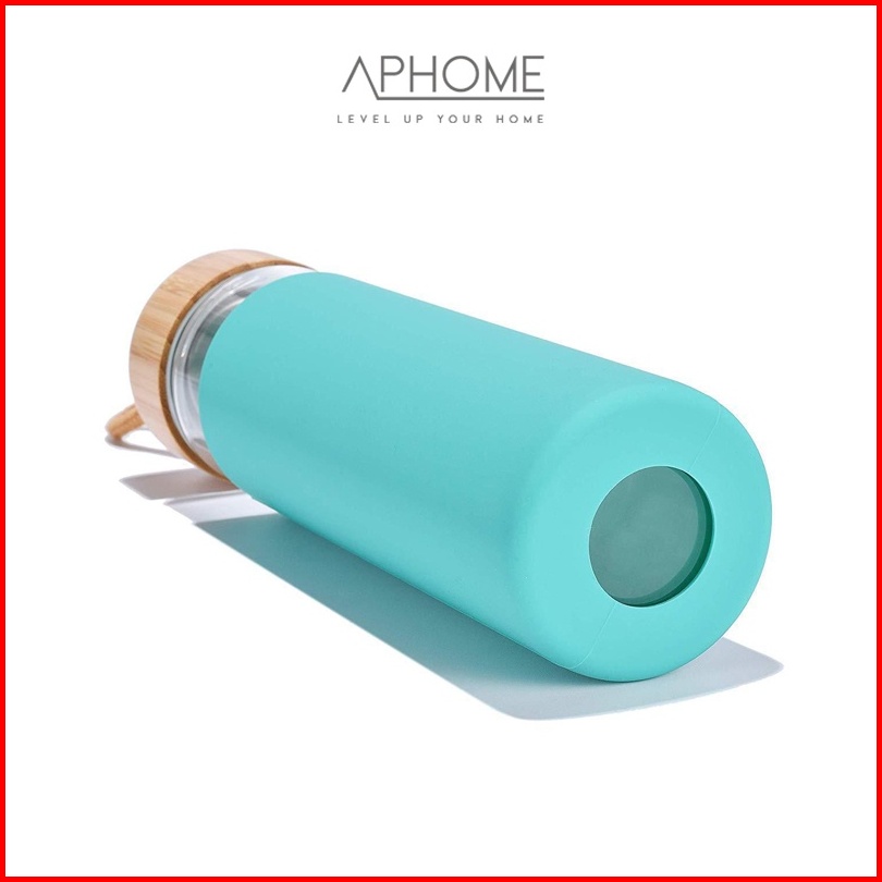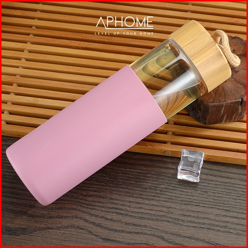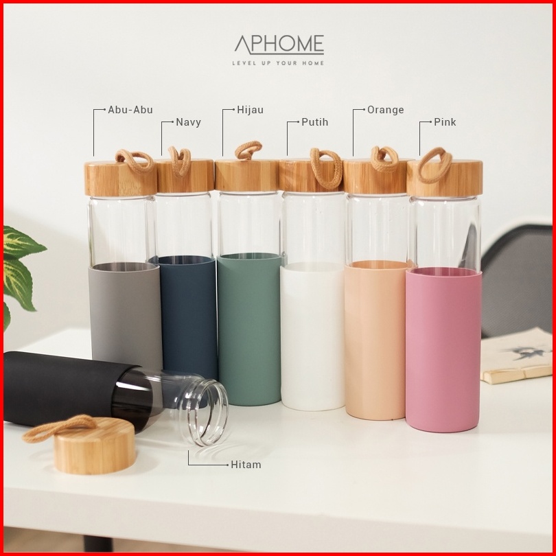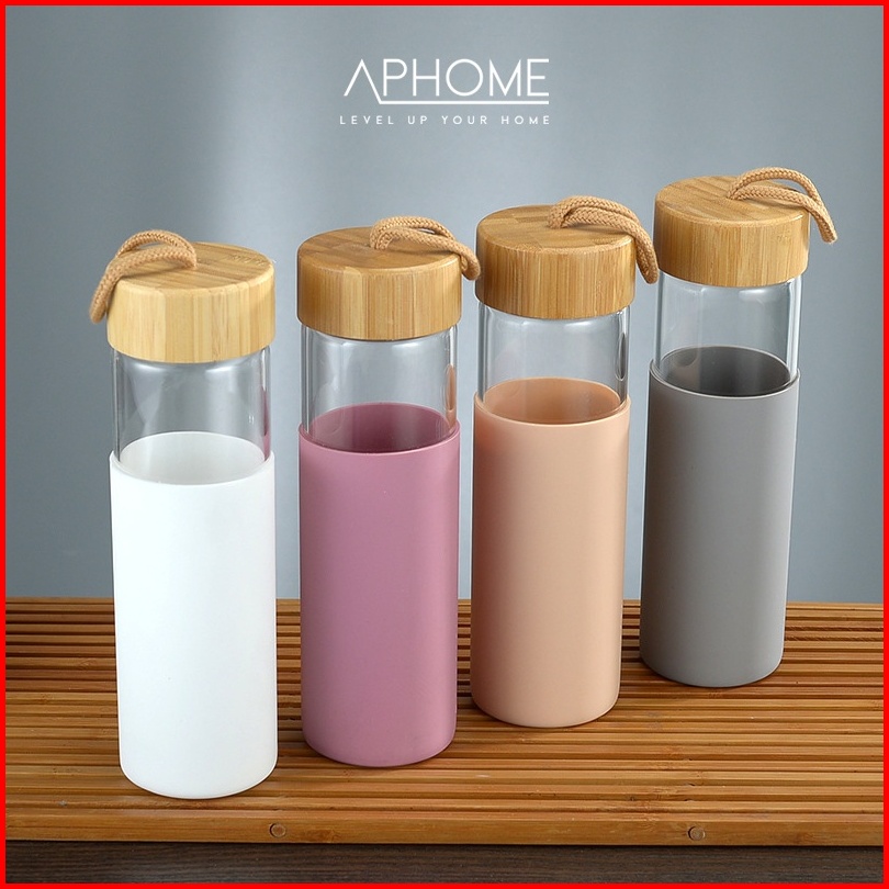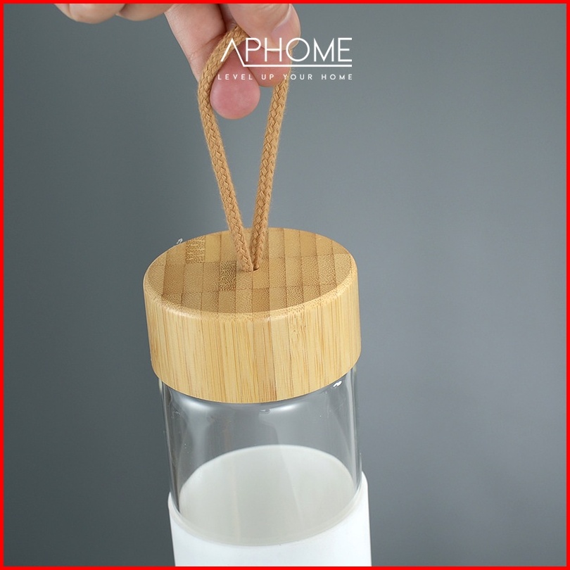 Aphome Botol Minum Kaca 600ml Glass Tumbler Wadah Minuman Dengan Tali Pegangan Botol Tutup Kayu Dilapisi Silicon Anti Sl