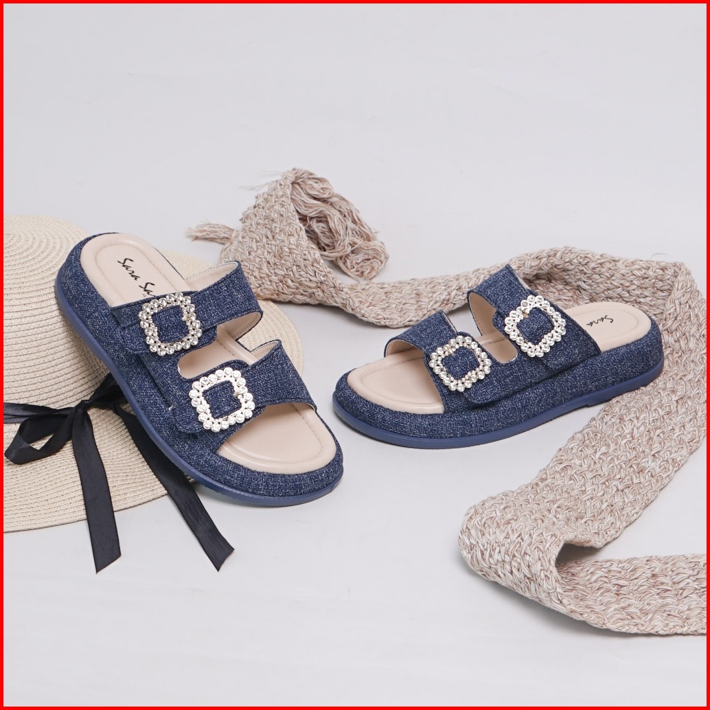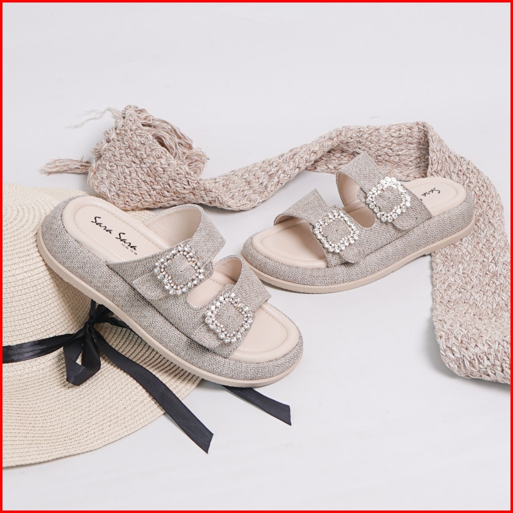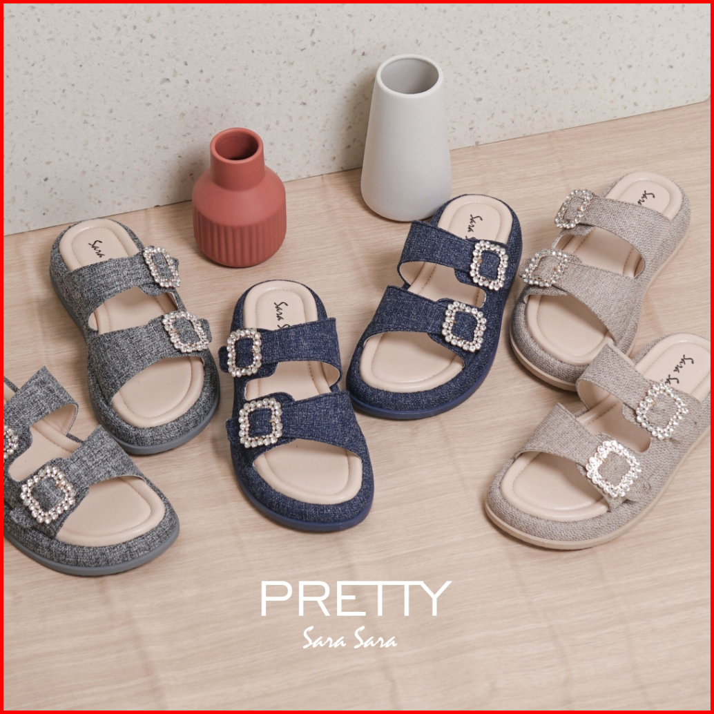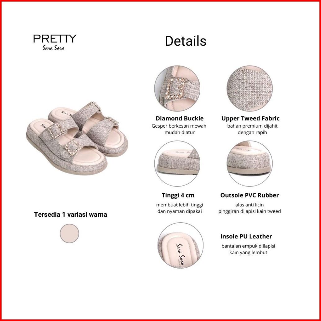 Sara Sara Pretty Sandal Selop Wanita Platform Bahan Fabric Tweed Sendal Slop Cewek Bahan Kanvas