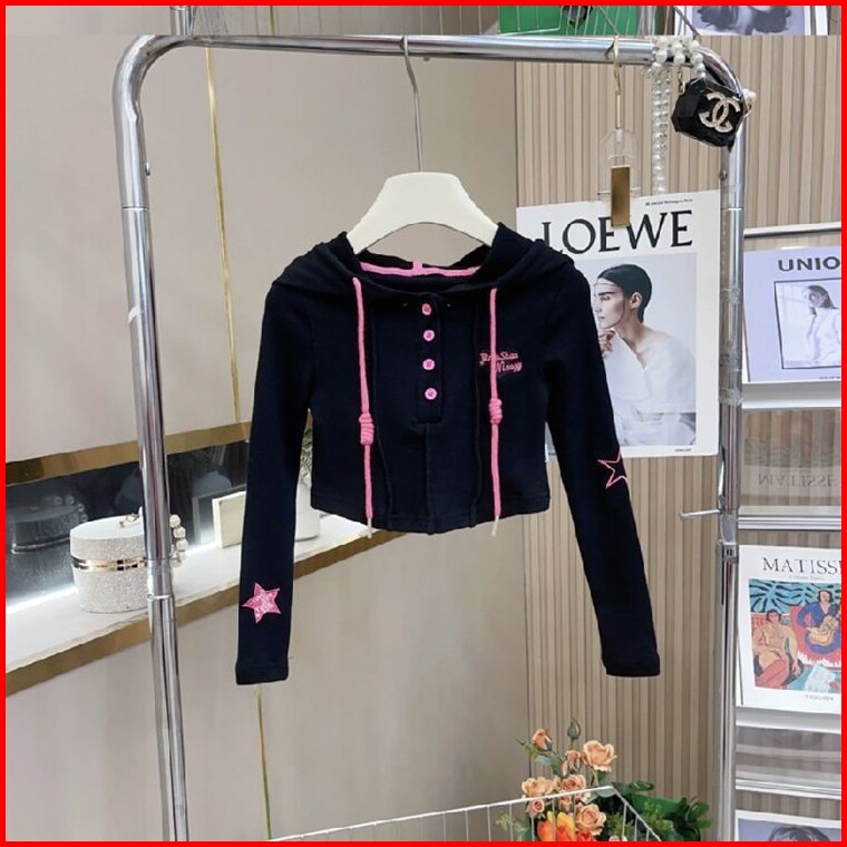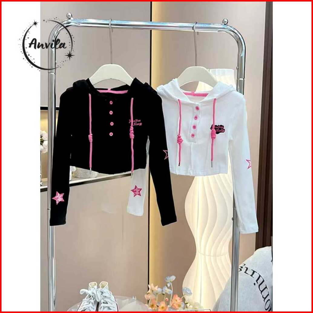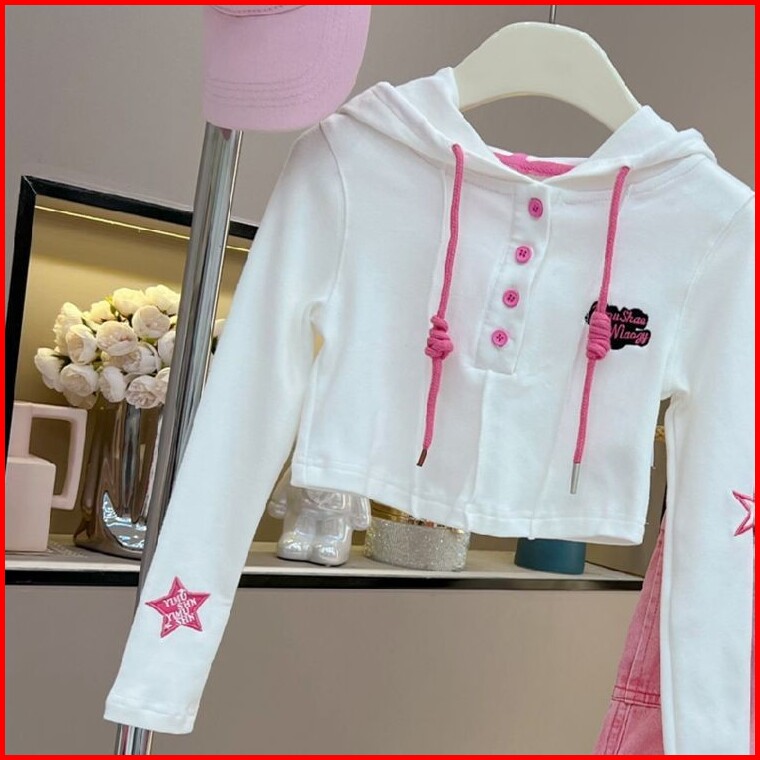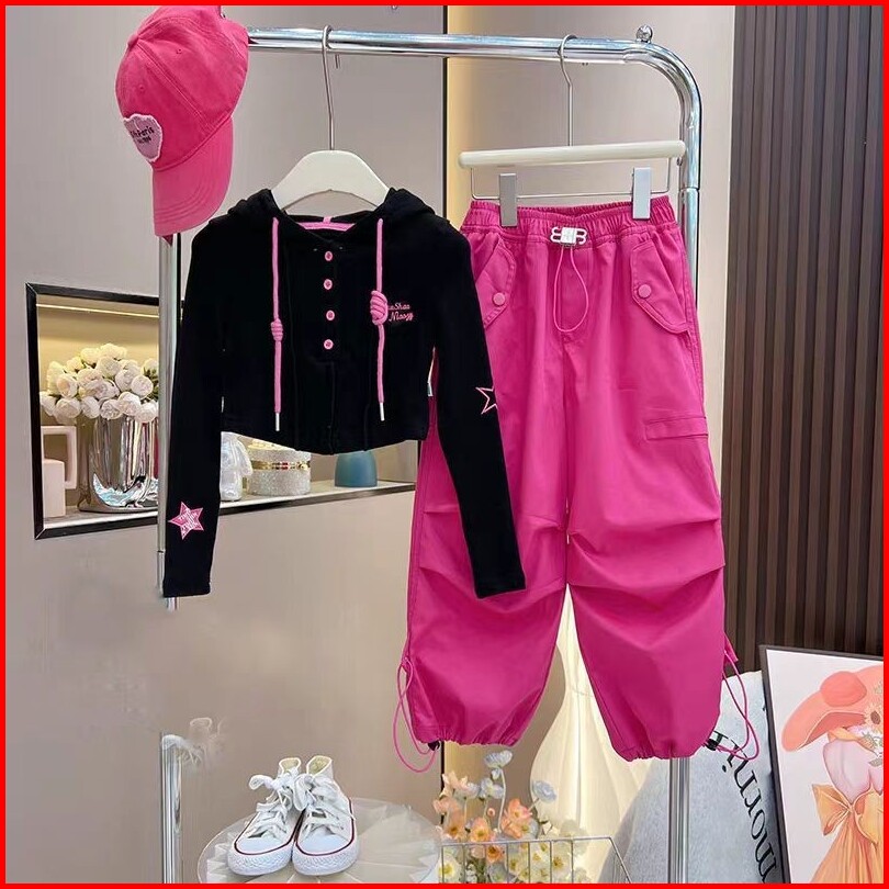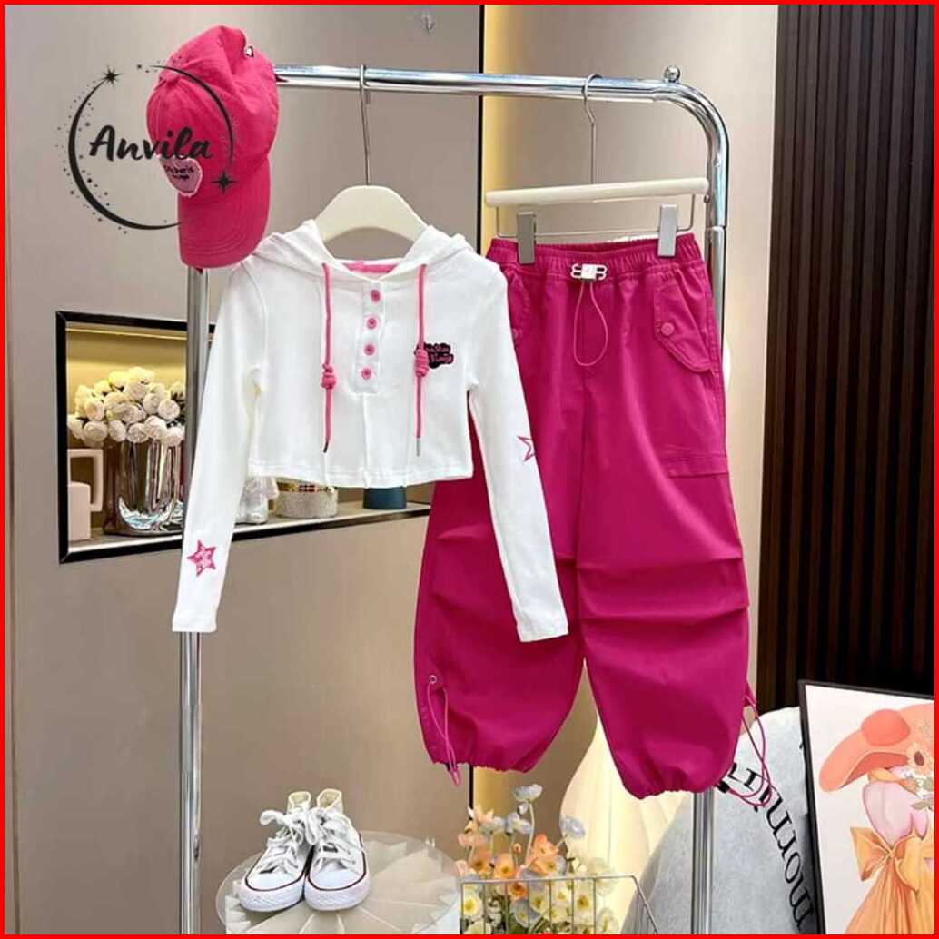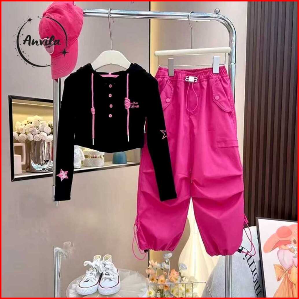 Setelan Anak Perempuan Import Jaket Tudung Star Tali Kancing Celana Joger Tali Serut Model Kekinian