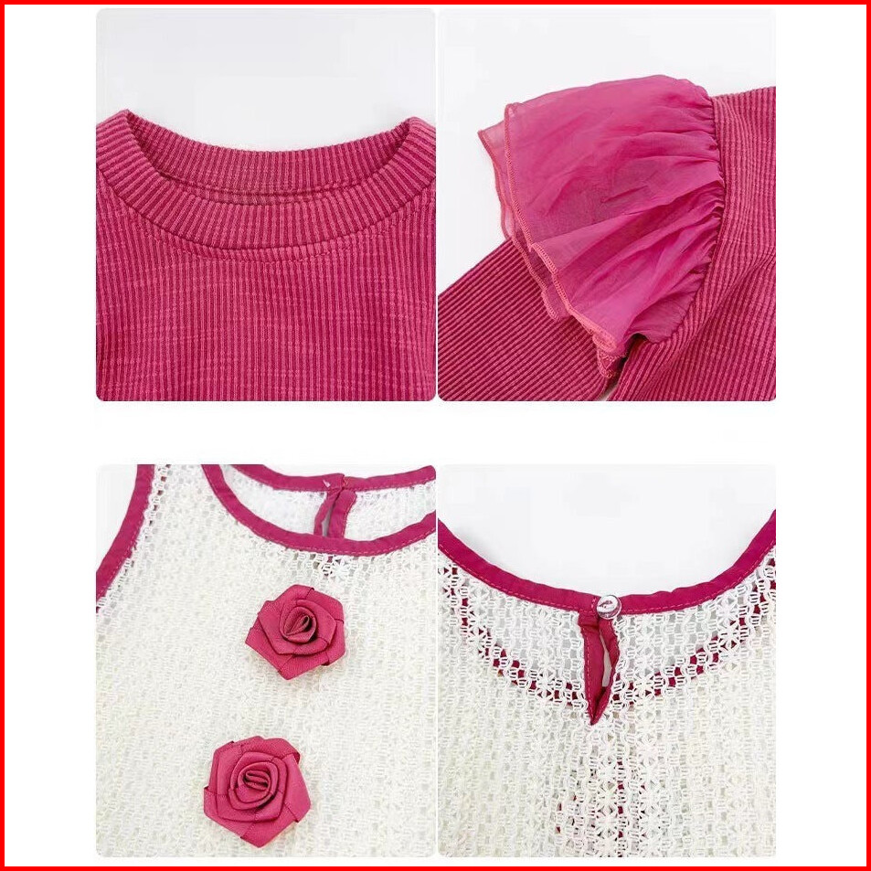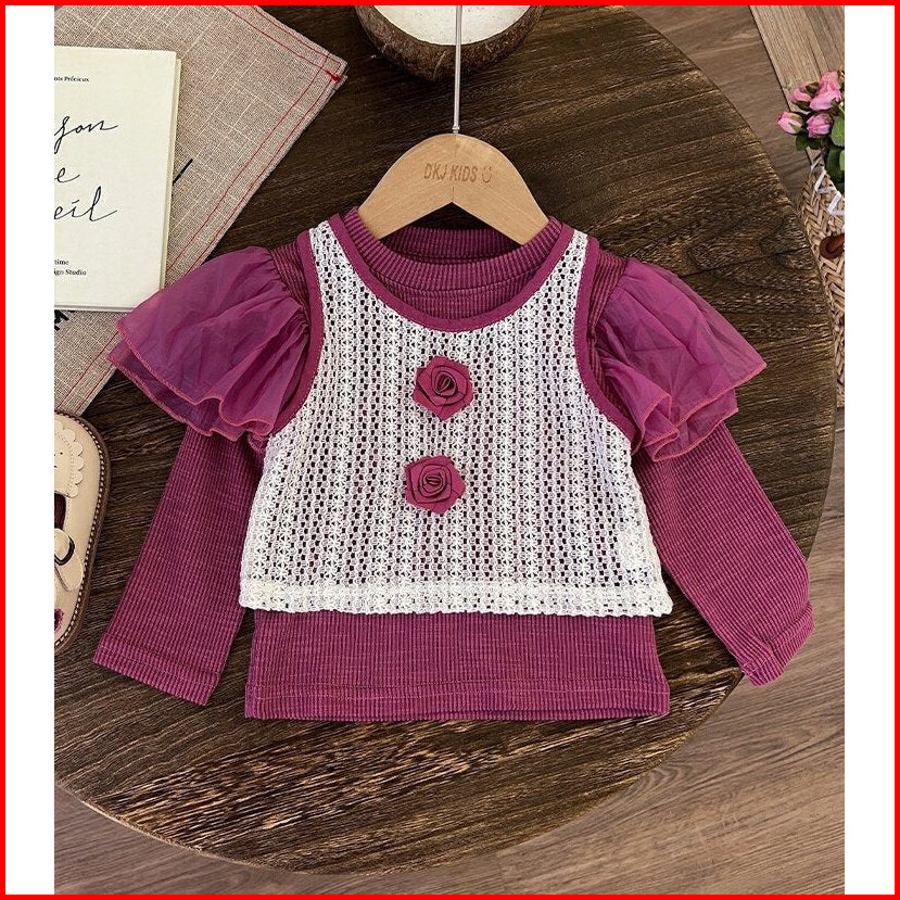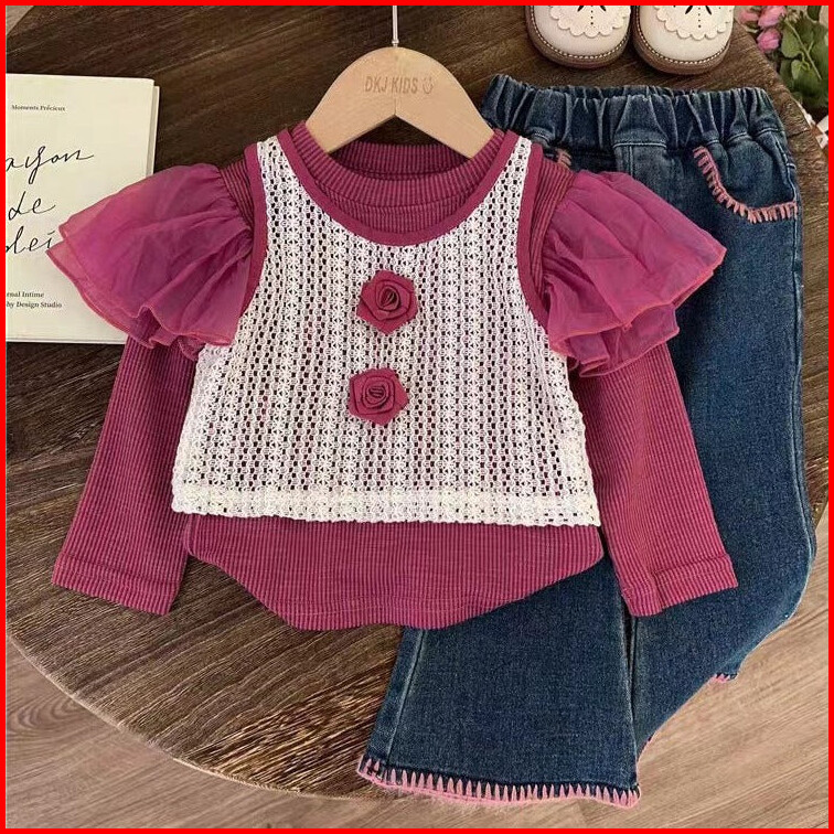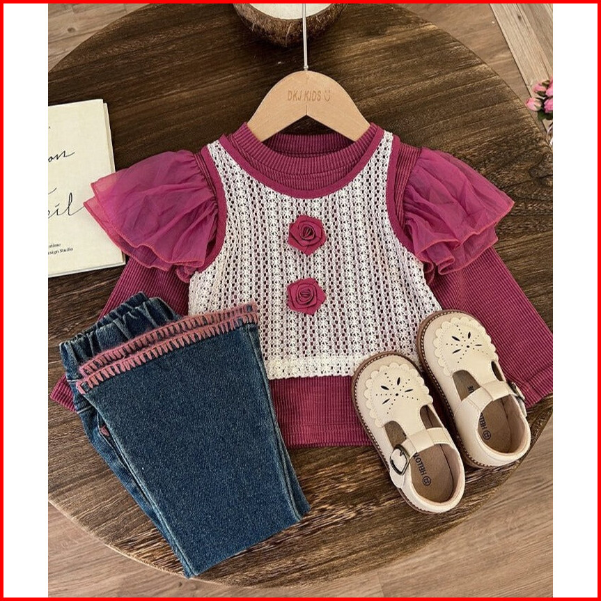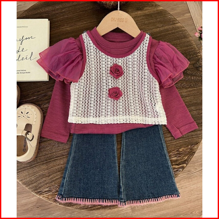 363705 - Oneset 3in1 Anak Cewek Korea Setelan Baju Lengan Balon Rompi Rajut Celana Jeans Fashion Anak Cewek - Motif Knit