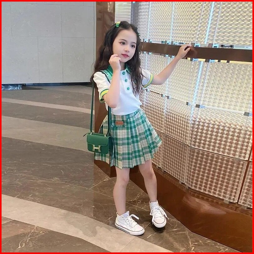 Setelan Anak Perempuan Import T-sirt Mei Li Rok Mini Kotak--kotak Kerah 3 Kancing Model Kekinian
