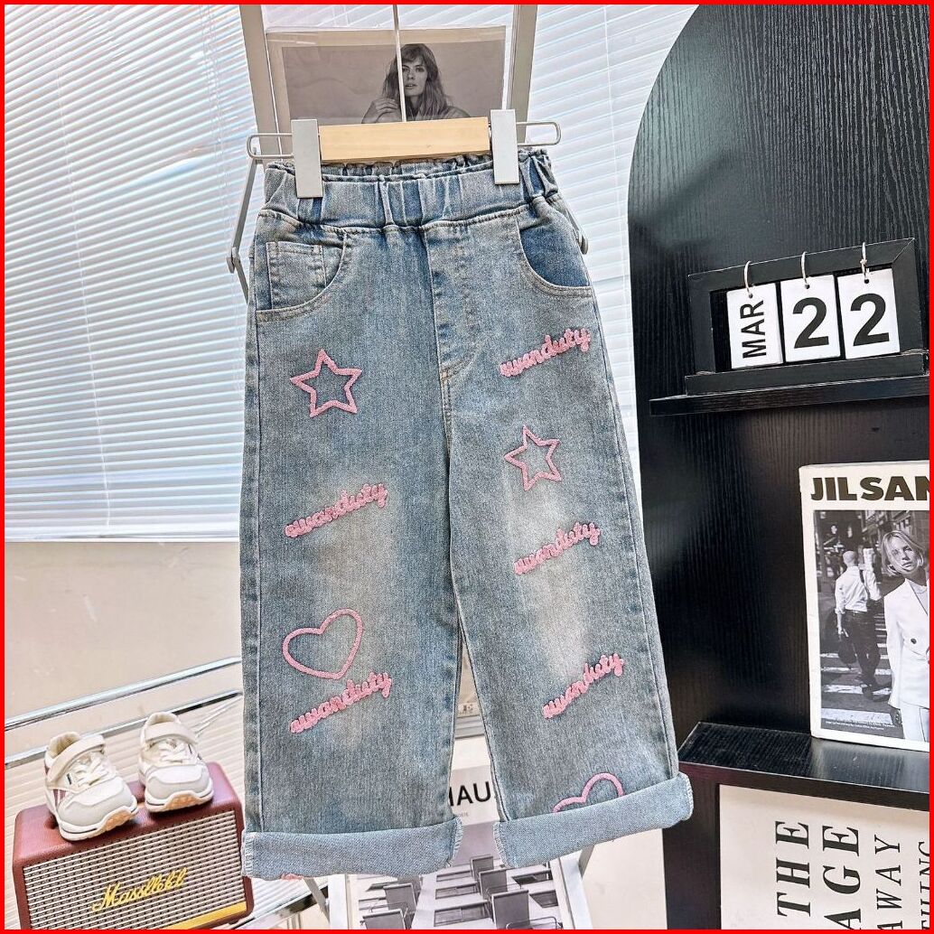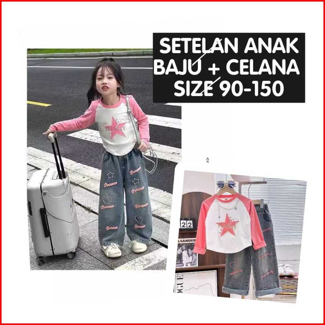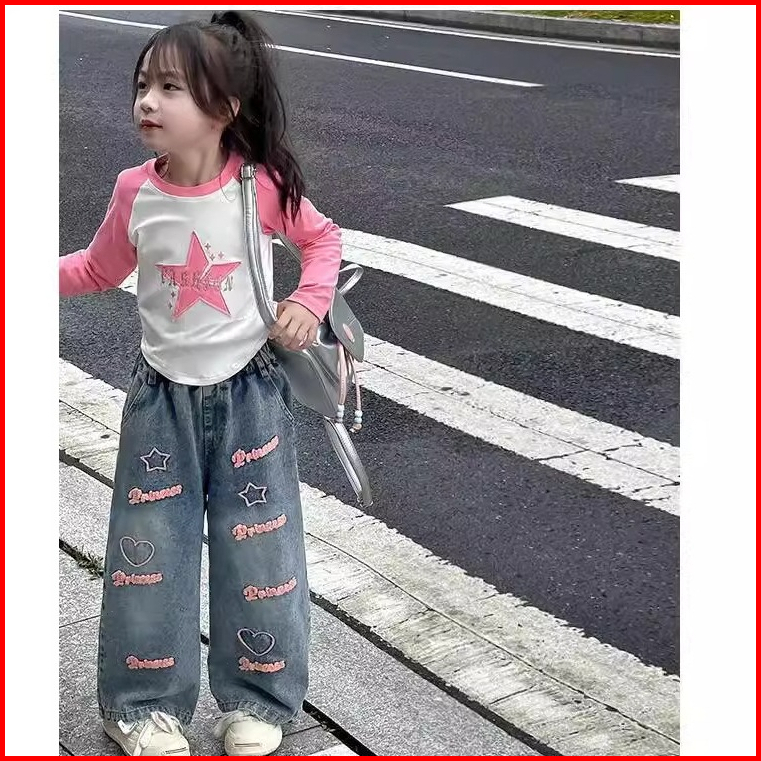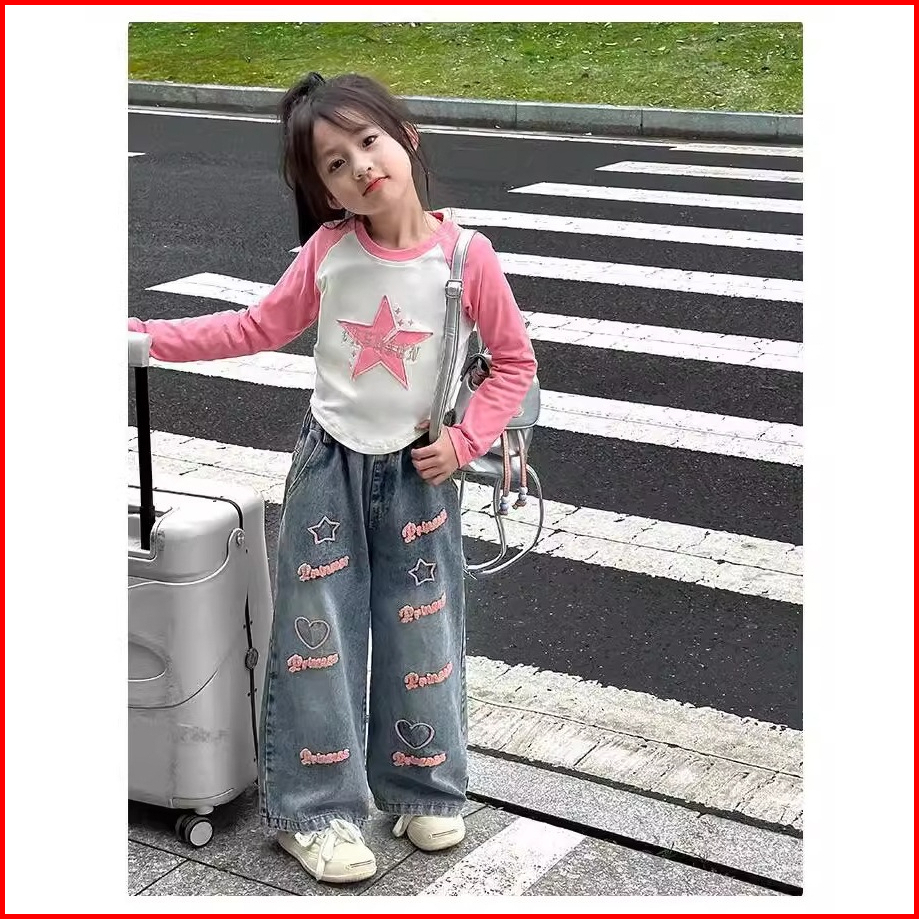 Loli-jkt Bs- 670 Setelan Anak Kaos Panjang Oval Celana Jeans Bordir Size 90-150