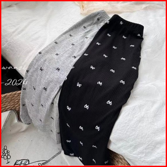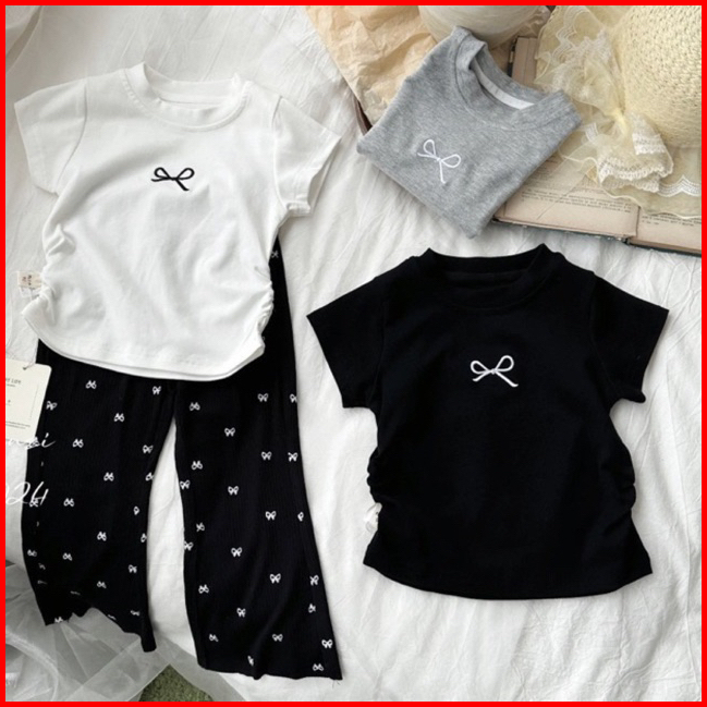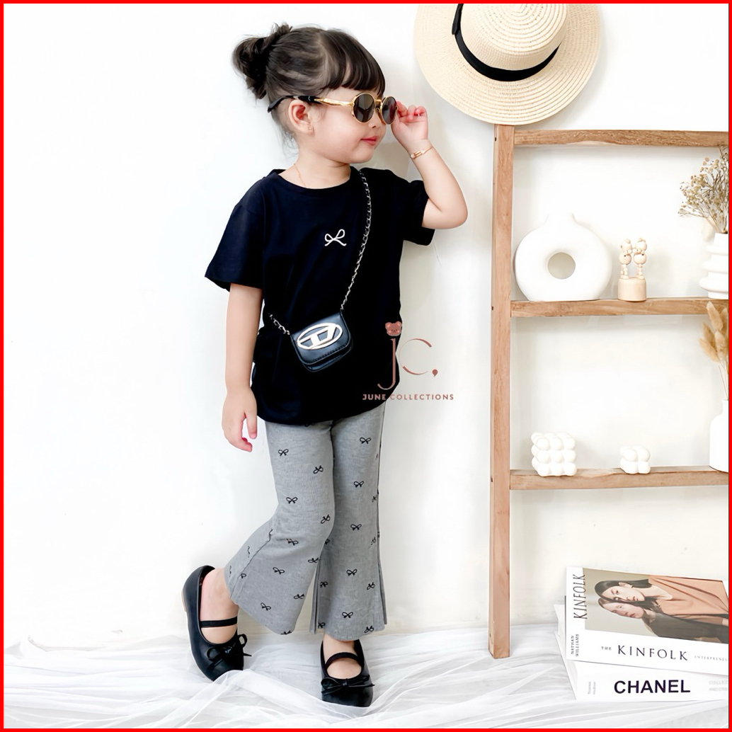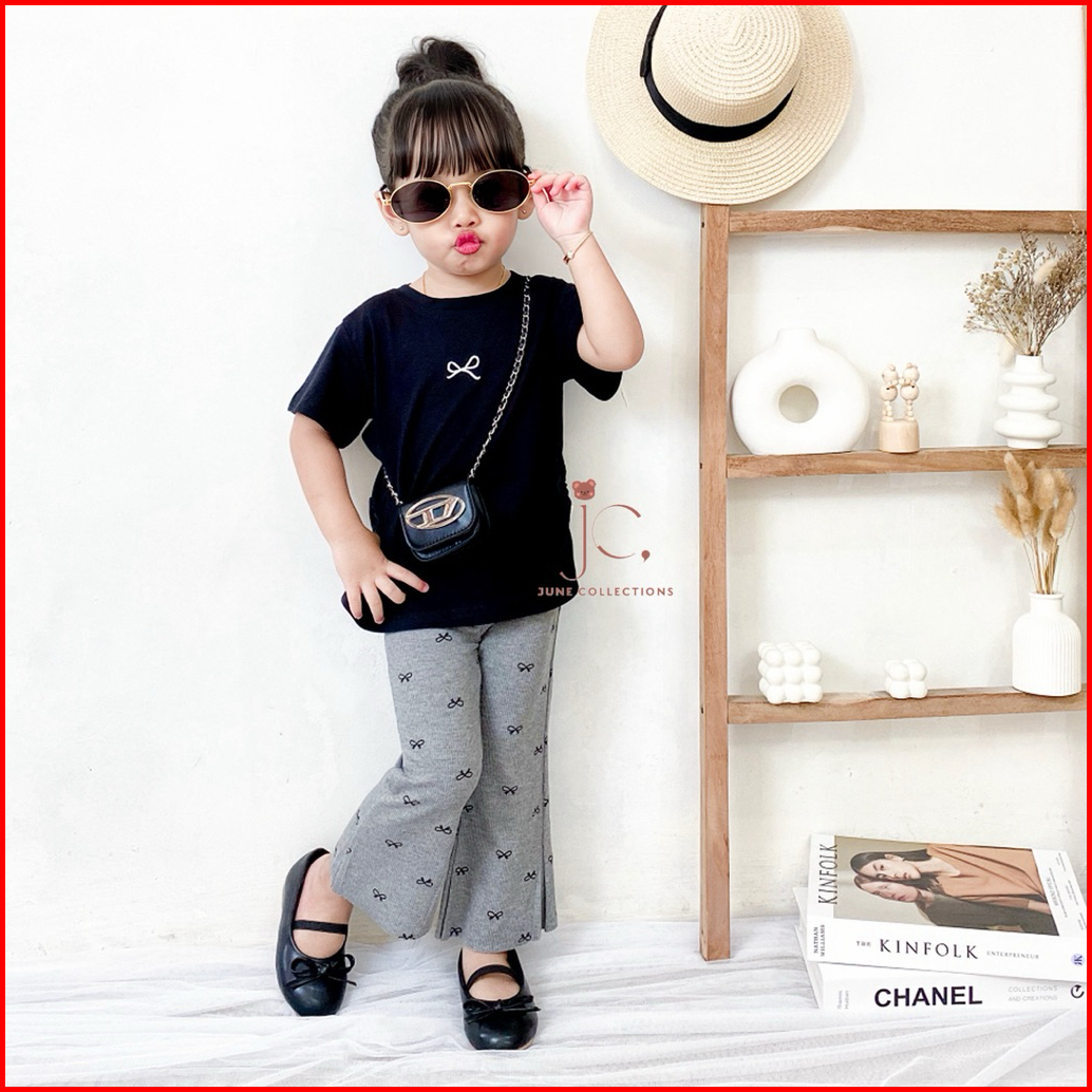 Junecollections Kaos Lengan Pendek Serut Ala-ala Korean Girl Motif Pita Celana Panjang Anak Perempuan Hits Kekinian Moti