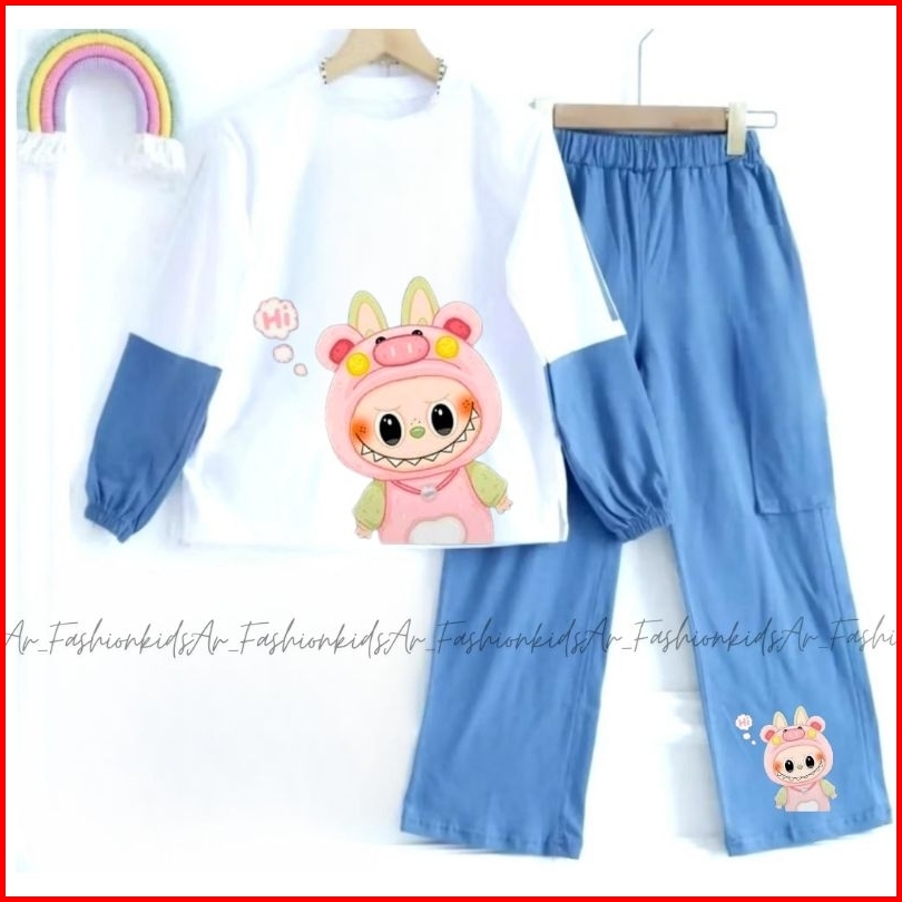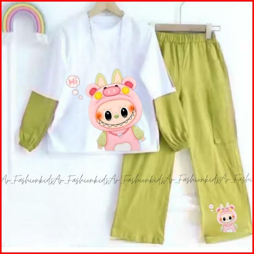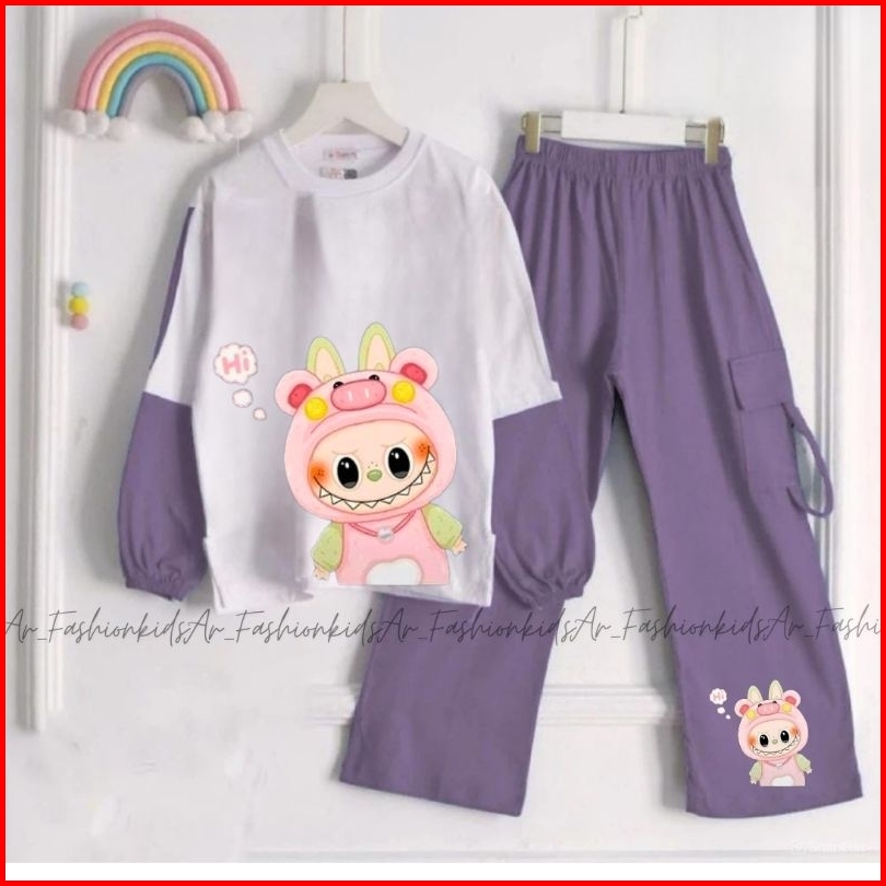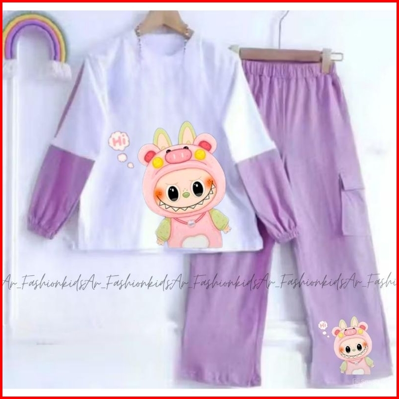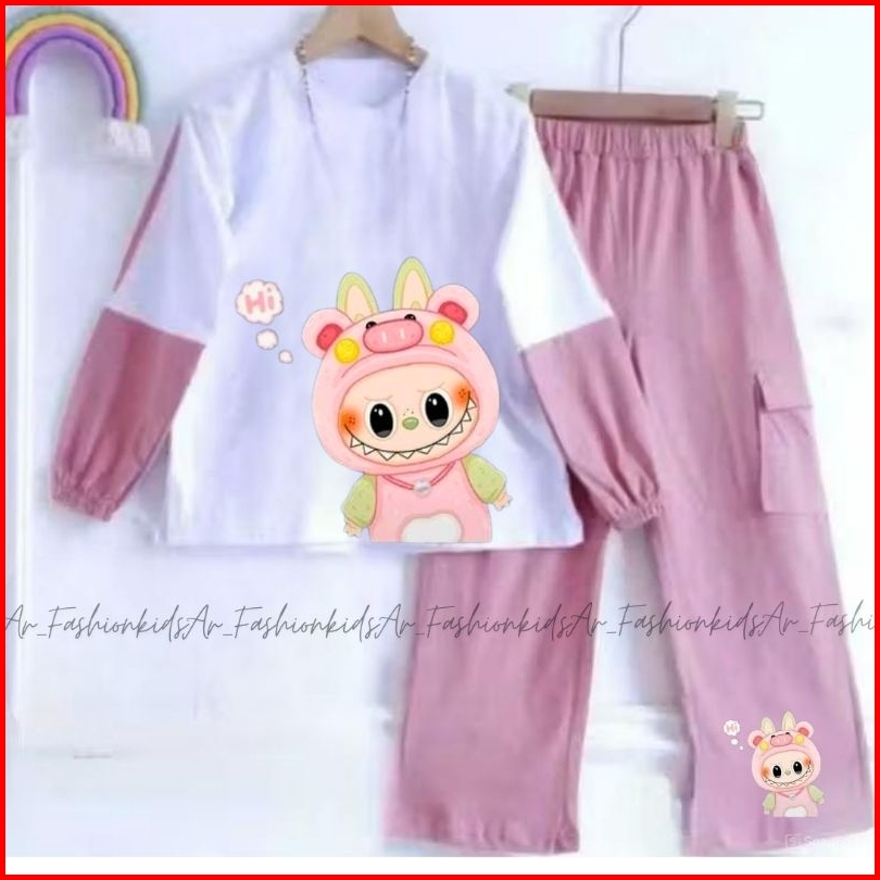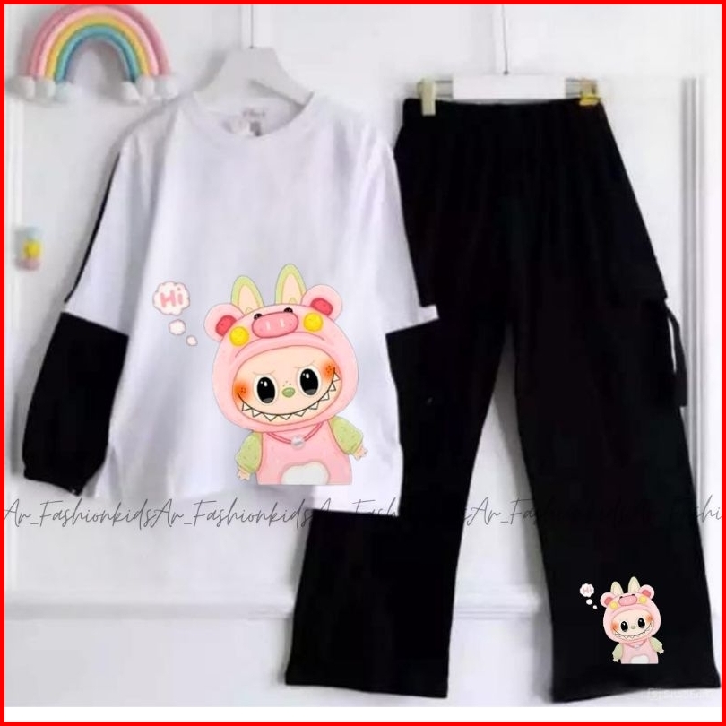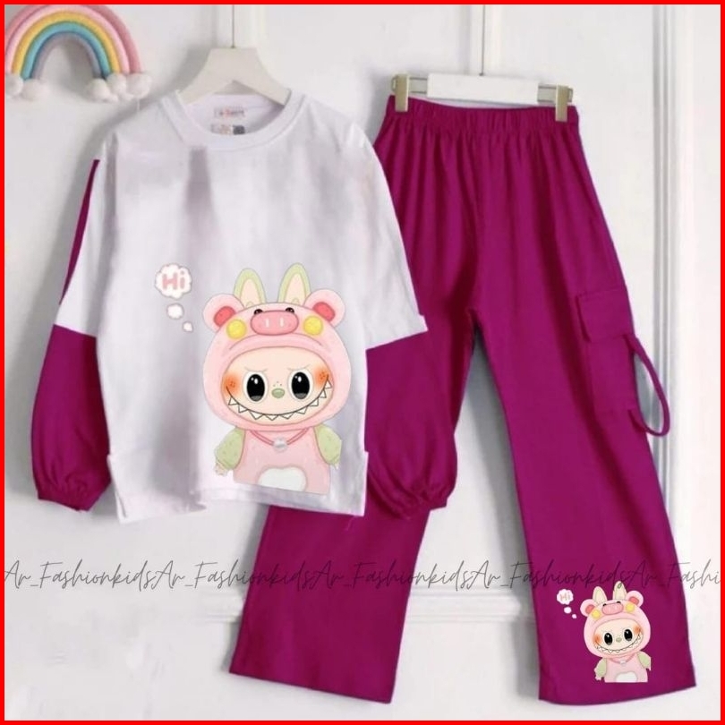 Set Anak Labubu Pinky Setelan Anak Usia 3-12tahun Crinkle Airflow Fashion Anak Sablon Dtf Terbaru Setelan Anak Perempuan