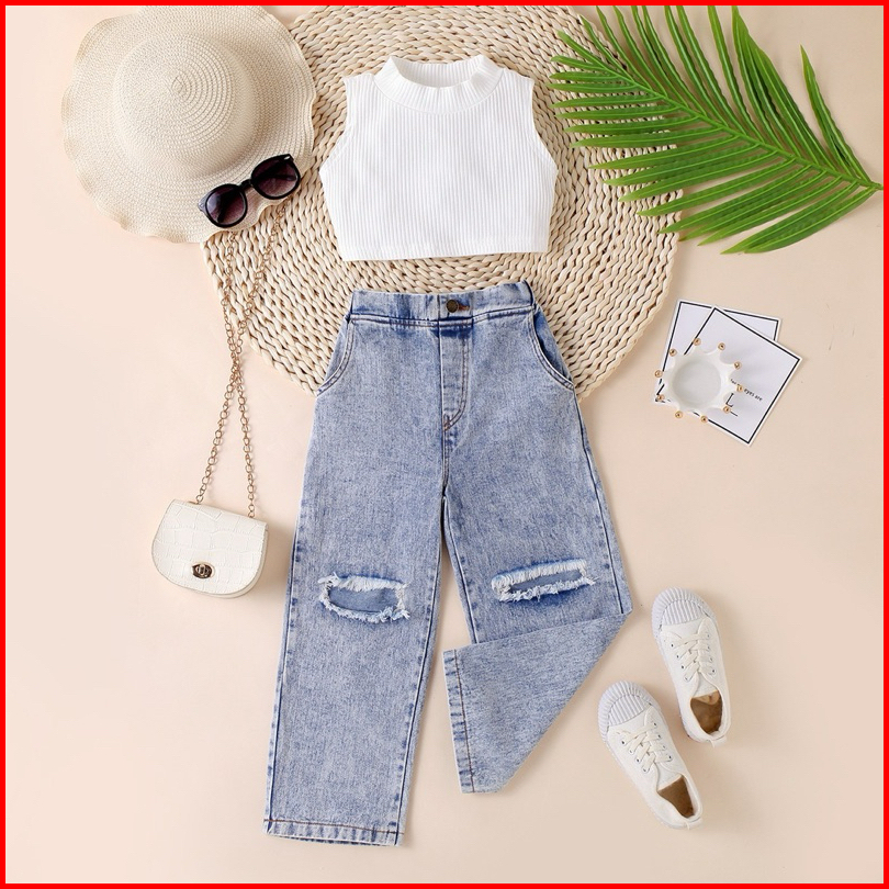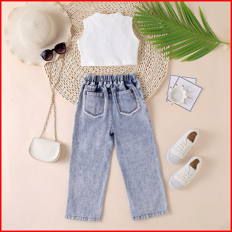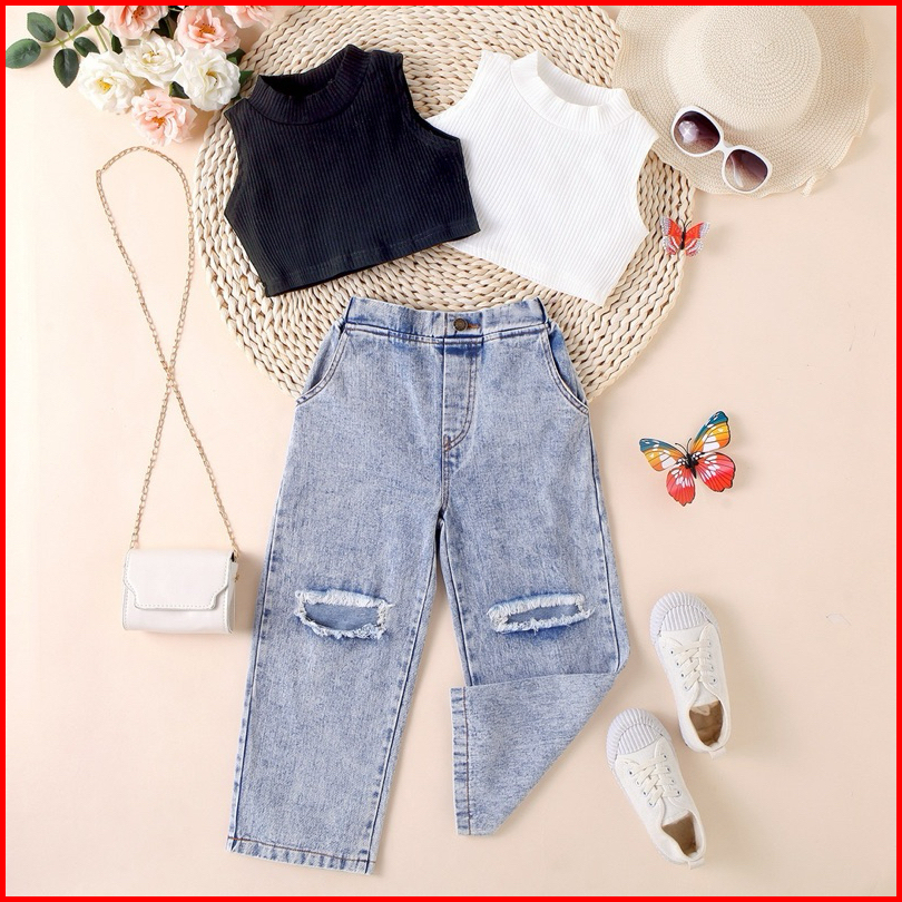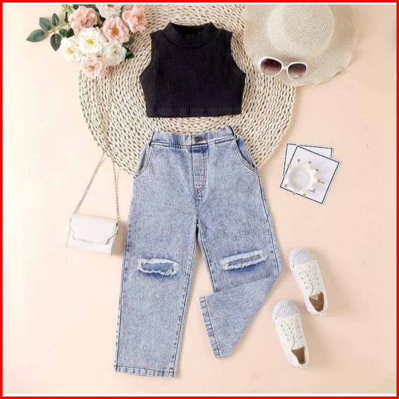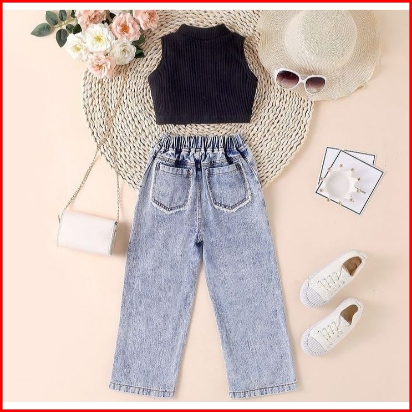 Littleflamingo Setelan Baju Crop Top Celana Jeans Anak Perempuan Kekinian Cantik