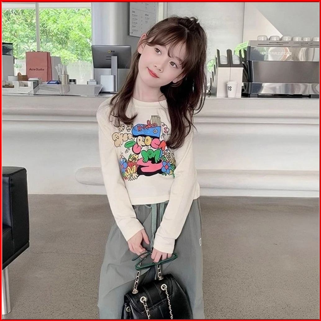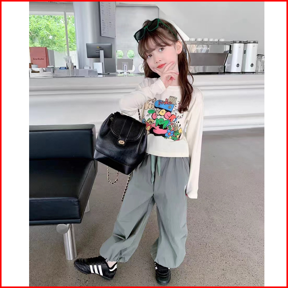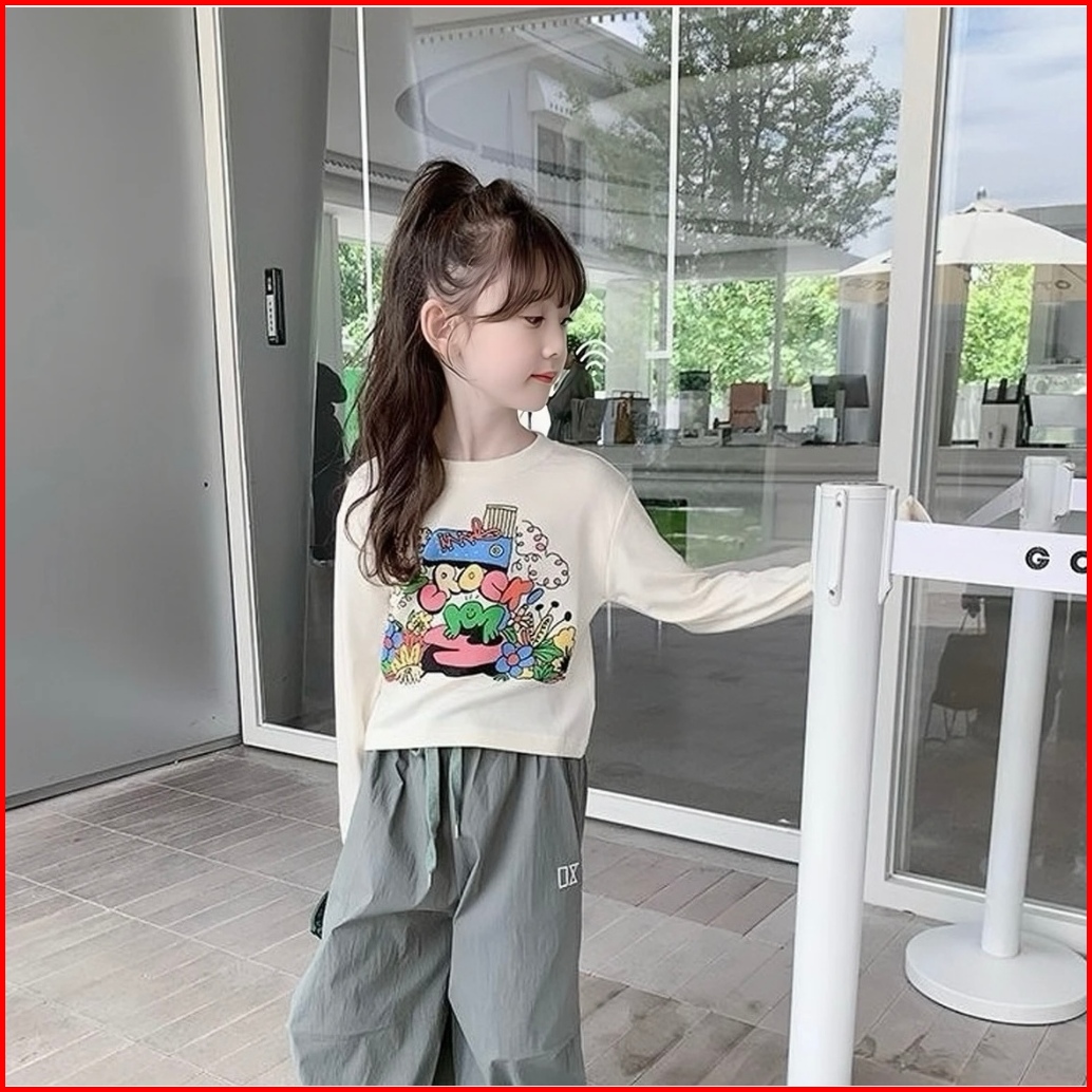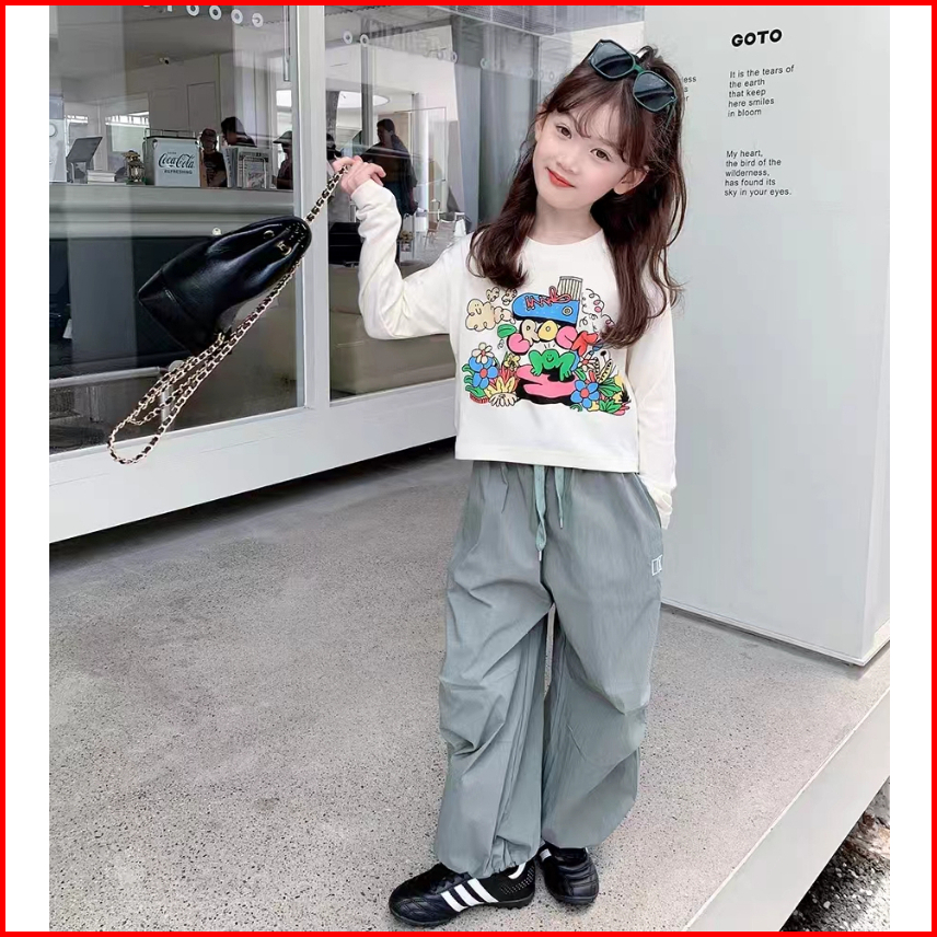 Kingogo Korean Style Setelan Cargo Anak Perempuan Atasan Motif Cartoon Bahan Katun Lengan Panjang Celana Panjang Bahan C
