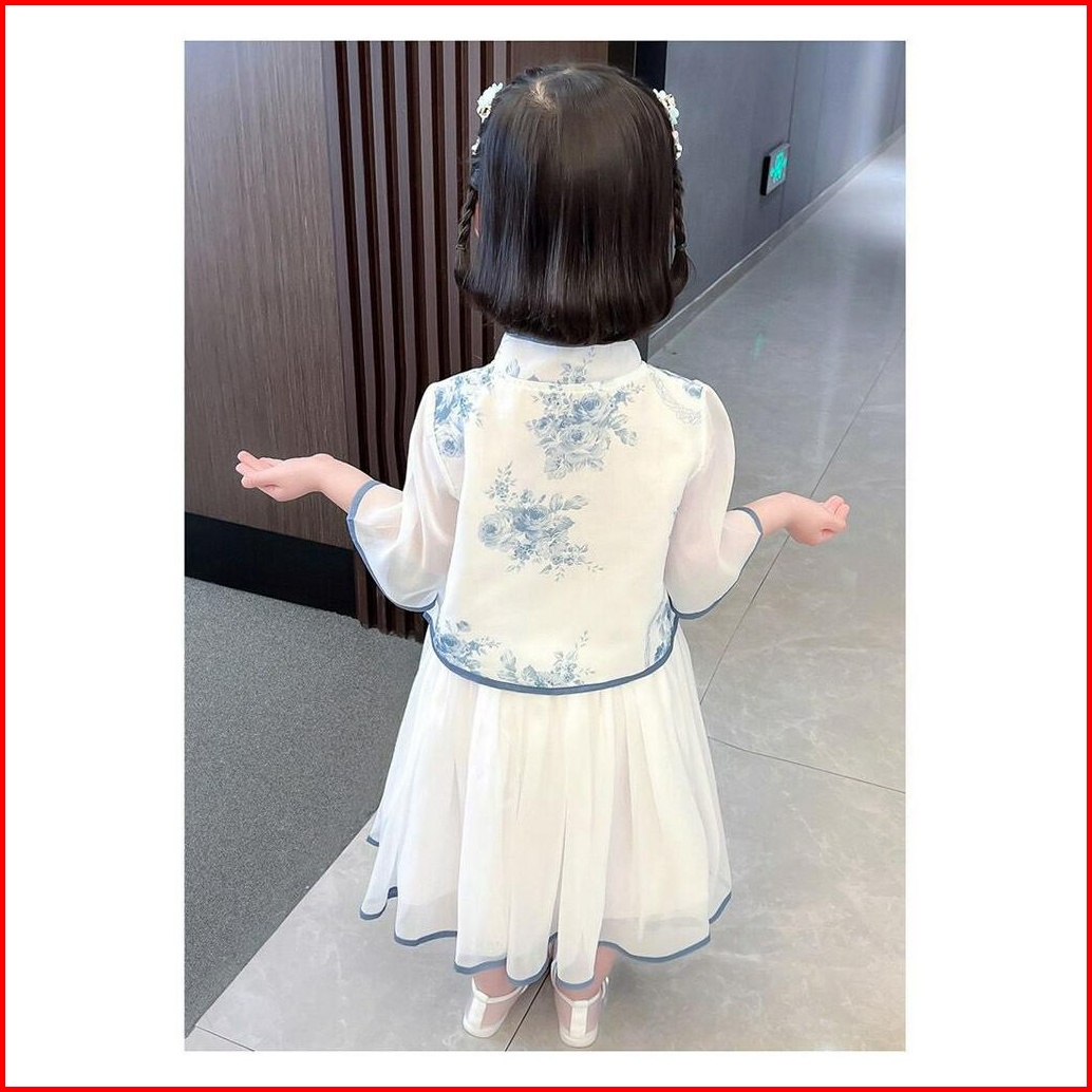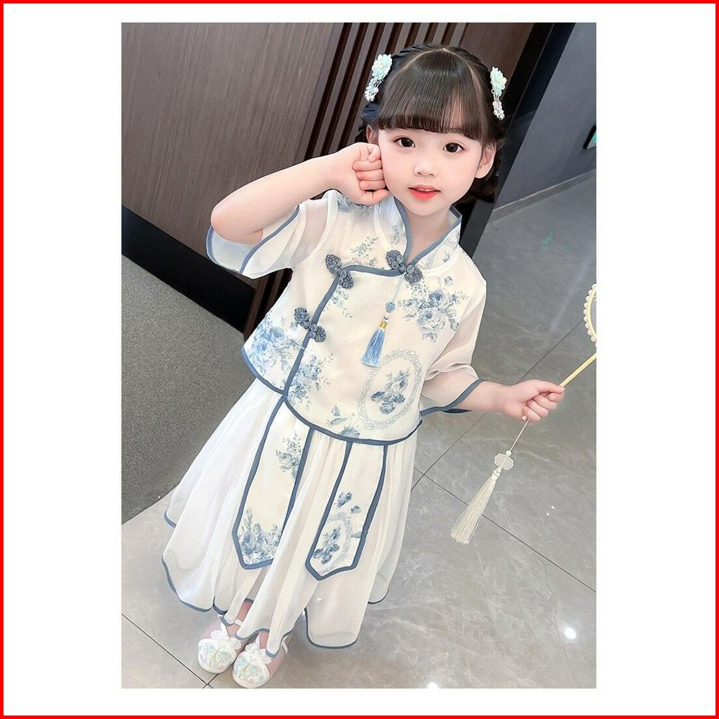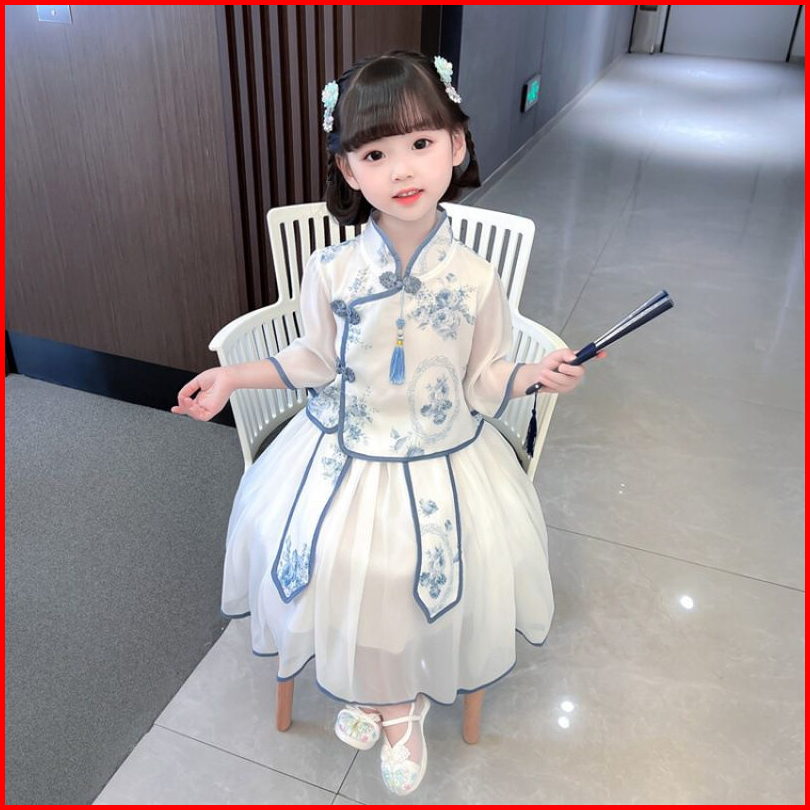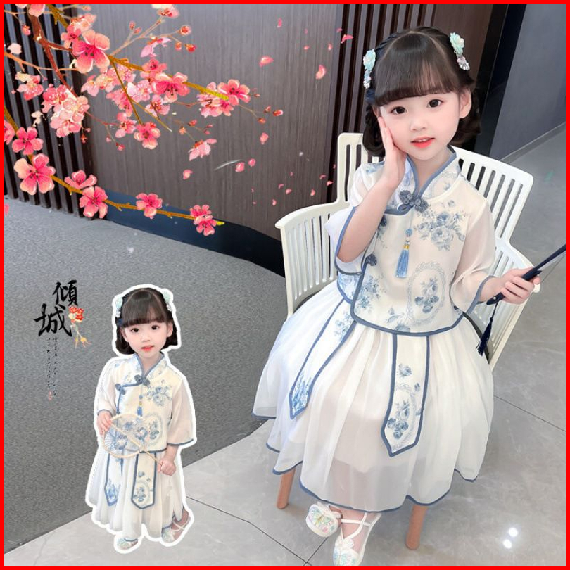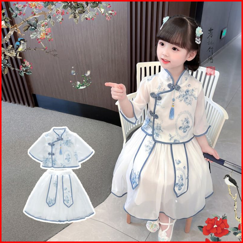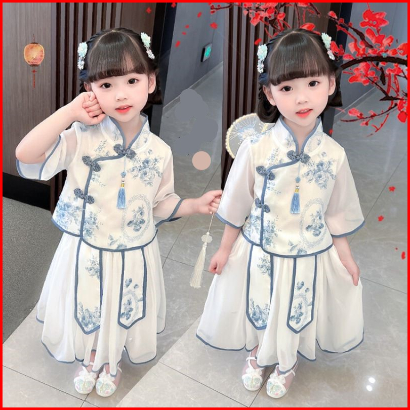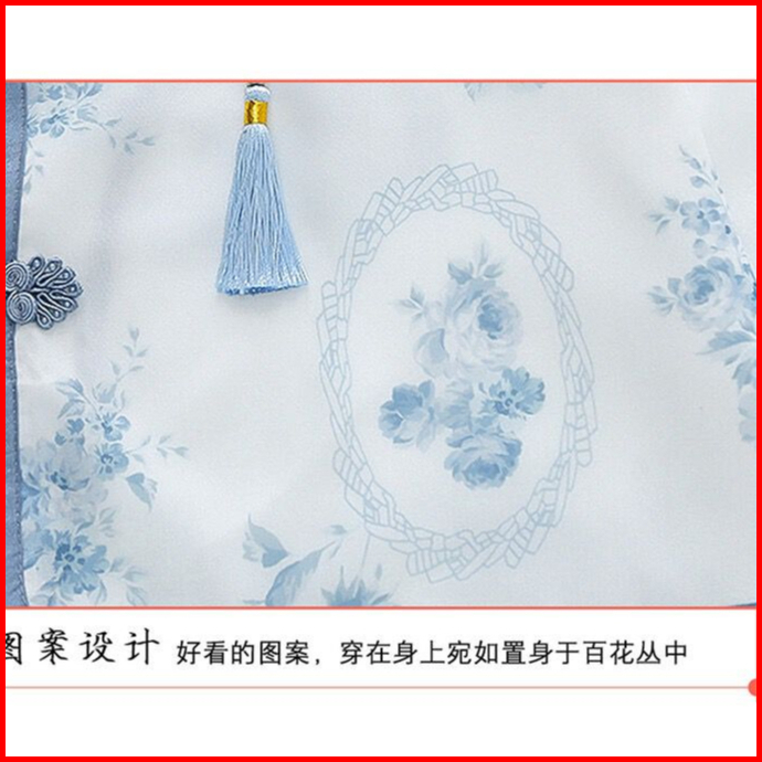 Kidsfashionkoleksi Setelan Anak Perempuan Cheonsam Motif Biru Putih Free Accesoris Jepit Tato