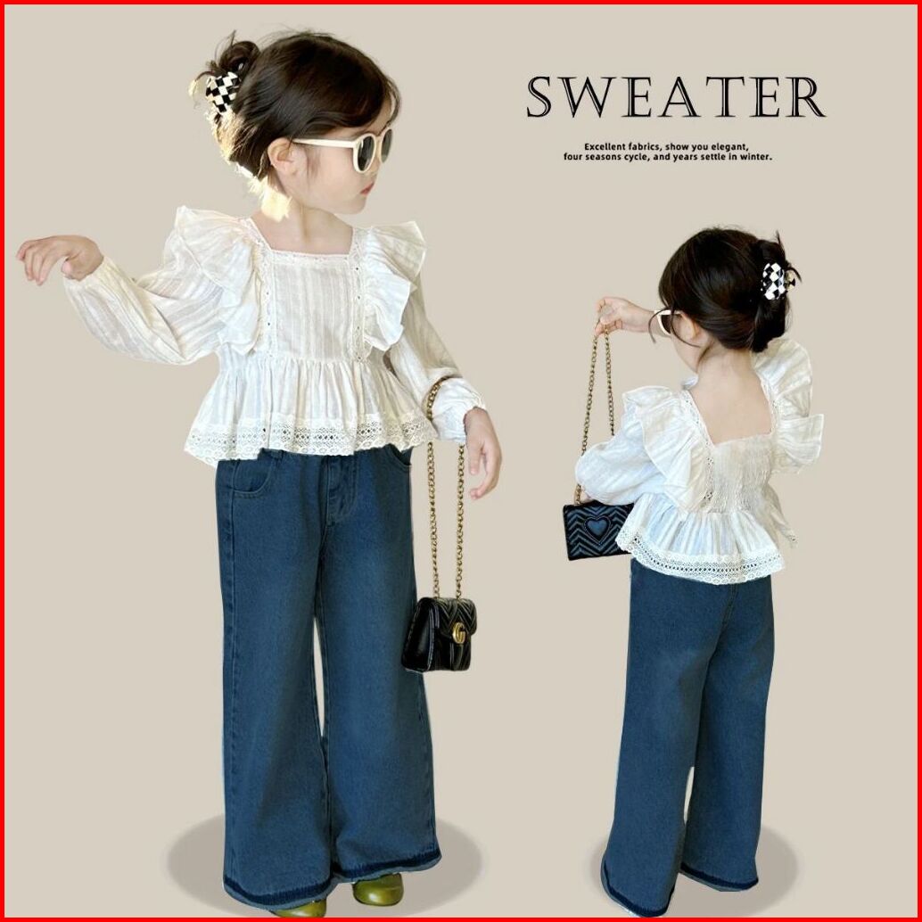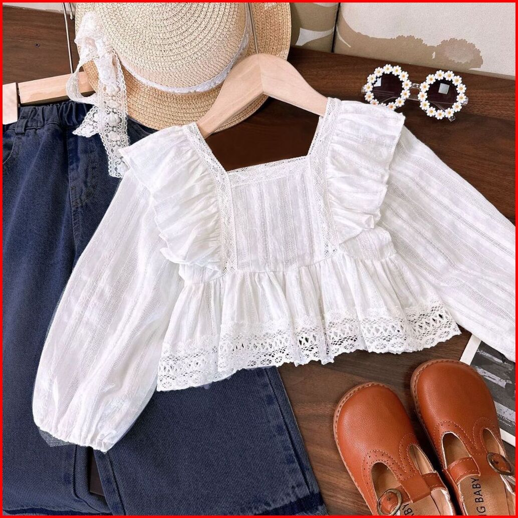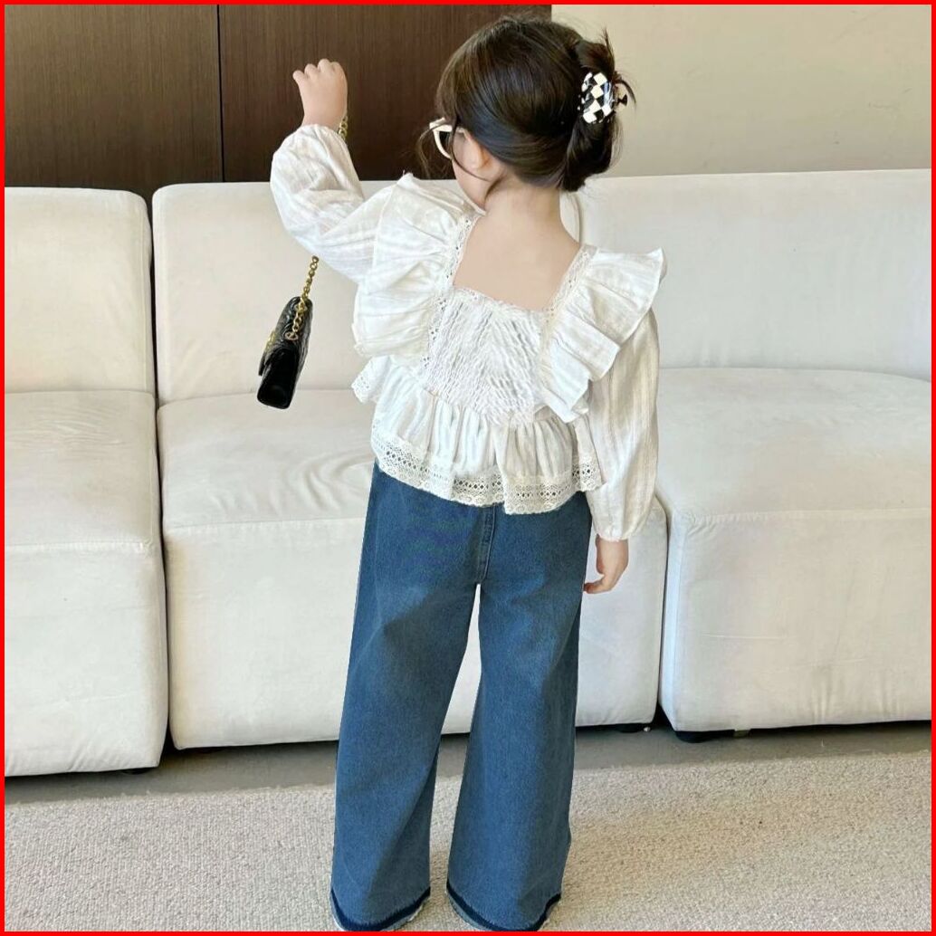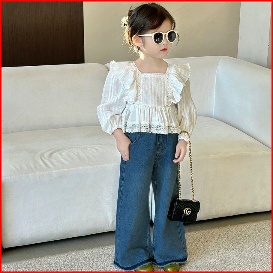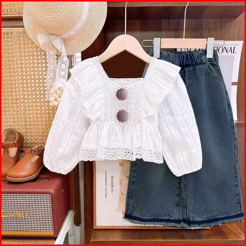 Kidsfo-6 Setelan Set Anak Baju Blouse Katun Brukat Premium Celana Jeans Panjang Fashion Korea