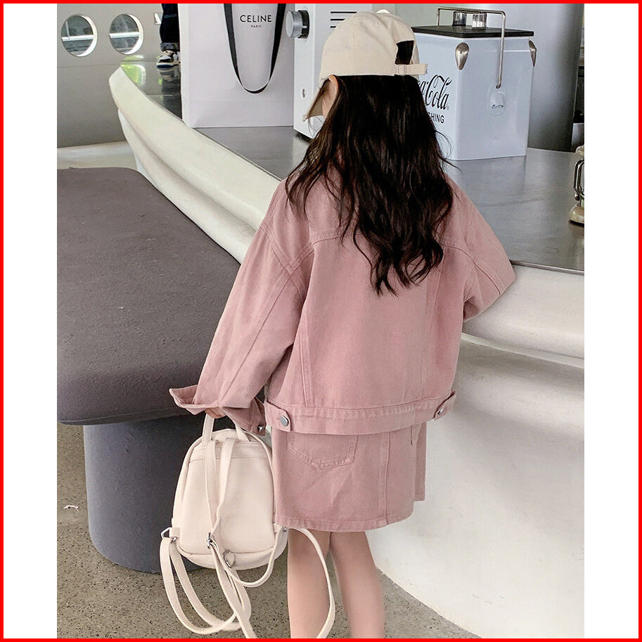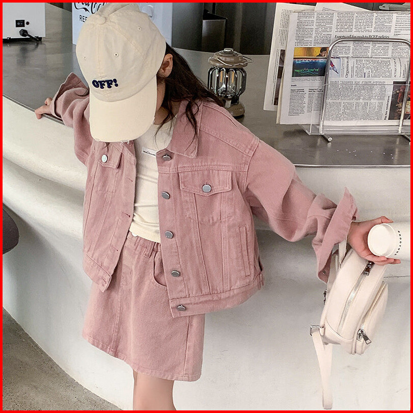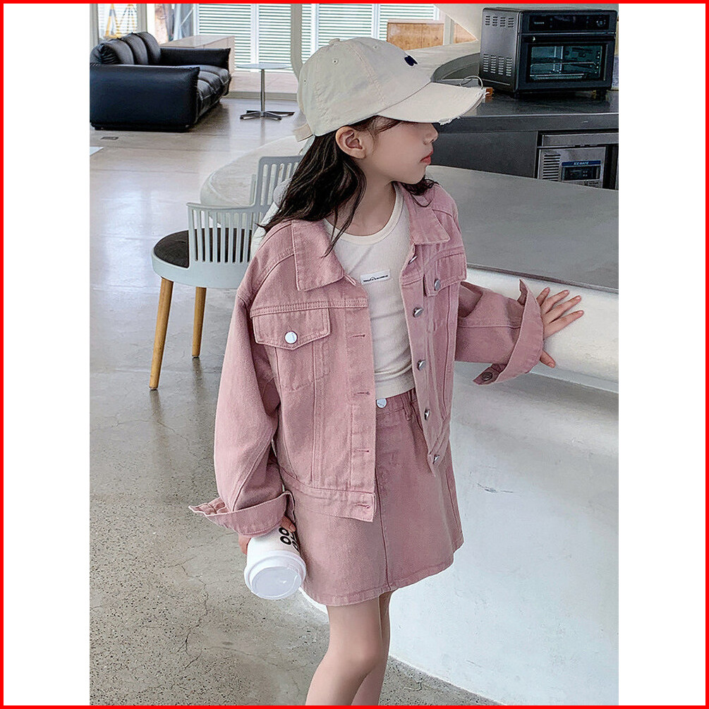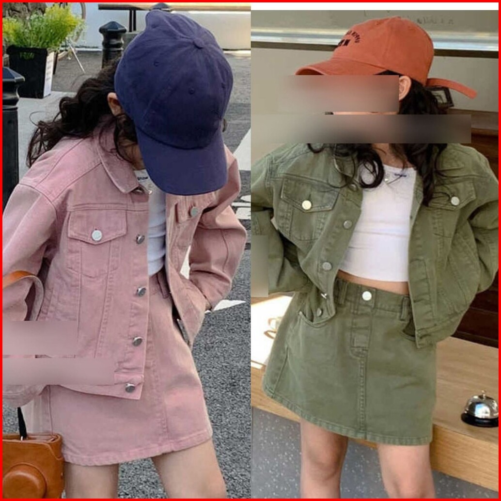 5071029 - Setelan Baju Jaket Lengan Panjang Bawahan Rok Pendek Jeans Fashion Anak Perempuan - Motif Button Line