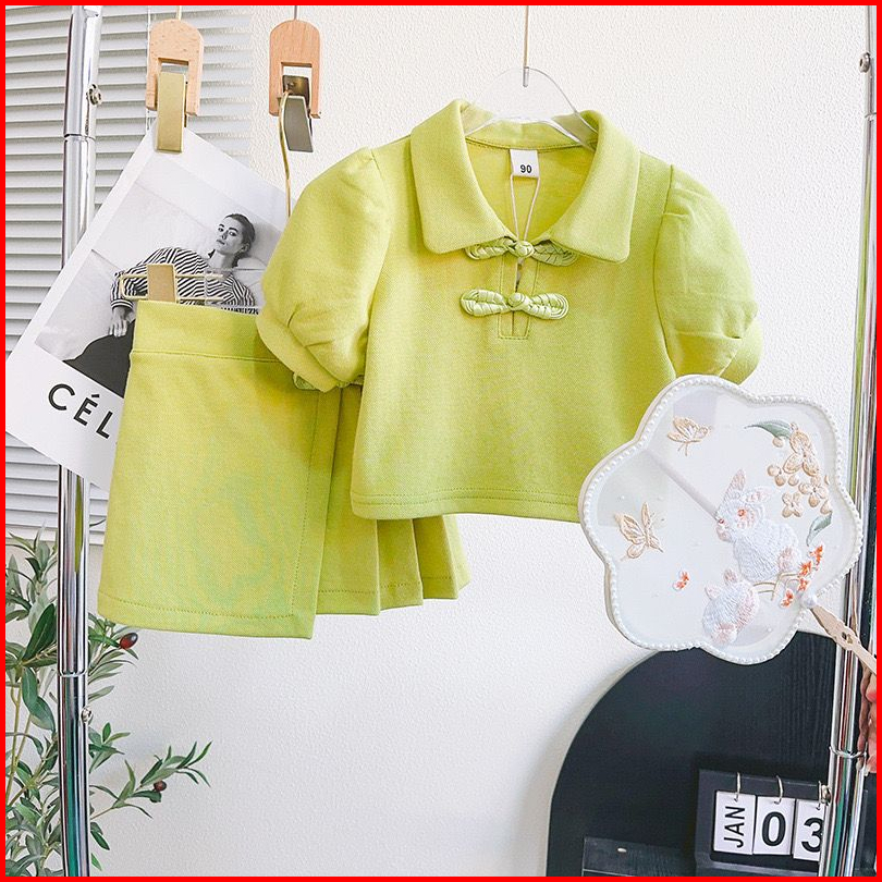 Kidsfashionkoleksi Setelan Anak Perempuan Polo Polos Mini Rok Motif Kancing Kepang Pink Dan Hijau