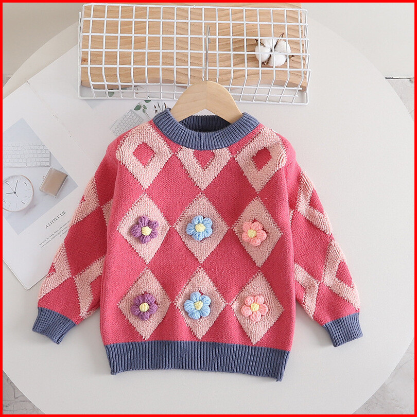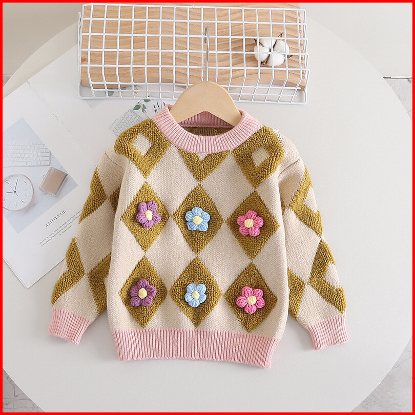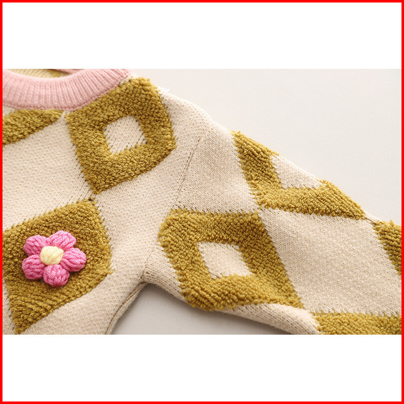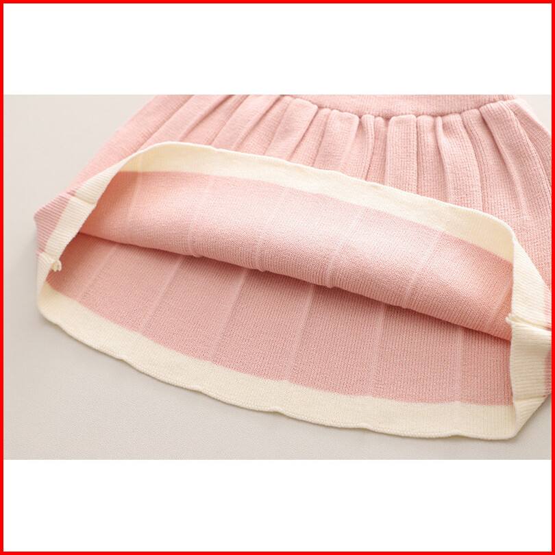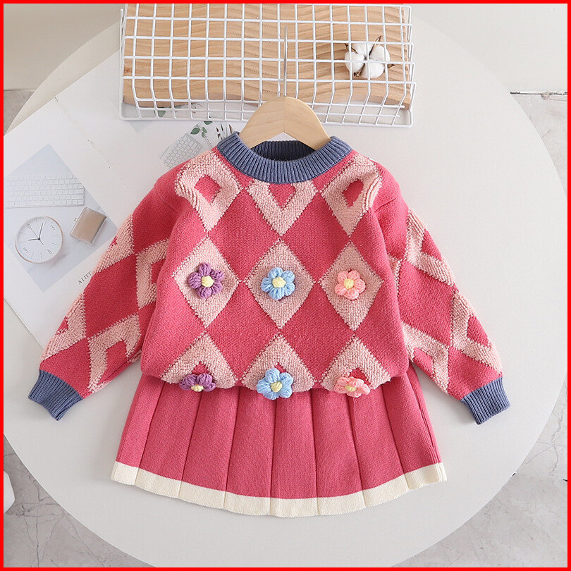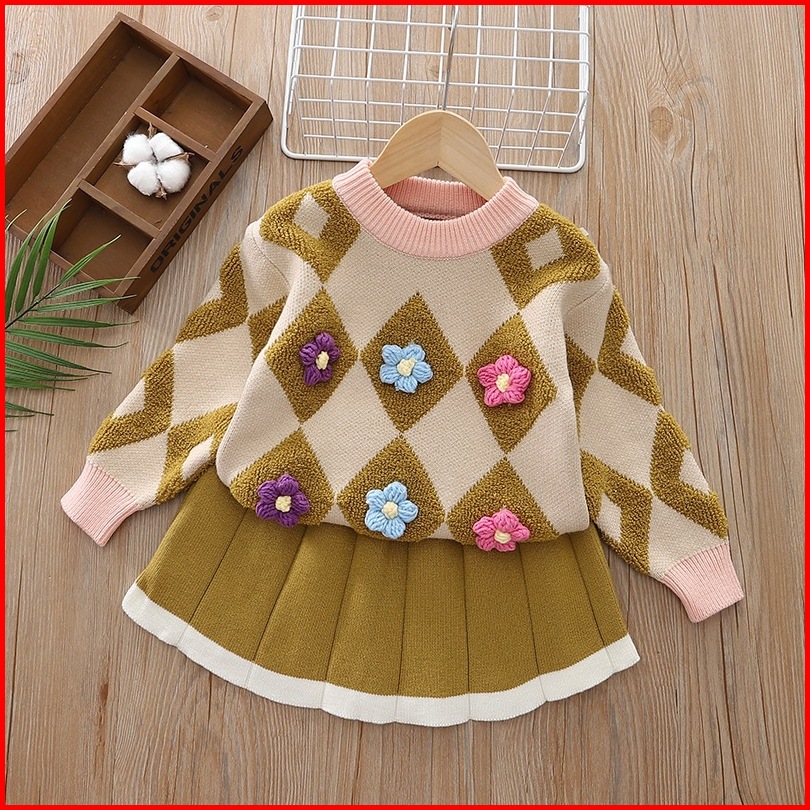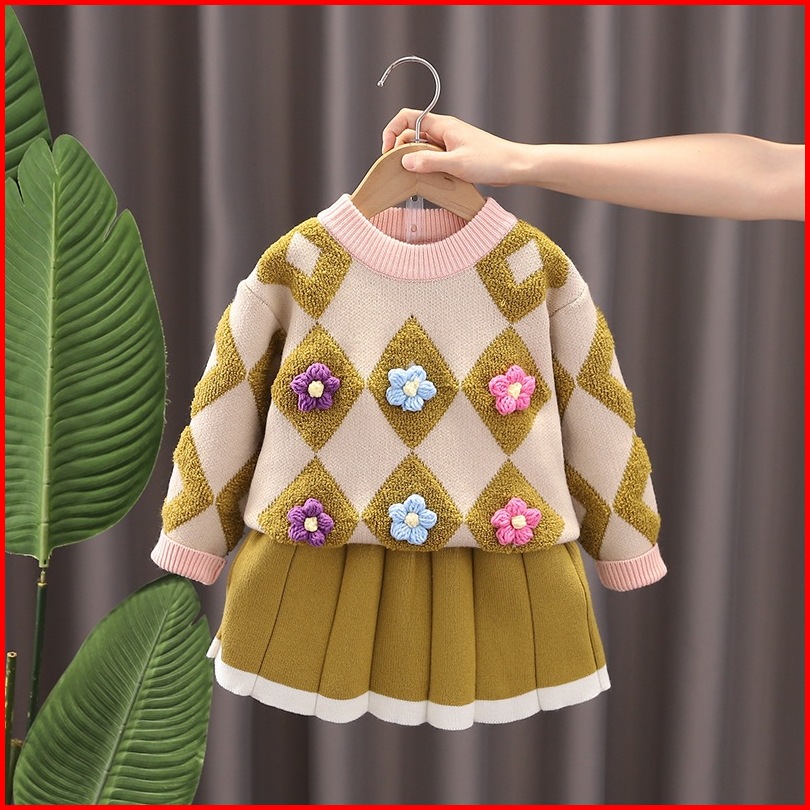 Setelan Anak Perempuan Import Model Rok Mini Variasi Sweater Rajut 3 Warna Bunga Tebal Plisket