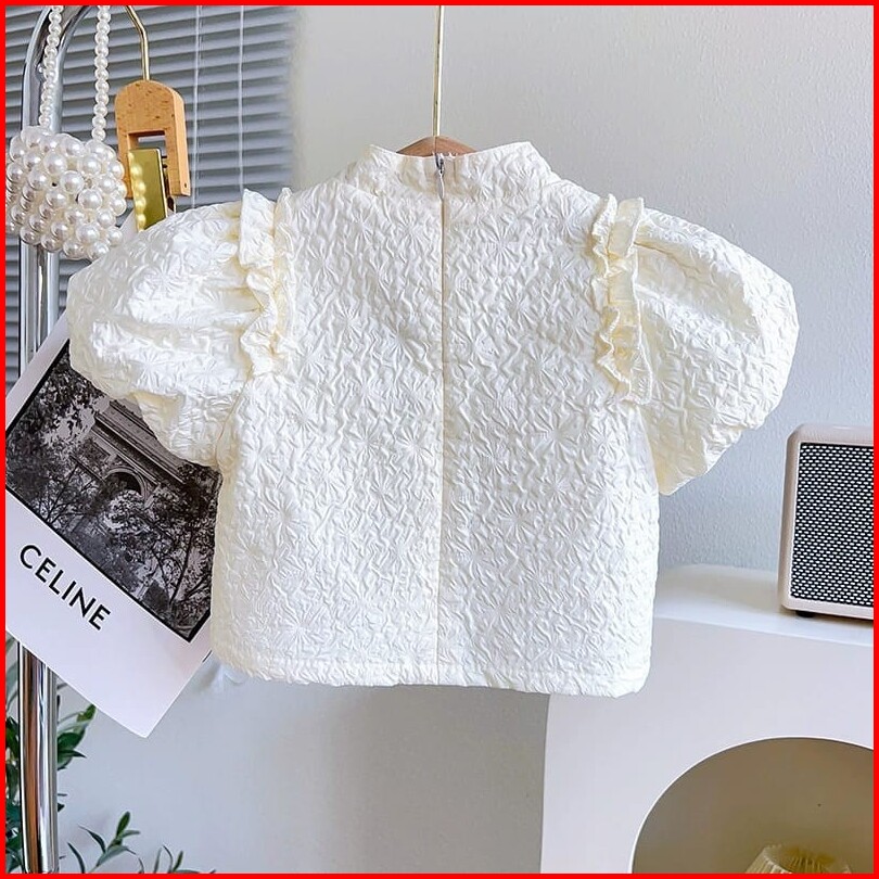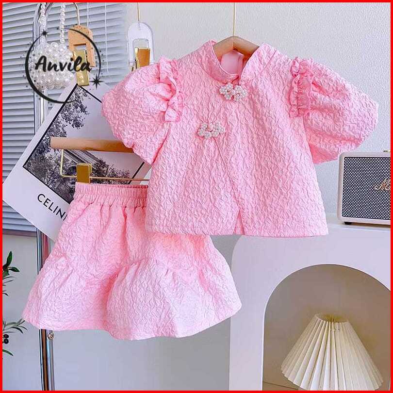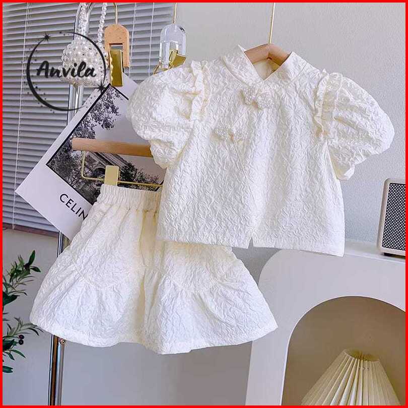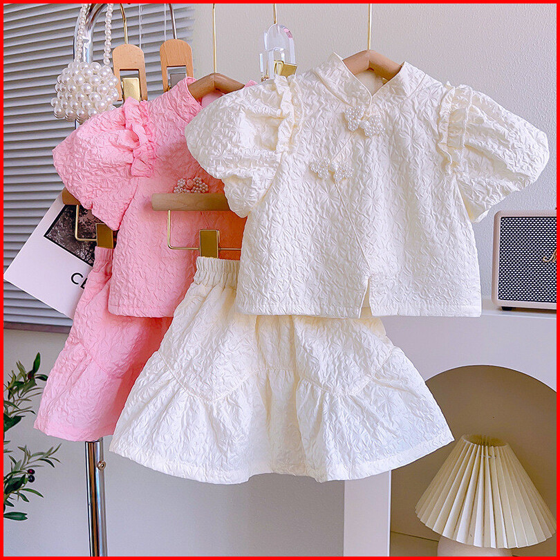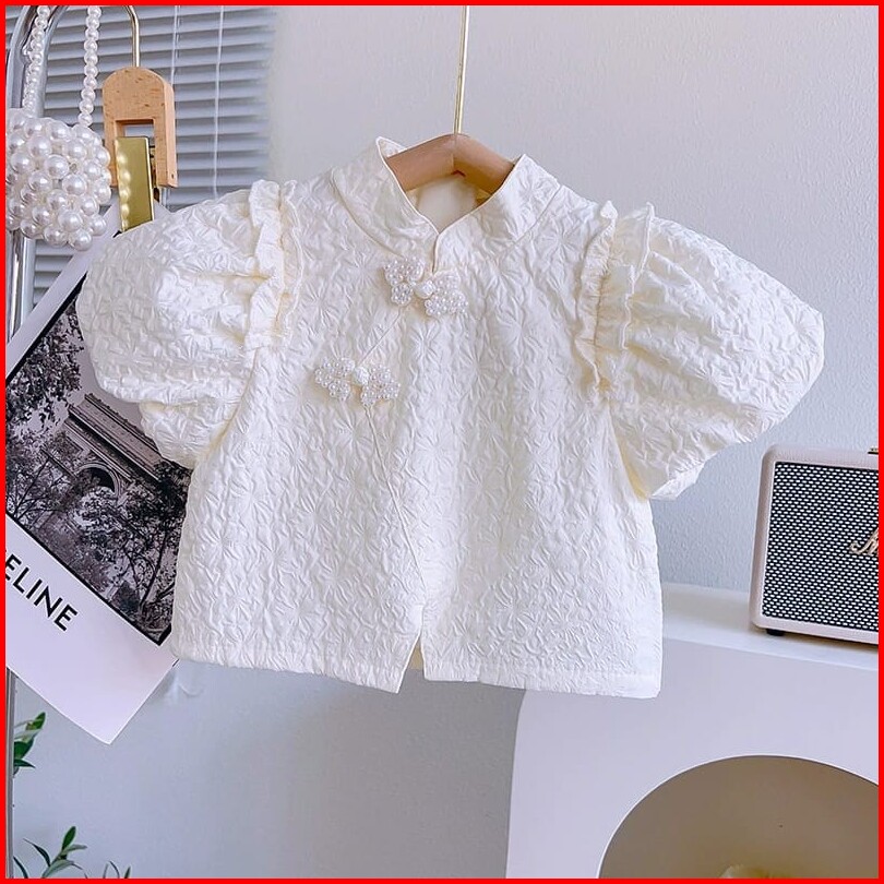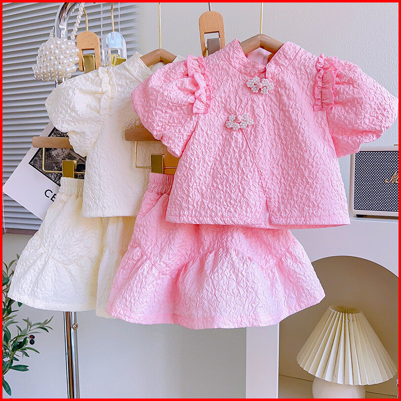 Setelan Anak Perempuan Cheongsam Import Mini Rok Variasi Lengan Puffy Crinkle Renda Pita Terbaru