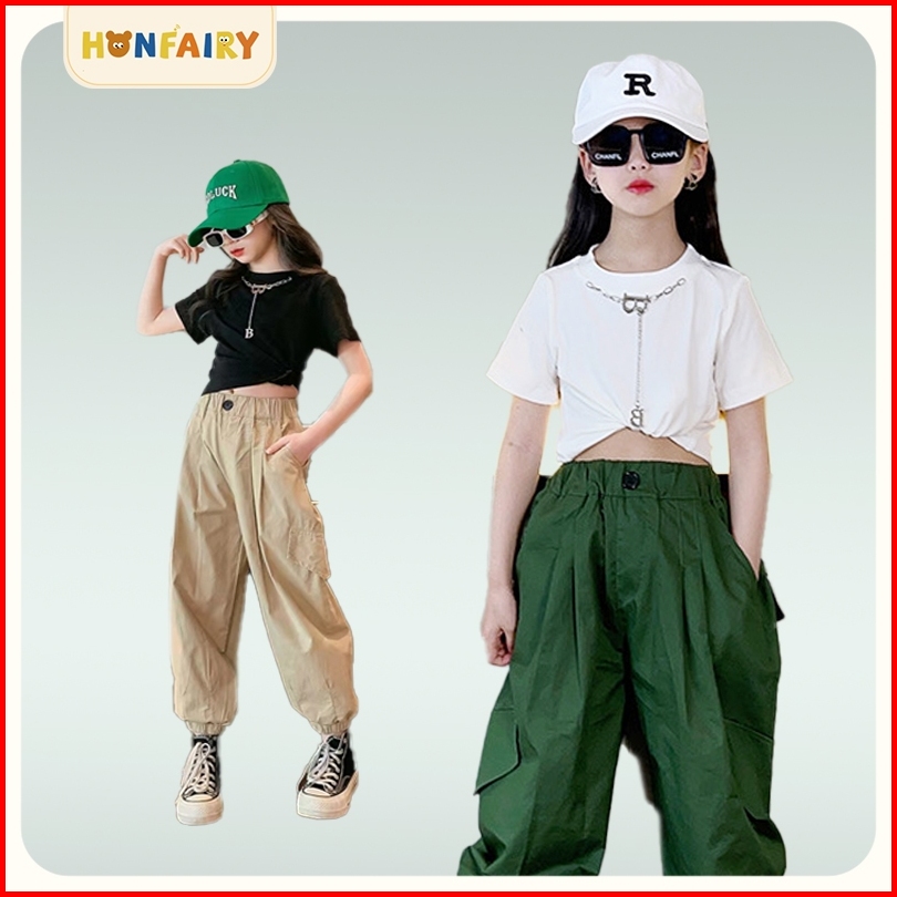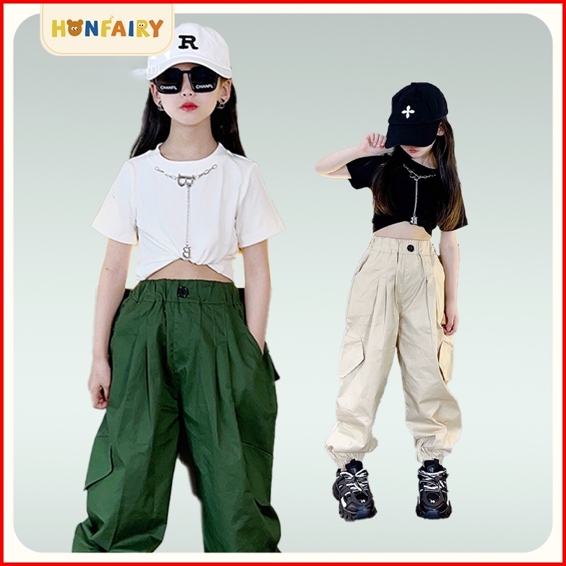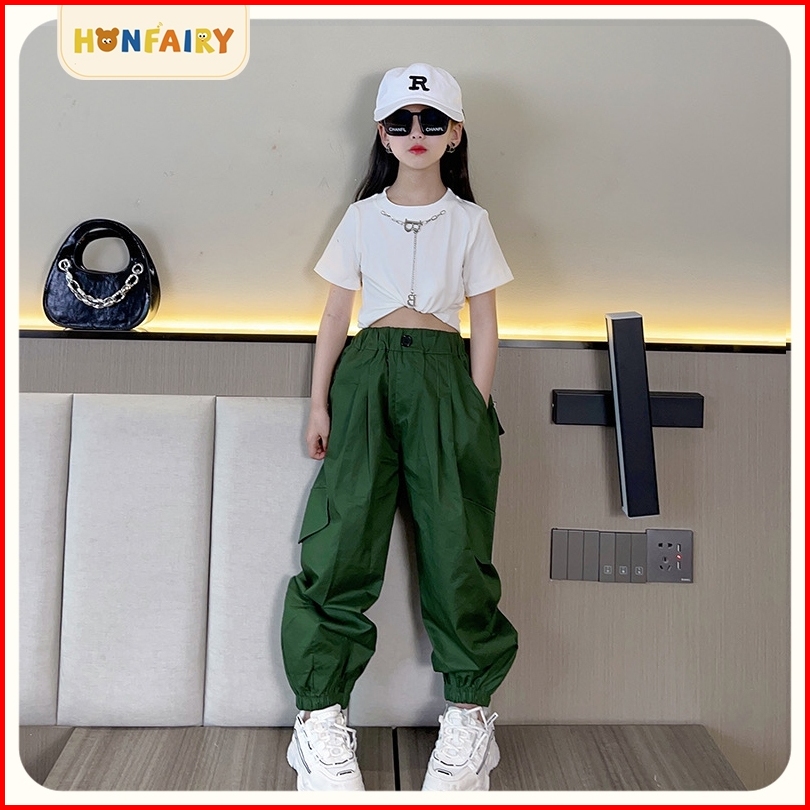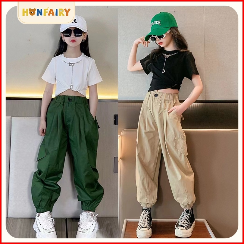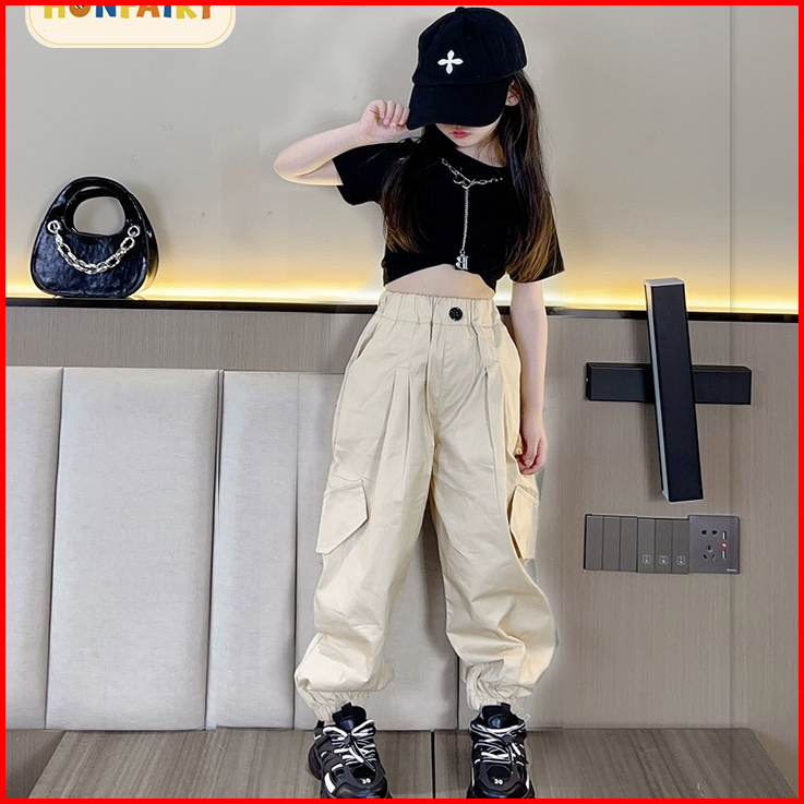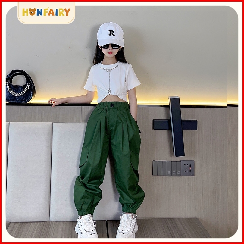 Honfairy Setelan Cargo Anak Perempuan 3-8 Tahun Celana Training Hip Hop Grafiti - Bahan Cepat Kering Celana Panjang Sete