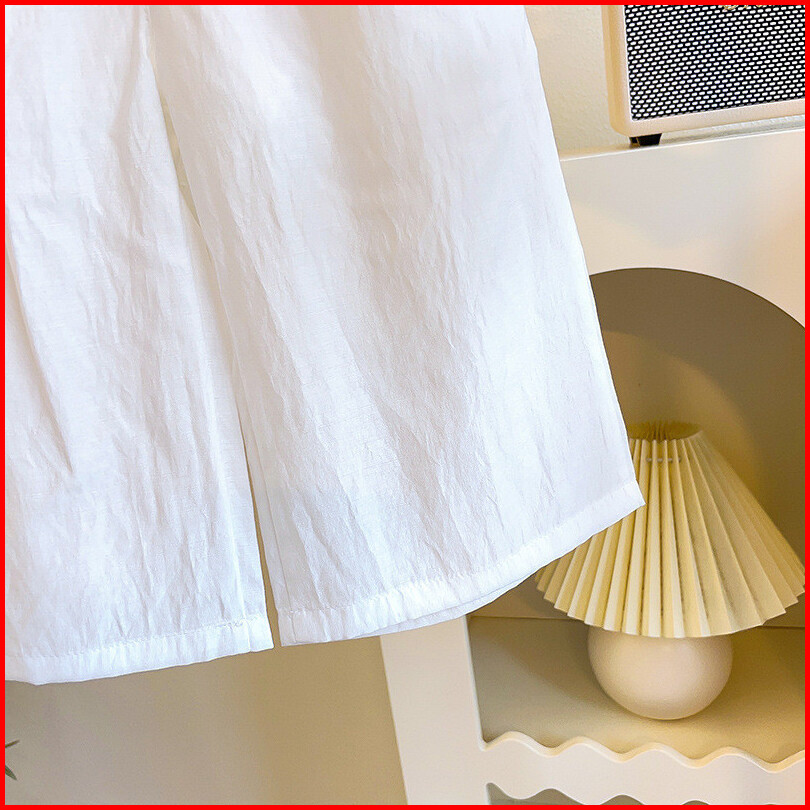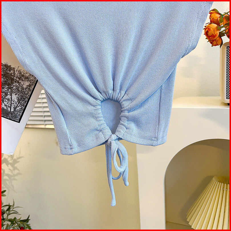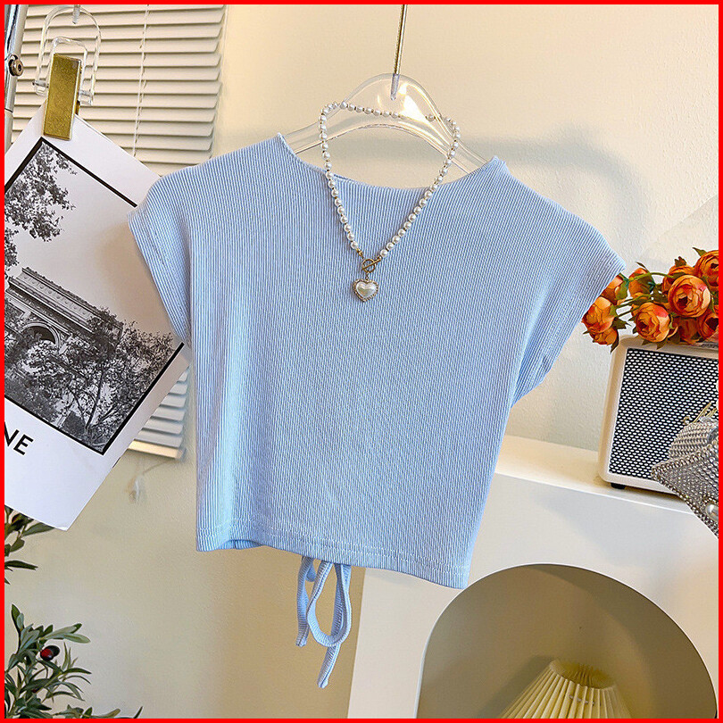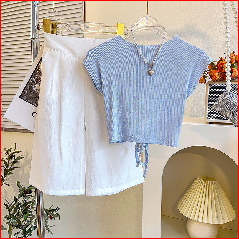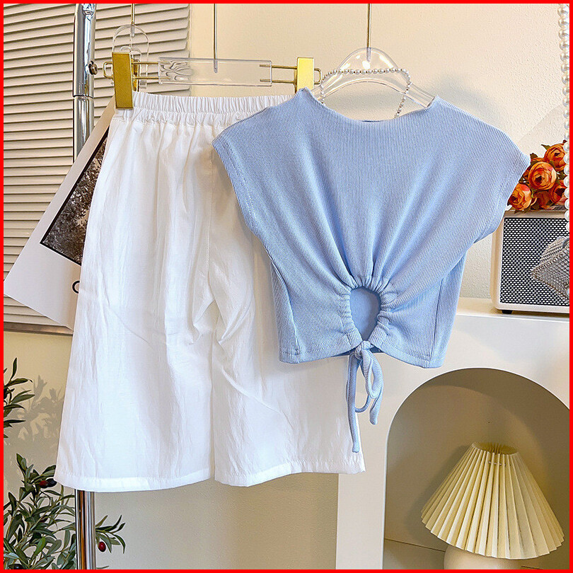 Setelan Anak Perempuan Import Model Rib Knit Tali Serut Belakang Kulot Kantong Lengan Pendek Terbaru