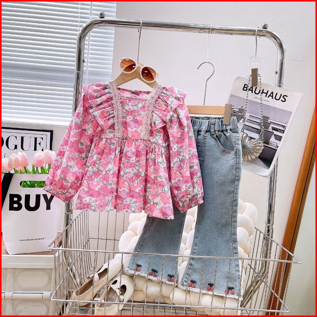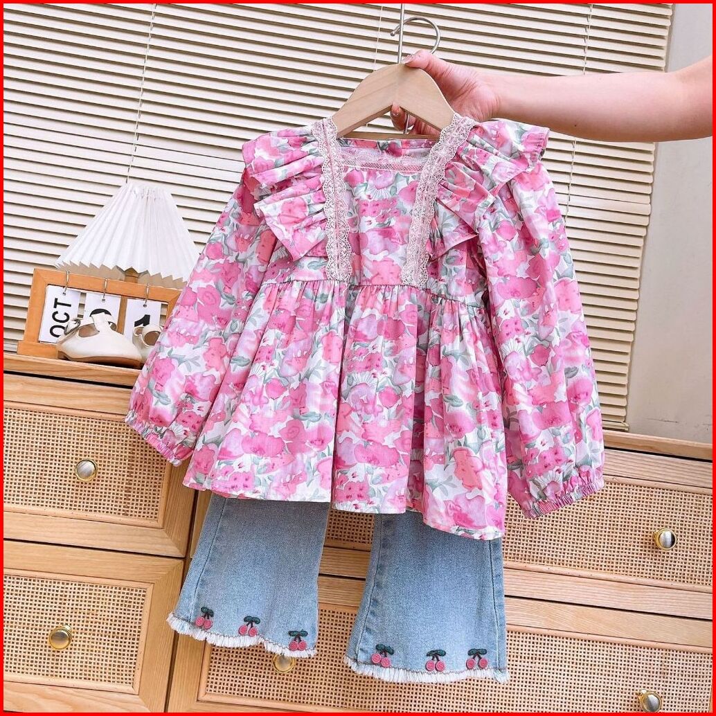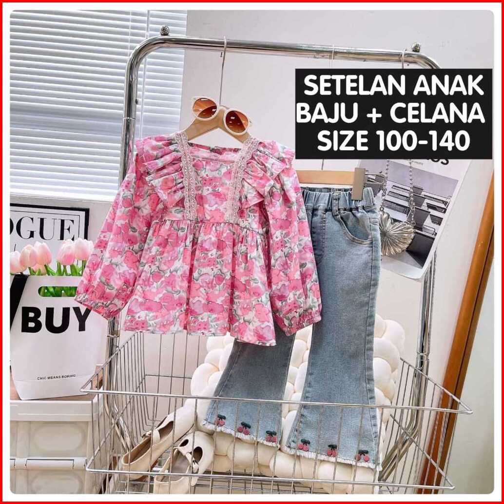 Loli-jkt Bs- 743 Setelan Anak Blouse Pink Full Bunga Celana Cherry Jeans Panjang Size 100-140