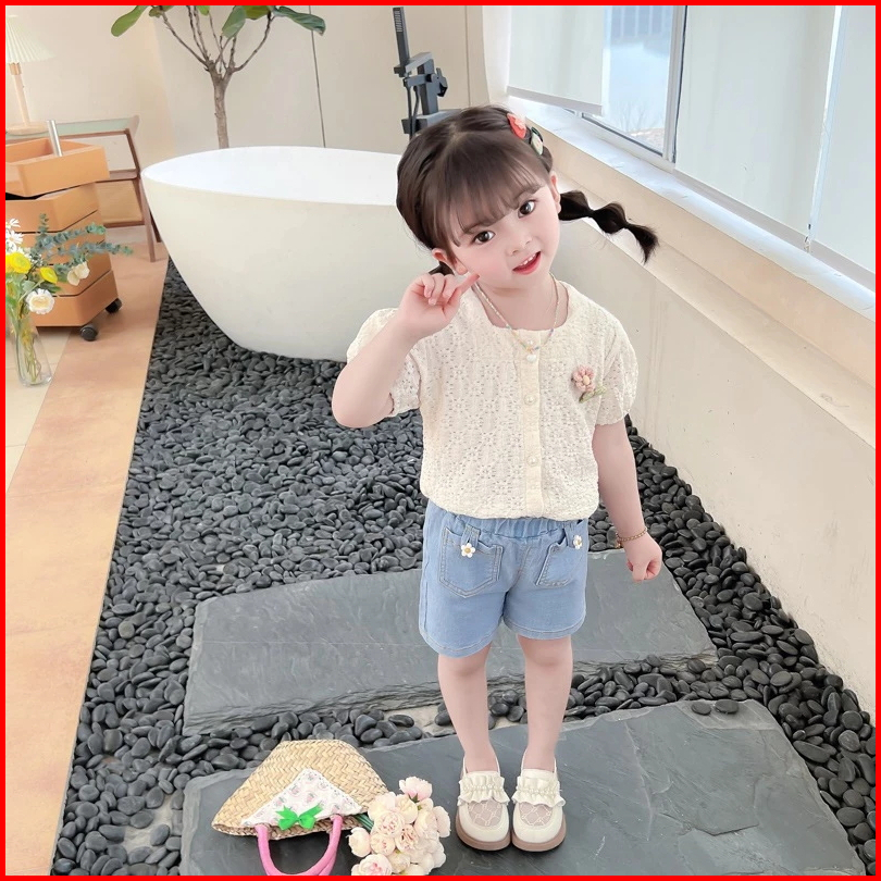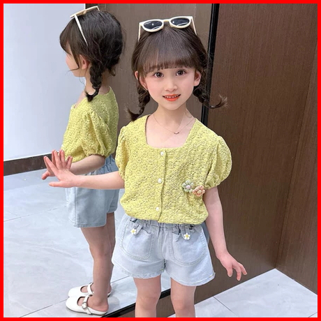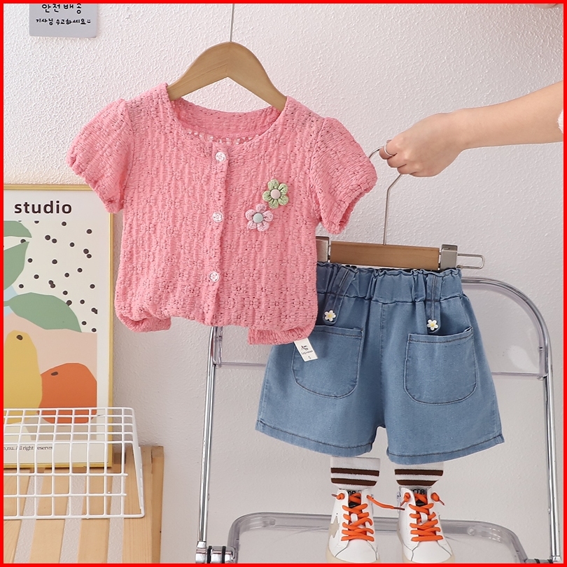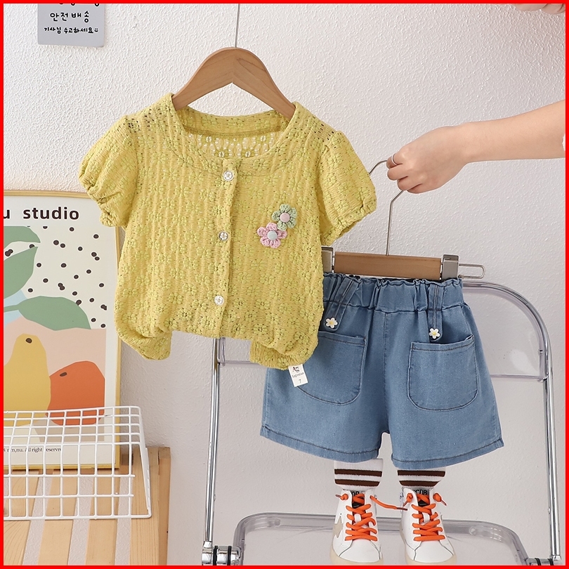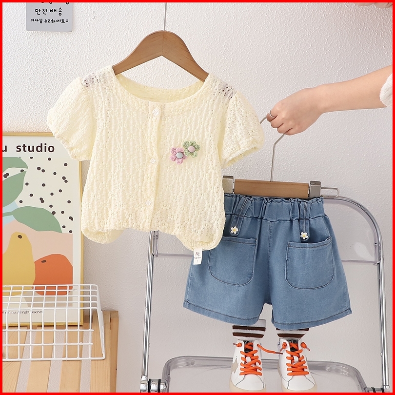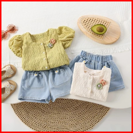 Rainbow Setelan Baju Anak Perempuan Kemeja Lengan Pendek Dan Celana Pendek Denim Setdua Potong Casua