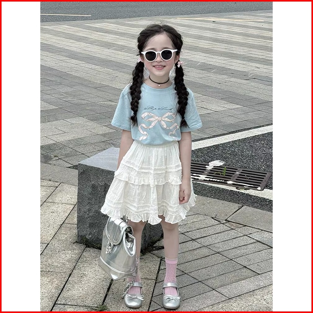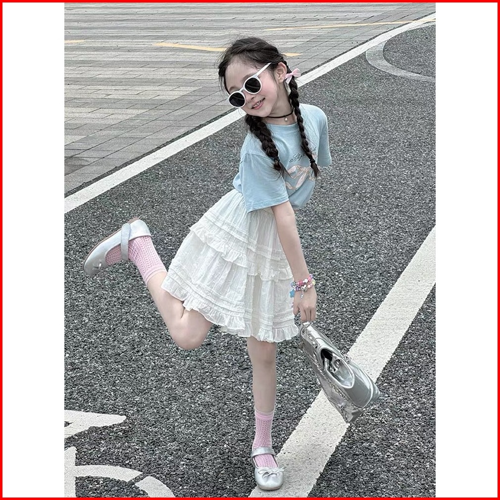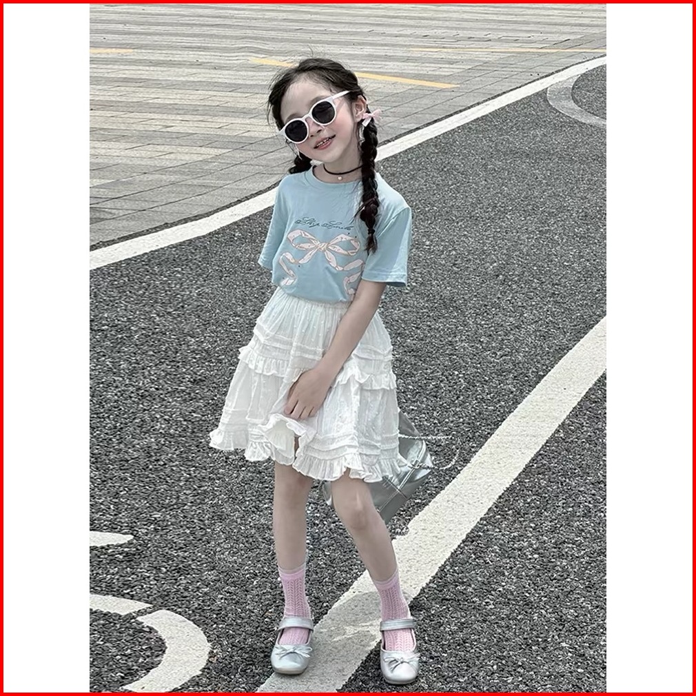 Korean Style Setelan Fashion Kupu-kupu Huruf Biru T-shirt Ballet Gaya Tutu Putri Pleated Skirt