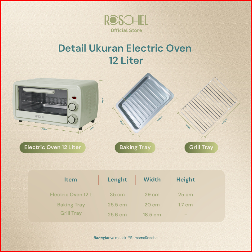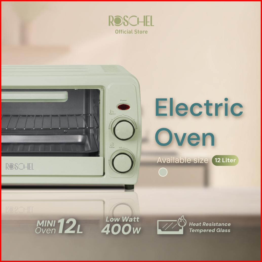 Roschel Electric Oven Low Watt 400 W Kapasitas 12 L Hemat Listrik Pemanas Ganda Atas Bawah Stainless Steel Pemanggang Ku