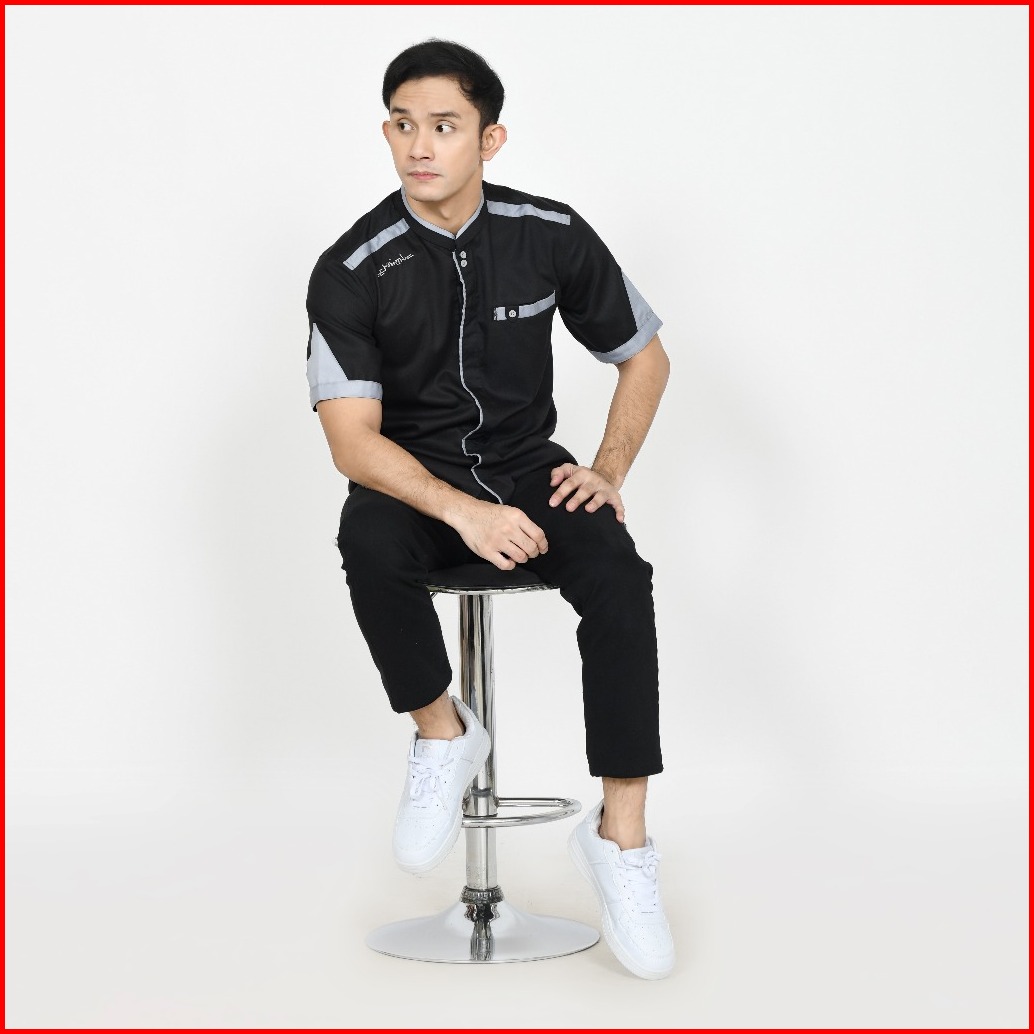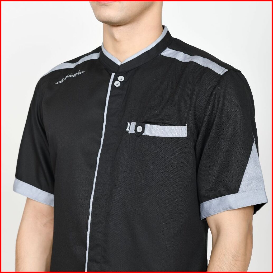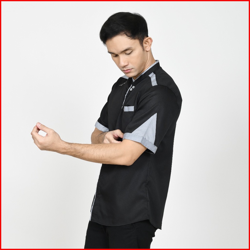 Baju Koko Pria Dewasa Lengan Pendek Warna Hitam Motif Yisunsin Kombinasi Bordir Elrumi Katun