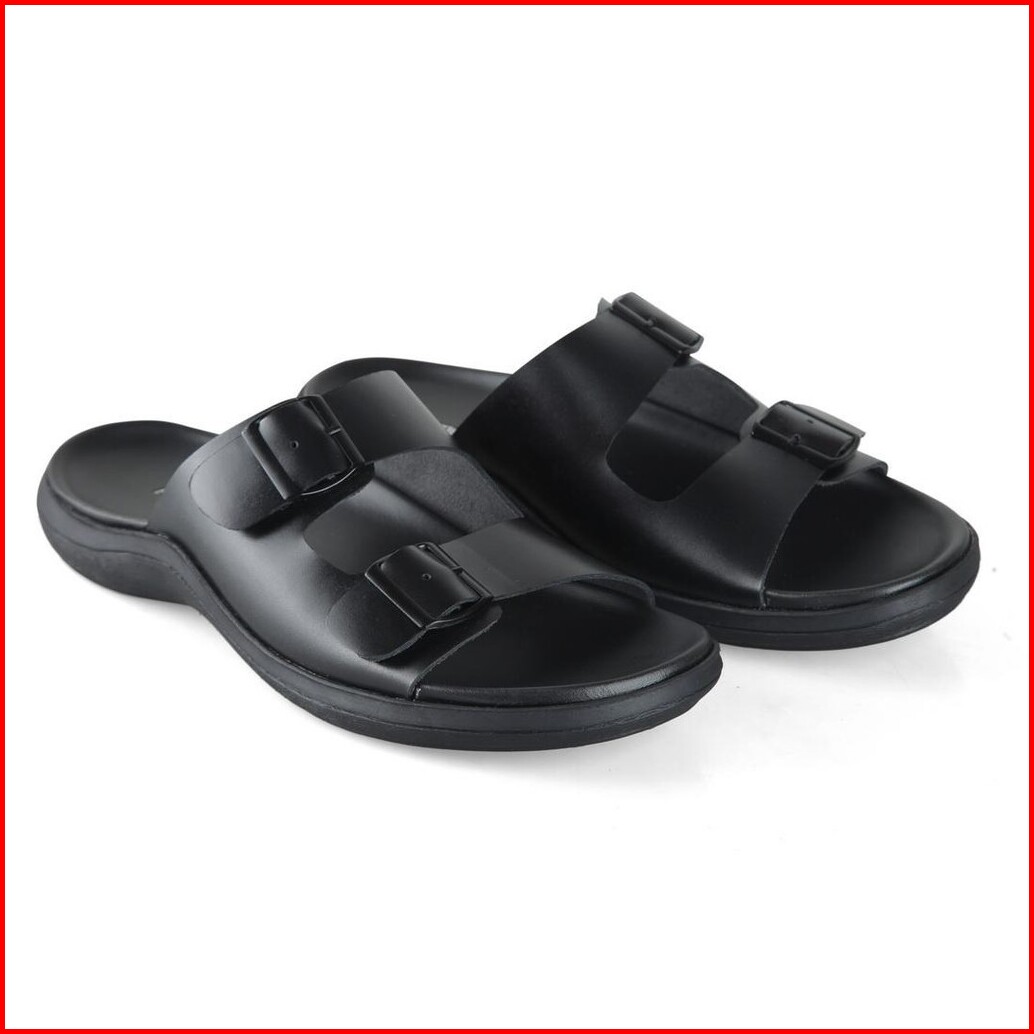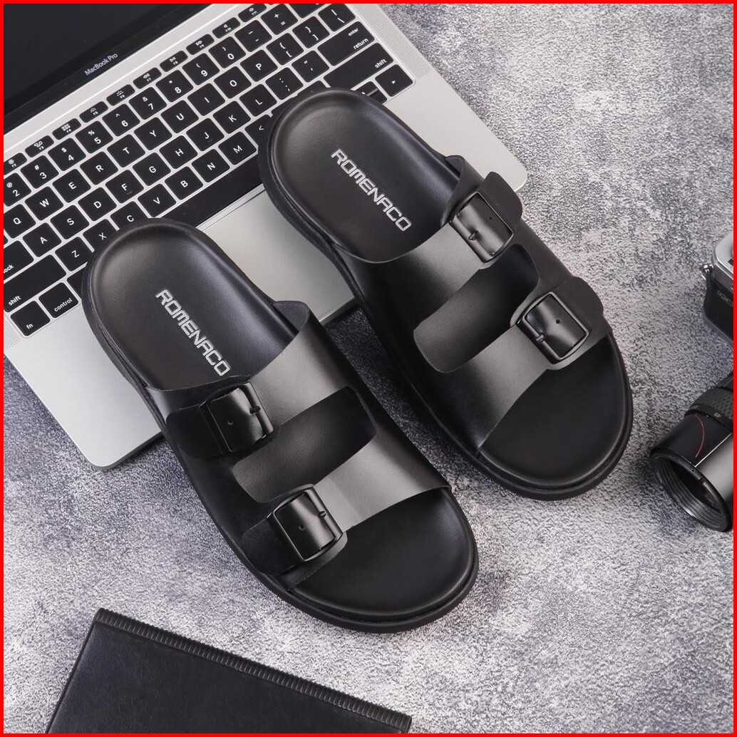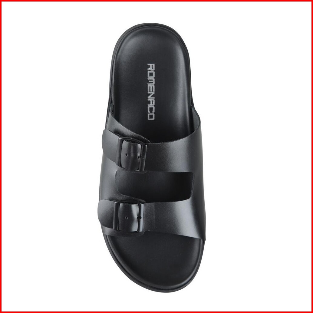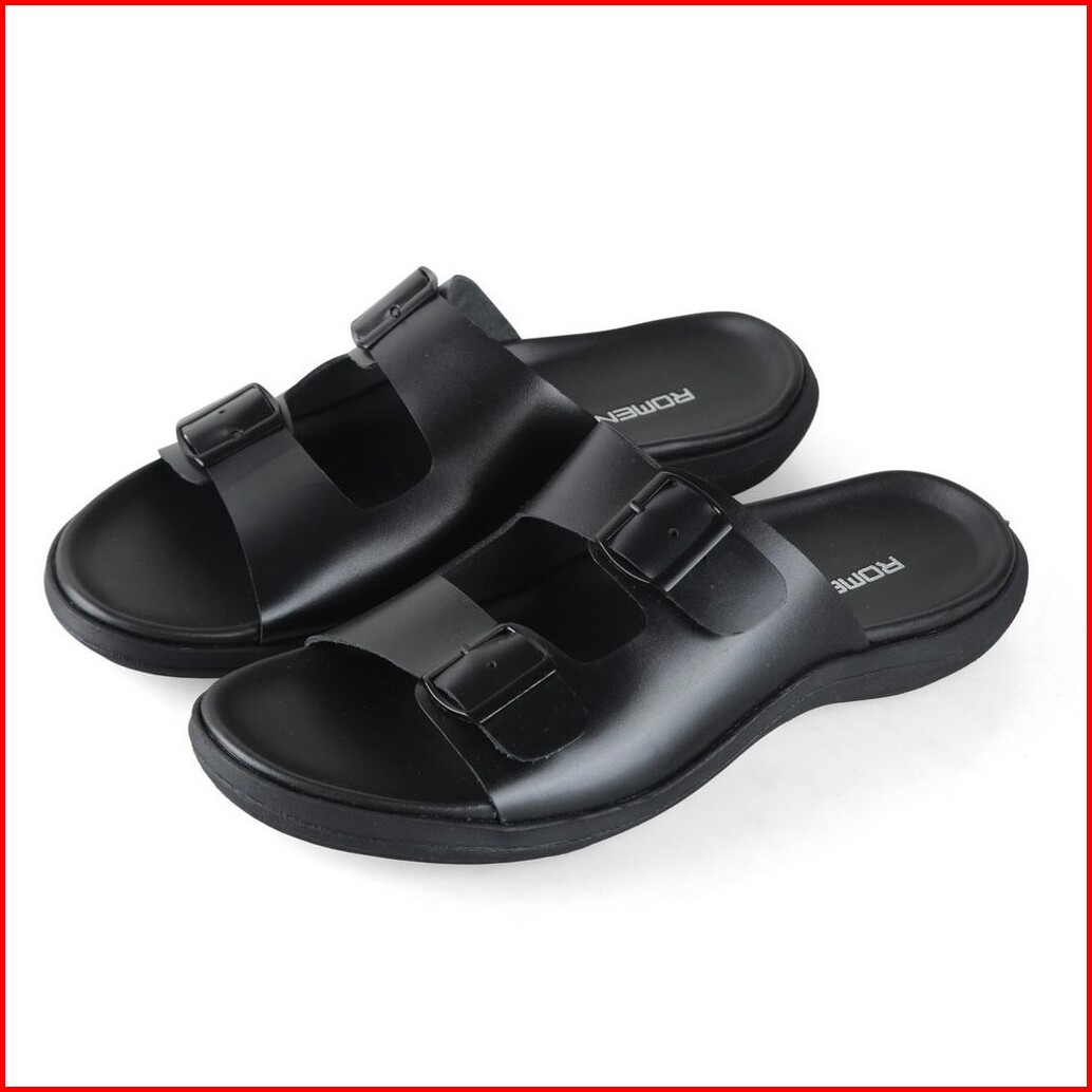 Romenaco Sandal Pria R005c - Upper Kulit Sapi Asli Double Straps Black Full Slip On