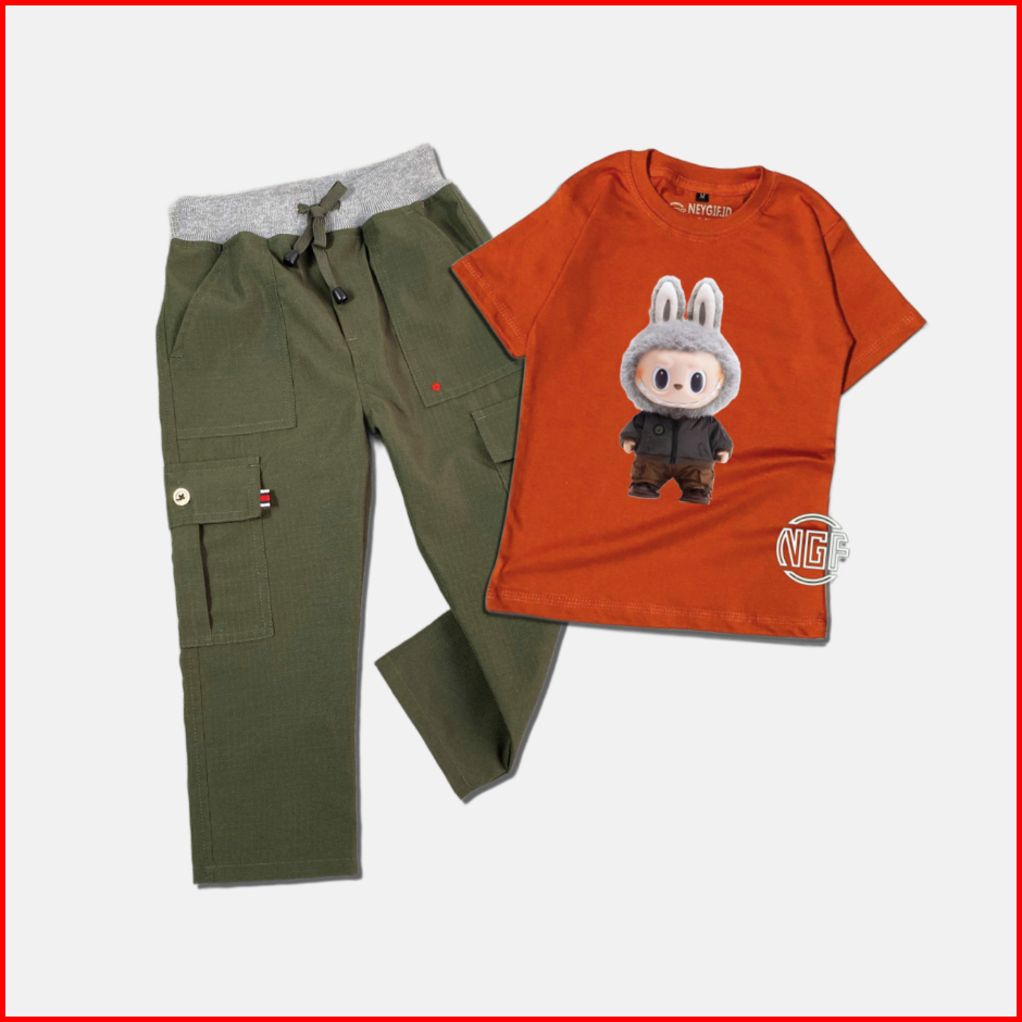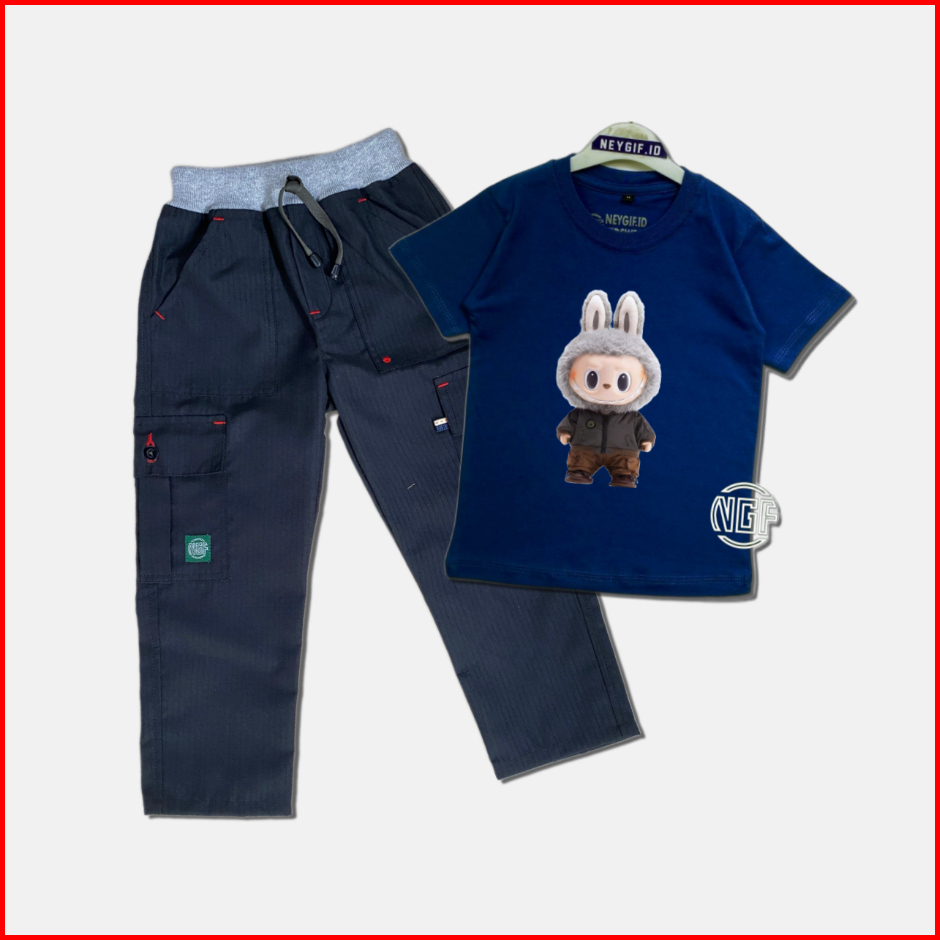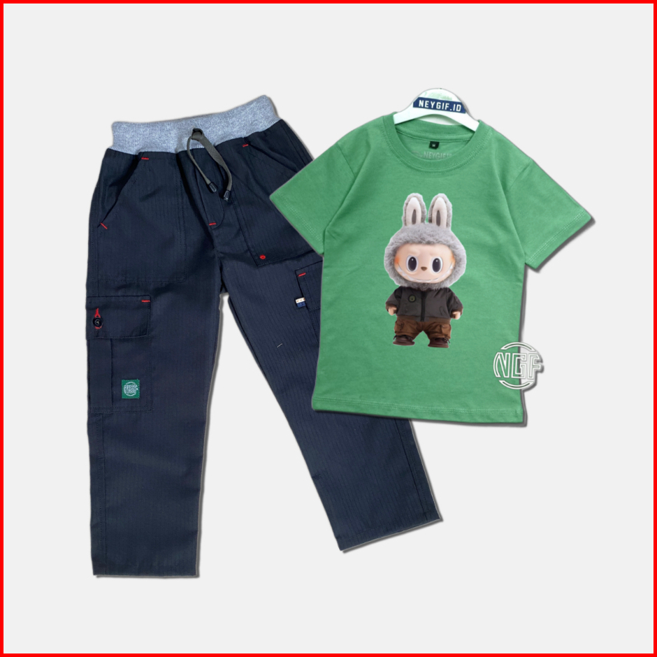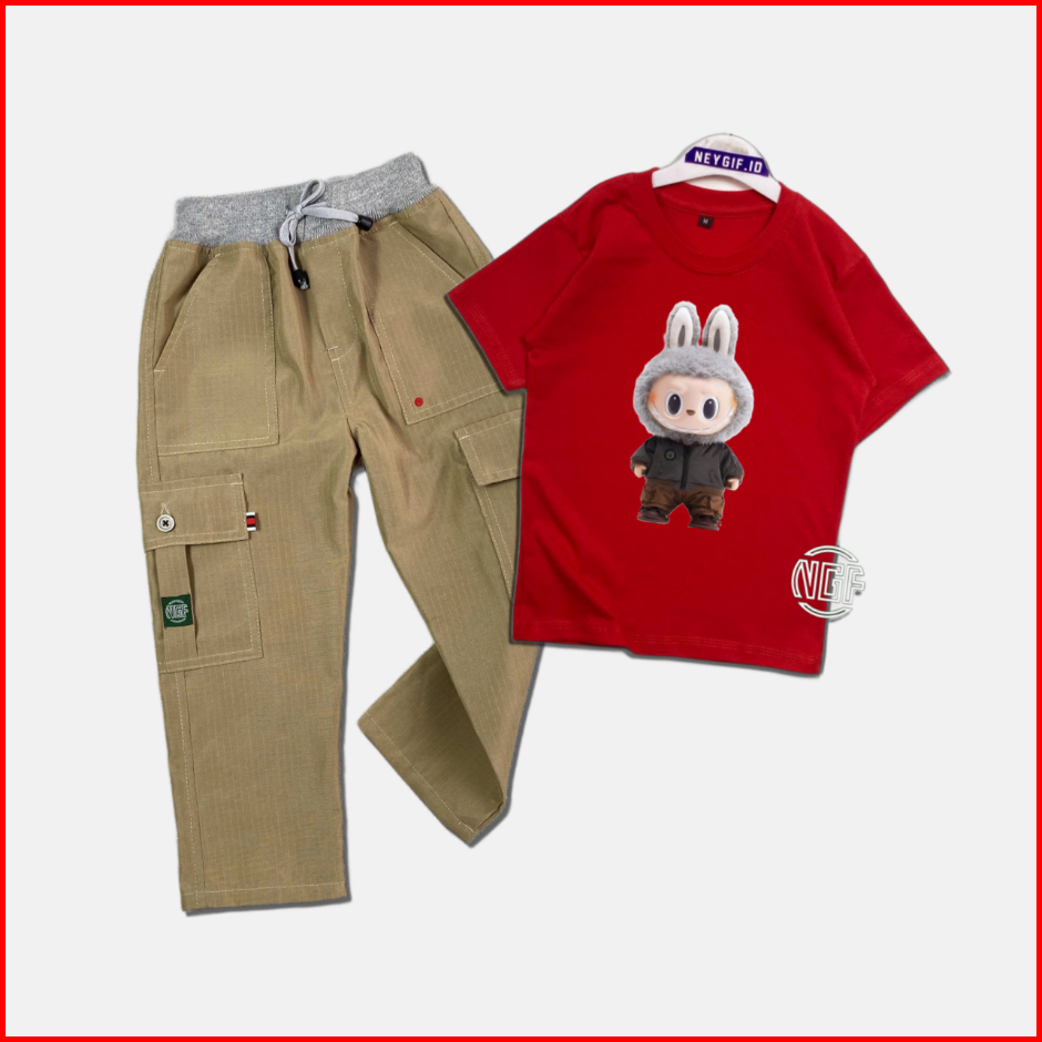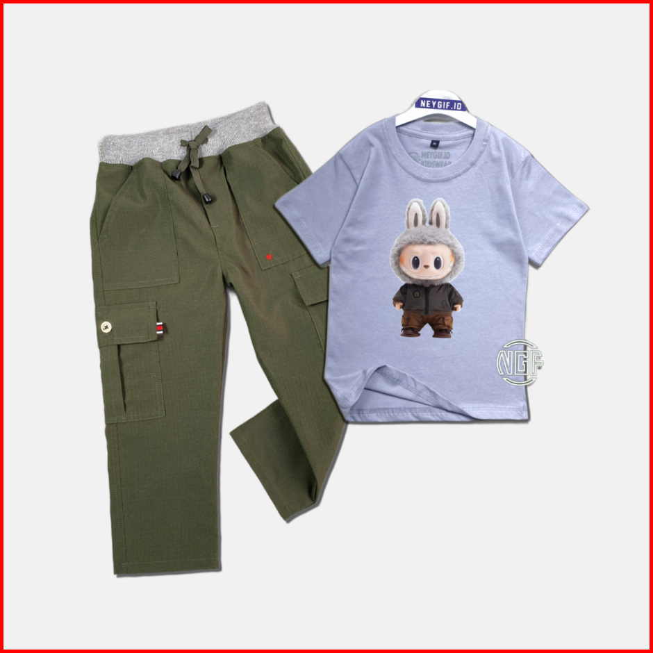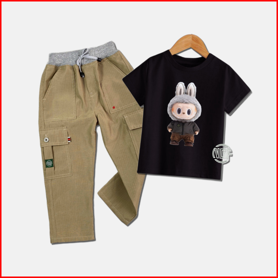 Setelan Anak Oneset Kaos Gambar Labubu Bawahan Celana Cargo Ripstok Panjang M L Xl Xxl 4-12 Tahun