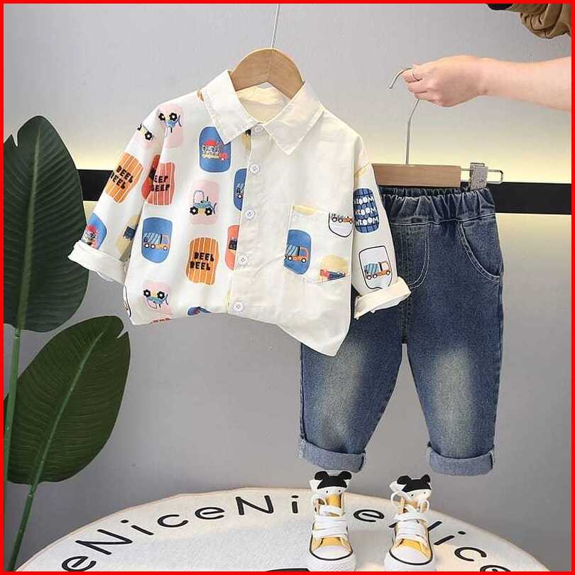 Setelan Anak Laki-laki Kemeja Motif Mobil Jeans Baju Anak 6 Bulan 5 Tahun Mazakids
