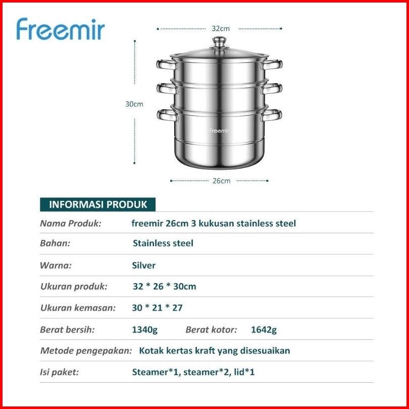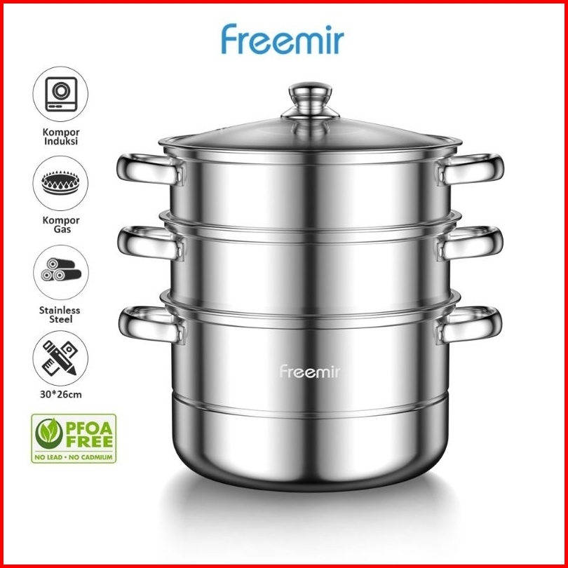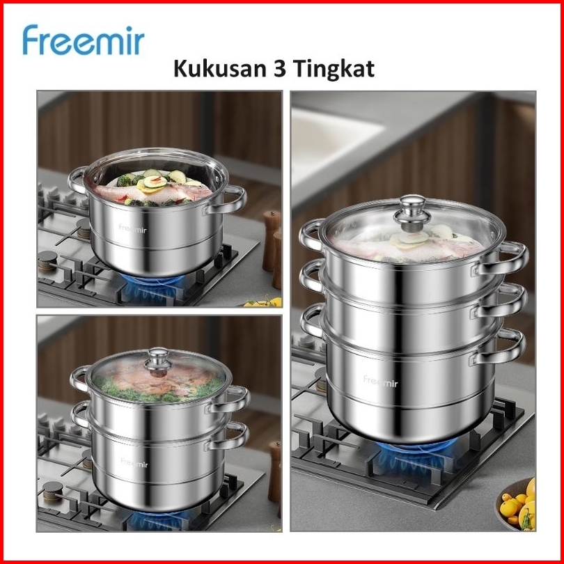 Freemir Panci Kukus Besar 3 Susun Stainless Steel Dandang Kukusan Tiga Tingkat Pengukus Multifungsi Sop Dimsum
