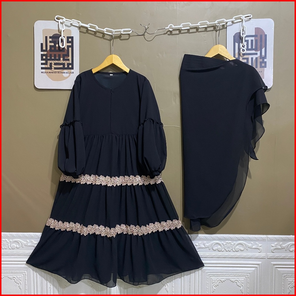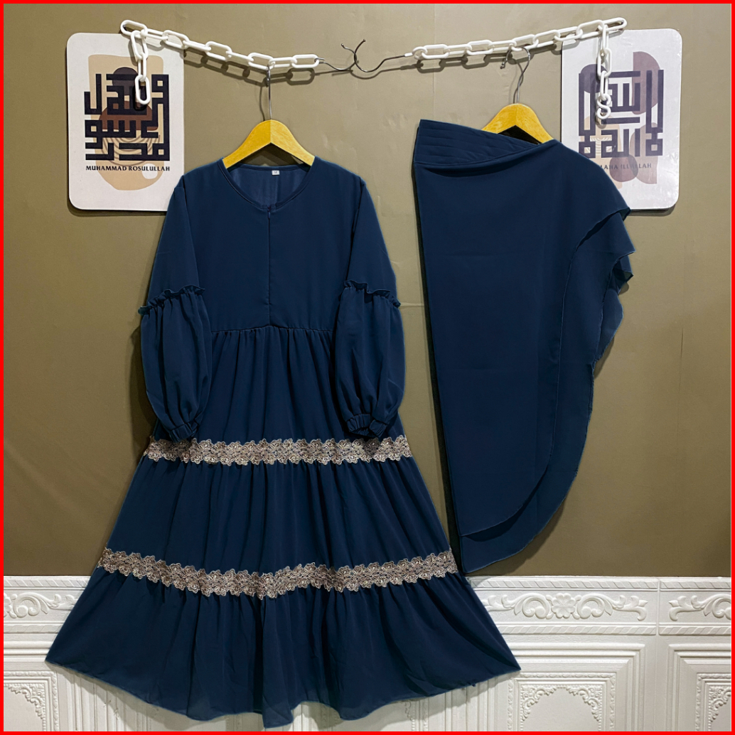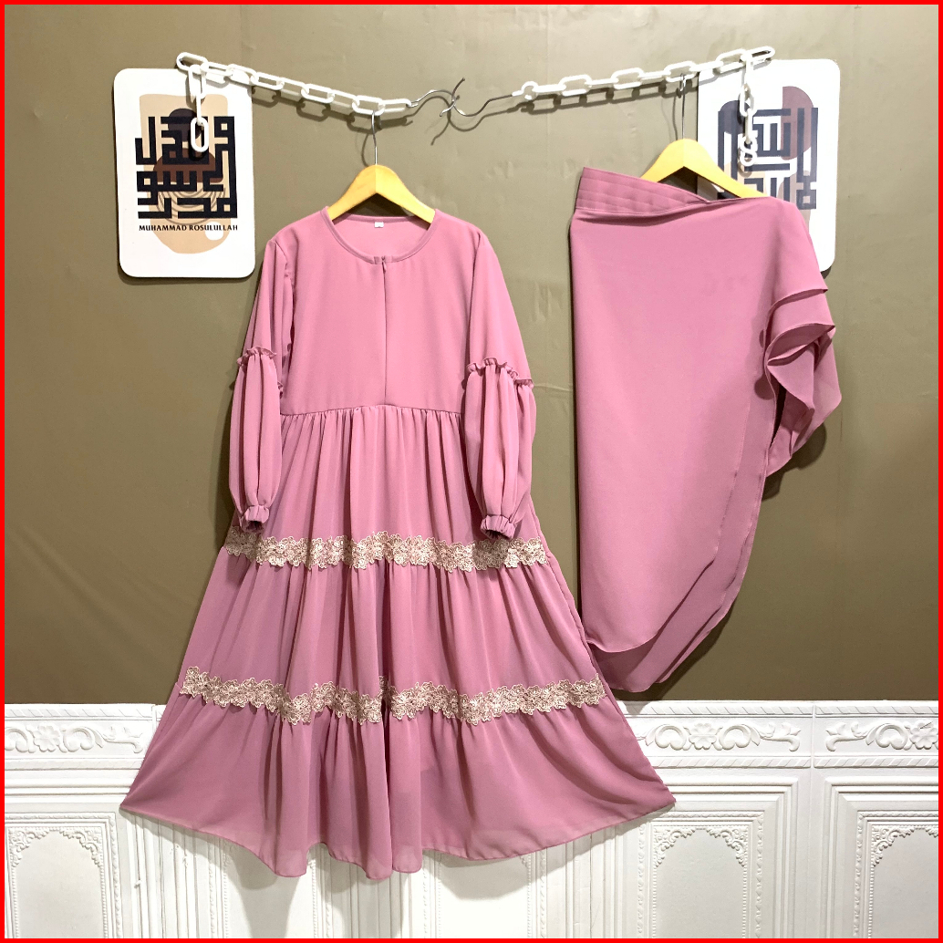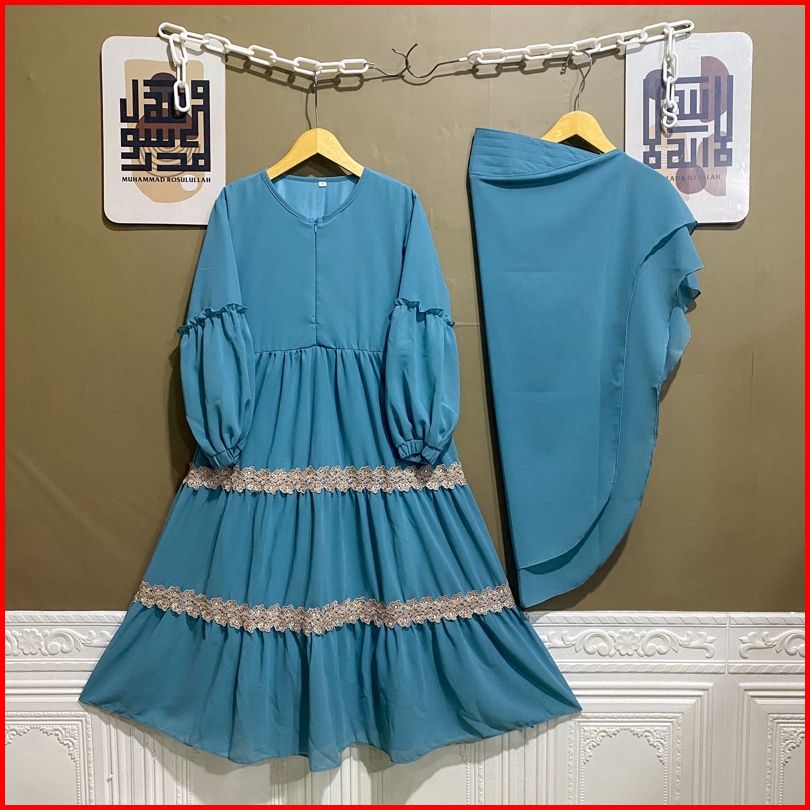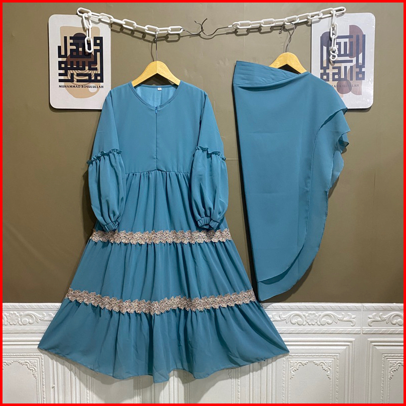 Gamis Anak Perempuan Bahan Ceruty Babydoll Dengan Renda Bunga Set Hijab