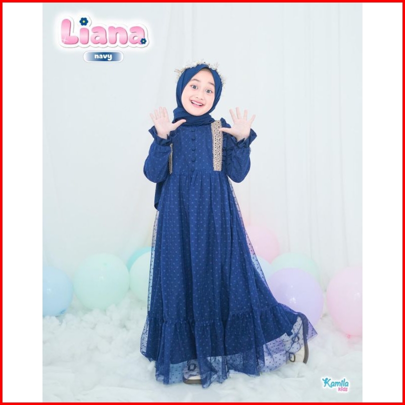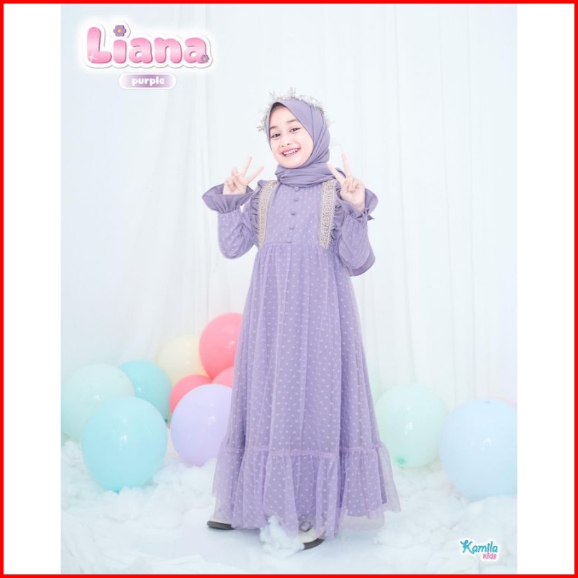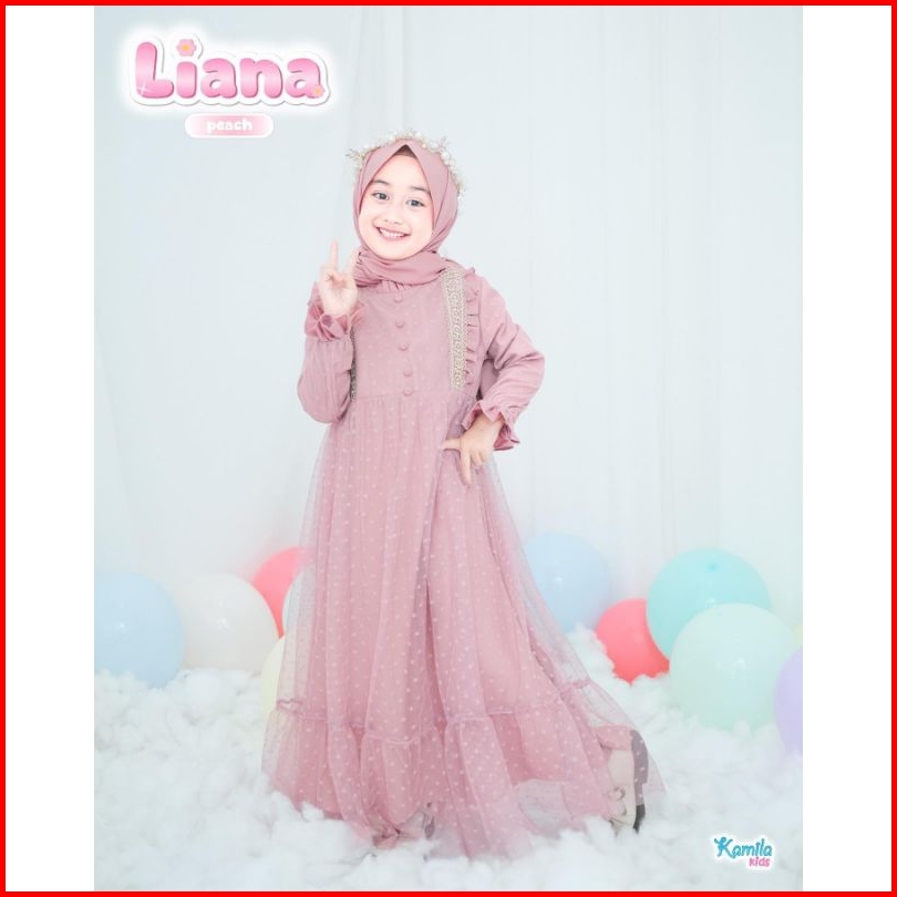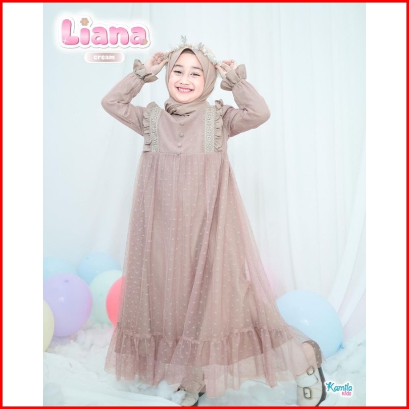 Liana Dress Kids Free Phasmina Usia 5-14 Tahun Bahan Crinkle Airflow Mix Tille Dot Gamis Anak