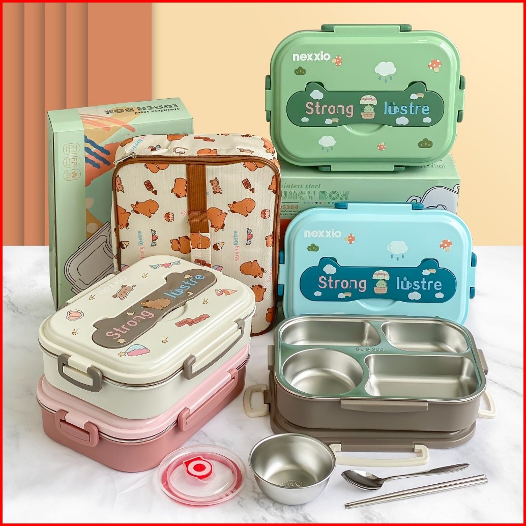 Nexxio Lunch Box Kotak Makan 3 4 Sekat Stainless Steel Tempat Bekal Stainless Set Alat Makan Anak Stainless Perlengkapan