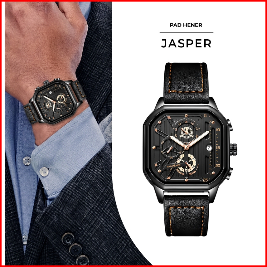 Pad Hener Jasper Jam Tangan Pria Anti Air Kulit Kuarsa Krono Jam Tangan Cowok Analog Luminous