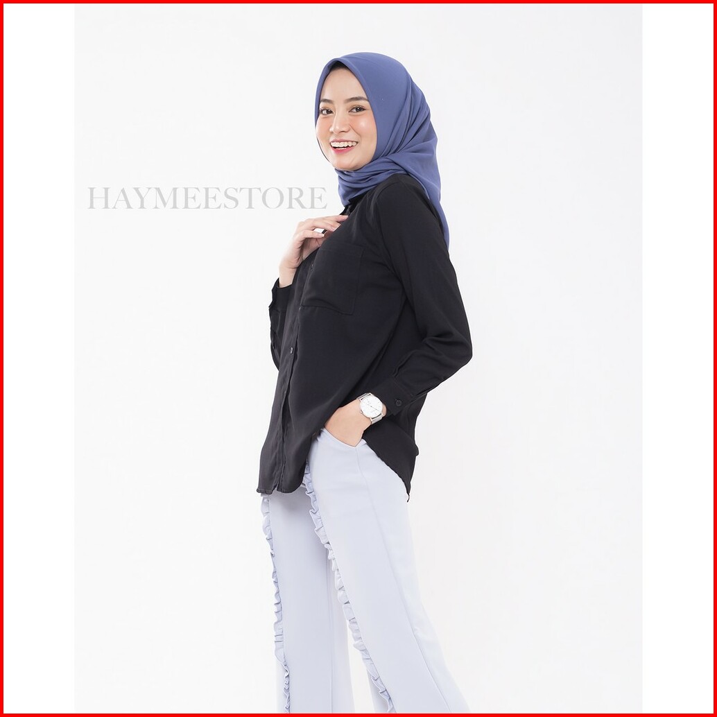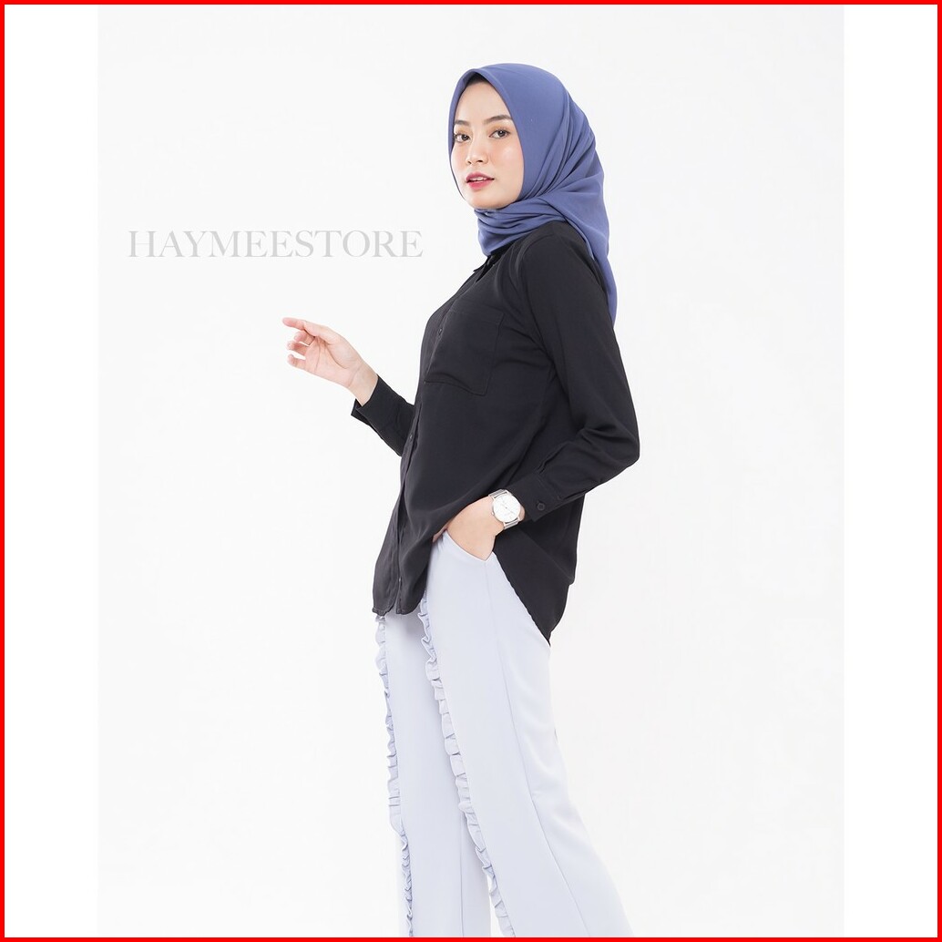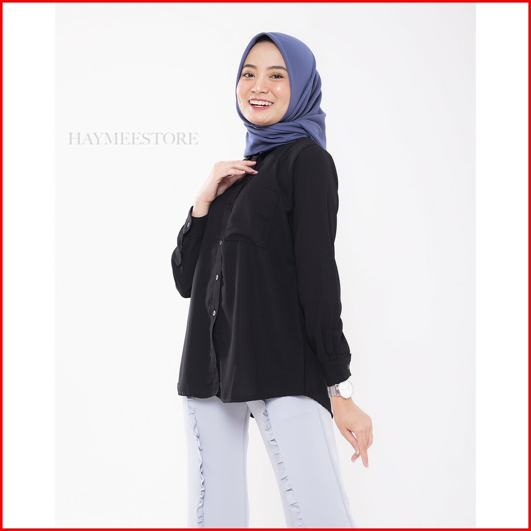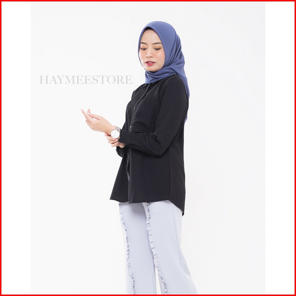Haymeeidn - Kemeja Polos Hitam Kantong Pakaian Kantor Wanita Atasan Formal