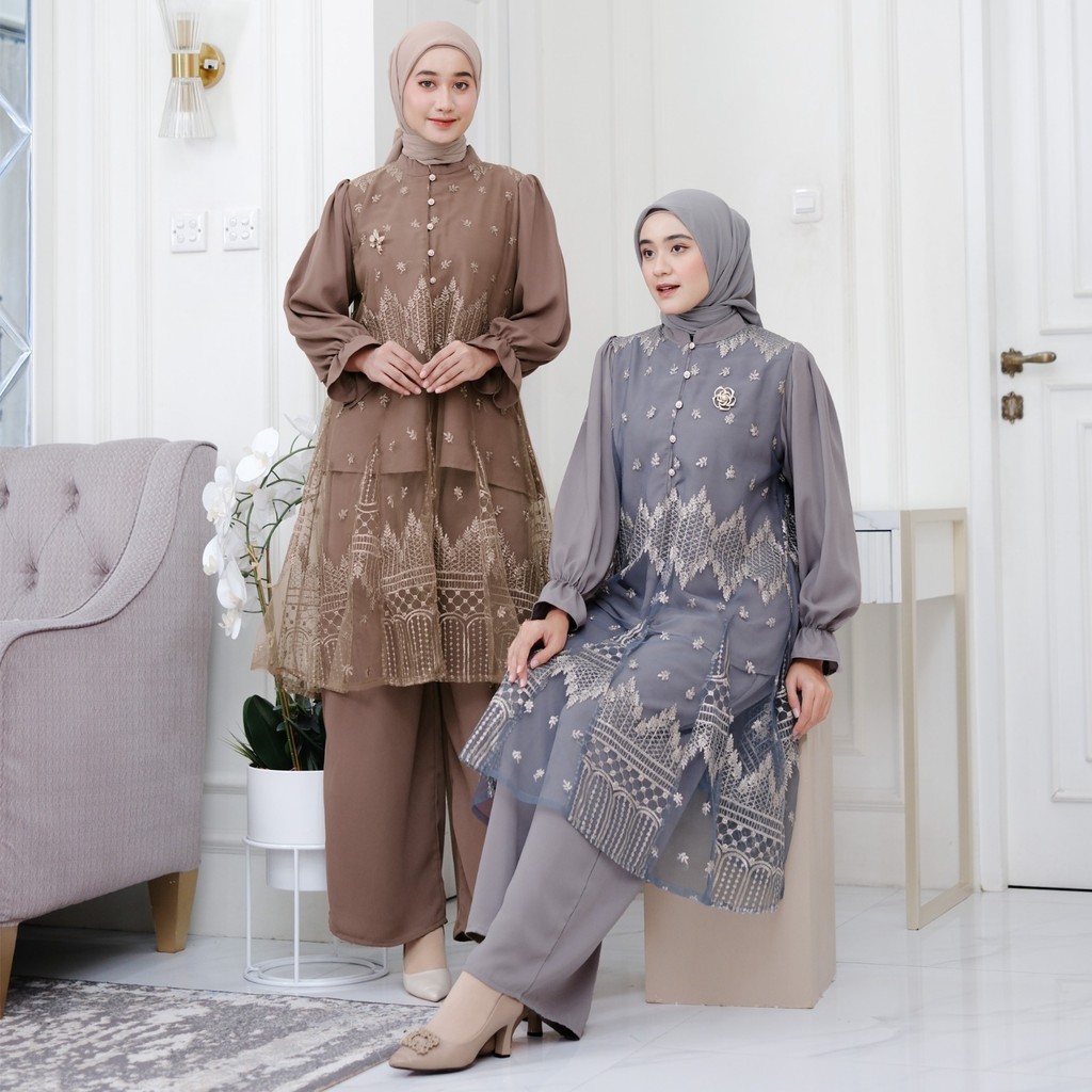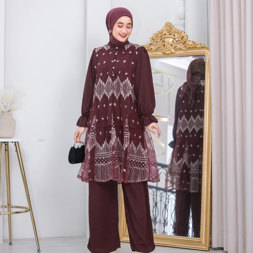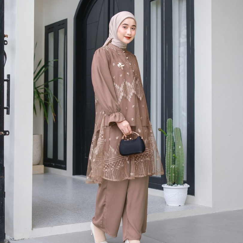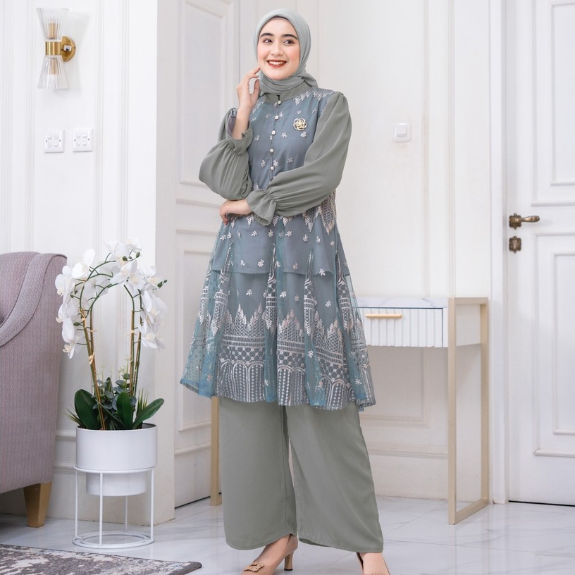 ( RAMADHAN SALE ) Ventedaily - Naeva One Set Atasan Tunik Brukat Celana Kulot Kondangan Busui Friendly