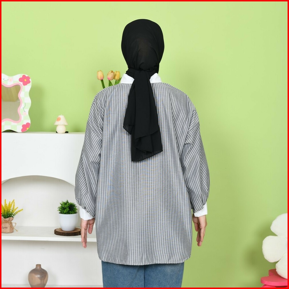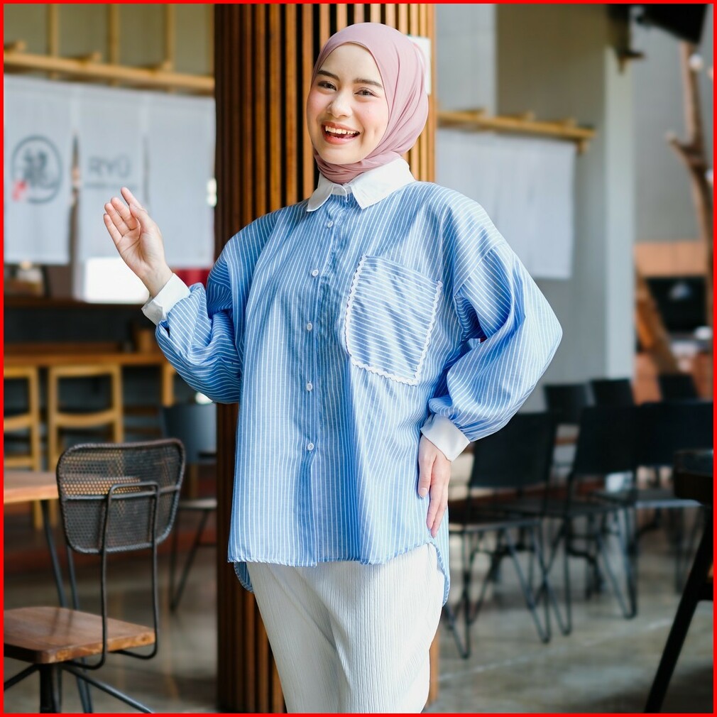 Mybamus Yemima Stripe Shirt Kemeja Oversize Korean Style Baju Kerja Salur Saku Renda Kekinian