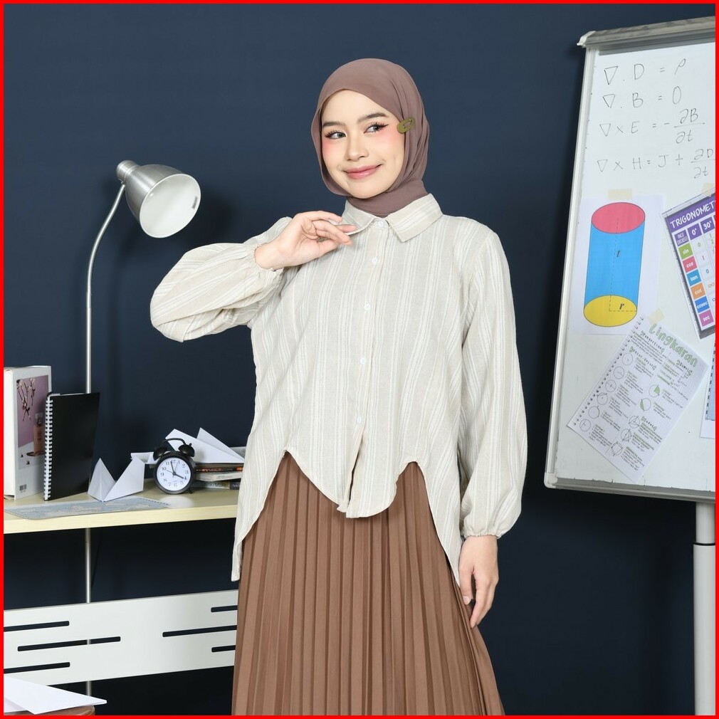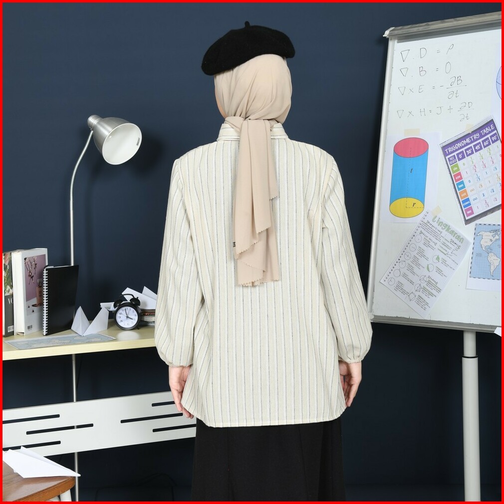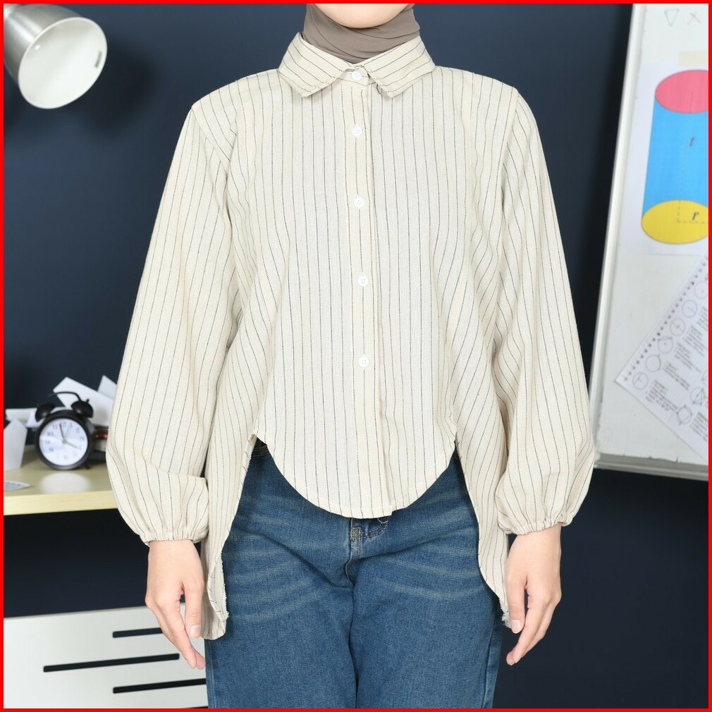 Mybamus Anaya Kemeja Linen Bulu Kuda Salur Stripe Lengan Panjang Atasan Wanita Kekinian