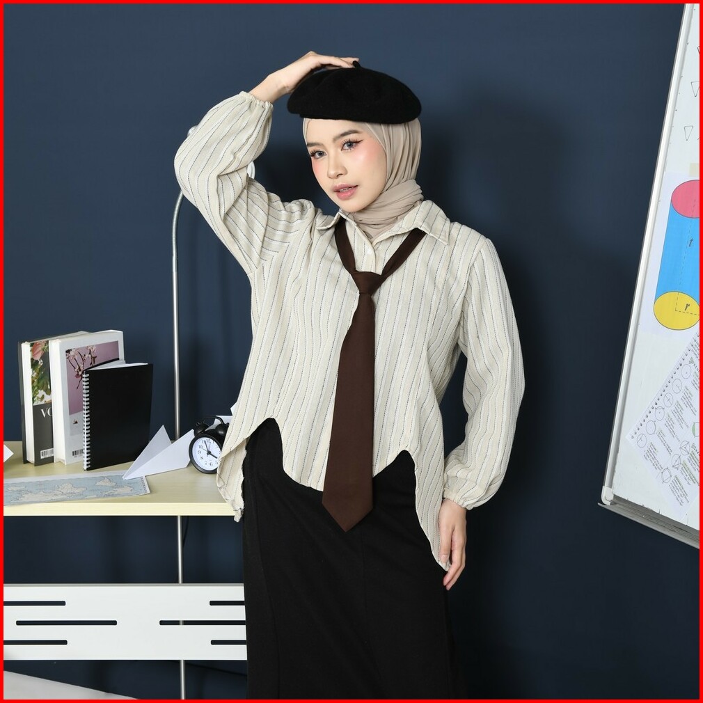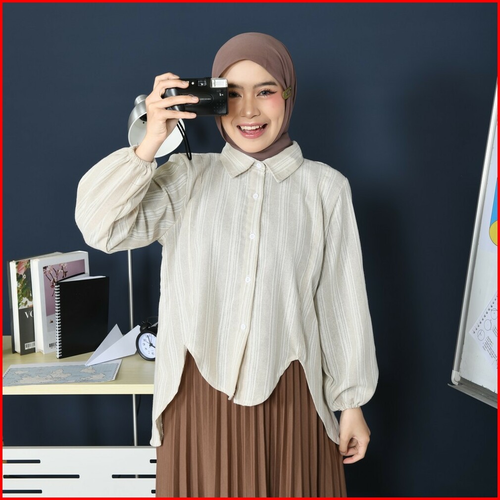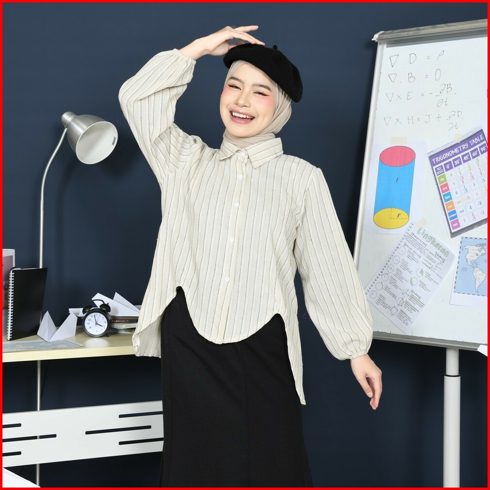 Mybamus Anaya Kemeja Linen Bulu Kuda Salur Stripe Lengan Panjang Atasan Wanita Kekinian