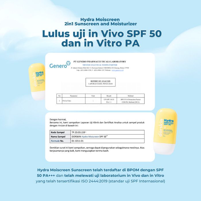 SPF PA CERTIFIED Dorskin Hydra Moiscreen SPF 50 PA+++ - Acne Friendly Sunscreen Moisturizer